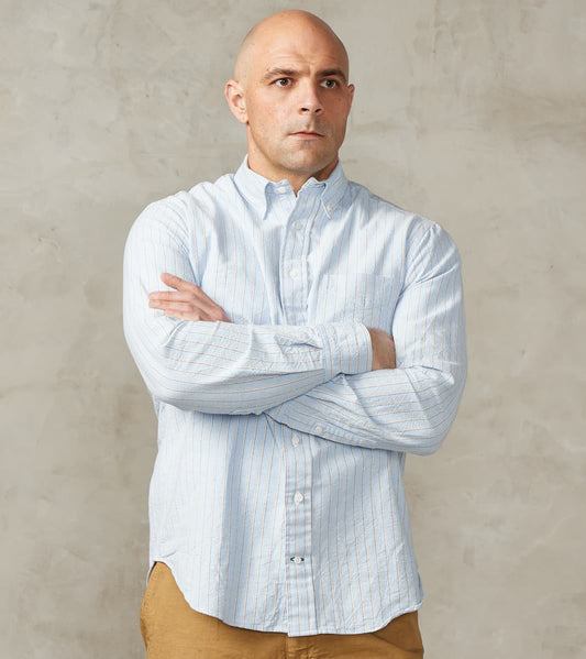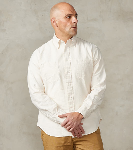 To start the season with our core shirting specialist collaborator, we present wardrobe staples destined for heavy rotation thanks to their vintage-inspired qualities that make them highly versatile. Gitman collaborated closely with its partner mill in Japan to develop an Oxford cloth that reflects Amekaji’s nod to American workwear. Thick slub yarns create an irregularly tensioned plain weave, while specialized pre-production wash treatments produce a crisp yet naturally crinkled fabric with a lived-in feel. Offered in our exclusive neck sizing for a perfect off-the-rack fit, these shirts include collaborative details from solid Chalk and Denim Blue Camper styles to a fresh yarn-dyed triple Stripe in White and Blue, all featuring our modern, shortened collar configuration. Each Gitman x Division Road shirt becomes an essential base layer for outfits that transition smoothly across different styles and settings.