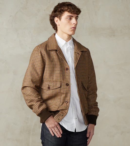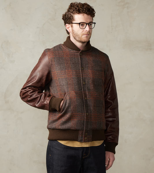 Varsity Jacket - Fox Brothers® Amber Brown Windowpane Tweed & Antique Brandy Leather