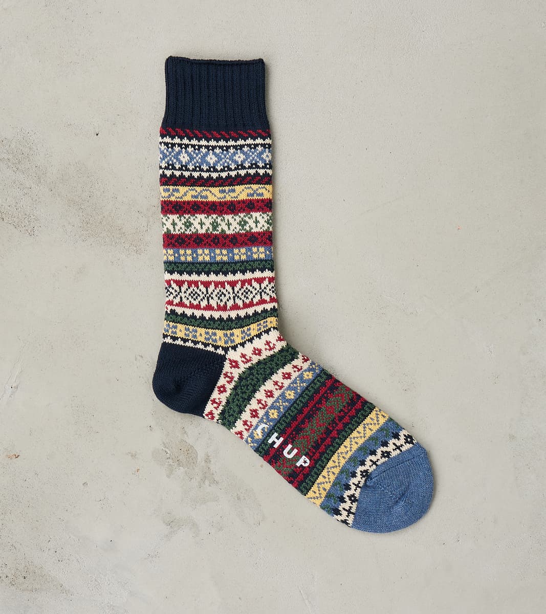 The Cotswolds Sock in Ink Blue by Chup is inspired by the landscape and iconic village architecture of South West England, represented in traditional knitting motifs common to the region and Northern Europe. To highlight the importance of architecture in relation to the area's rivers and meadows, this original design pays homage to the environment through the use of repeating patterns. With a storied history and balanced palette of grass green, river blue, fire red, lamplight yellow, charcoal, and navy blue, these sock patterns will bring reverence and character to the foundation of your style rotations. Produced in Japan with meticulous care on vintage stocking-frame machines, each sock features single-knit construction. For comfort, durability, and breathability, these socks use a combed cotton yarn spun with minimal nylon threads, providing an optimal blend of natural and synthetic fibers for footwear basics that are soft, versatile, and odor-resistant. Crafted to collectible quality, Chup Socks are artisan-produced and truly unique accompaniments to your hand-grade footwear, making a Chup not just a sock but an artful luxury heritage accessory.