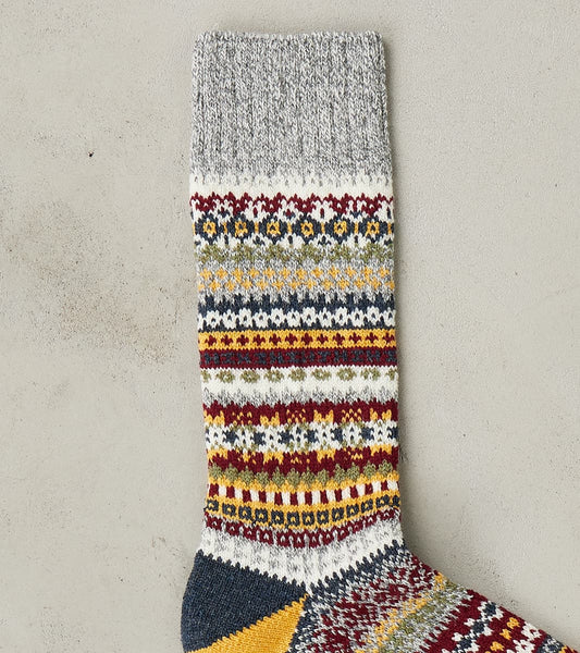 Begun in Tokyo with one desk and a single telephone over 25 years ago, Glen Clyde Inc. worked to become expert sock manufacturers by ensuring the utmost quality in production with unique designs. They created CHUP, "Classical Human's Universal Peace," to allow for the production of exceptionally designed folkloric and indigenous-inspired pieces that incorporate patterns and motifs from global cultures. The process of making socks by utilizing a stocking frame machine and a rare hand linking machine keeps the production old world and limited. Implementing...