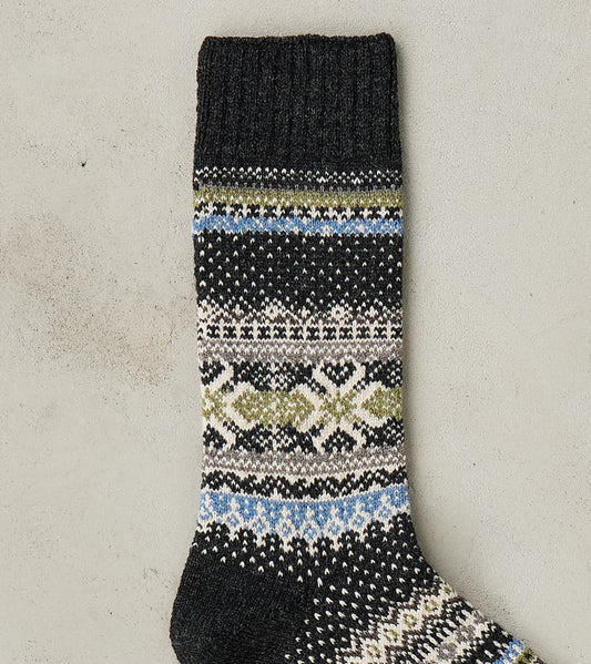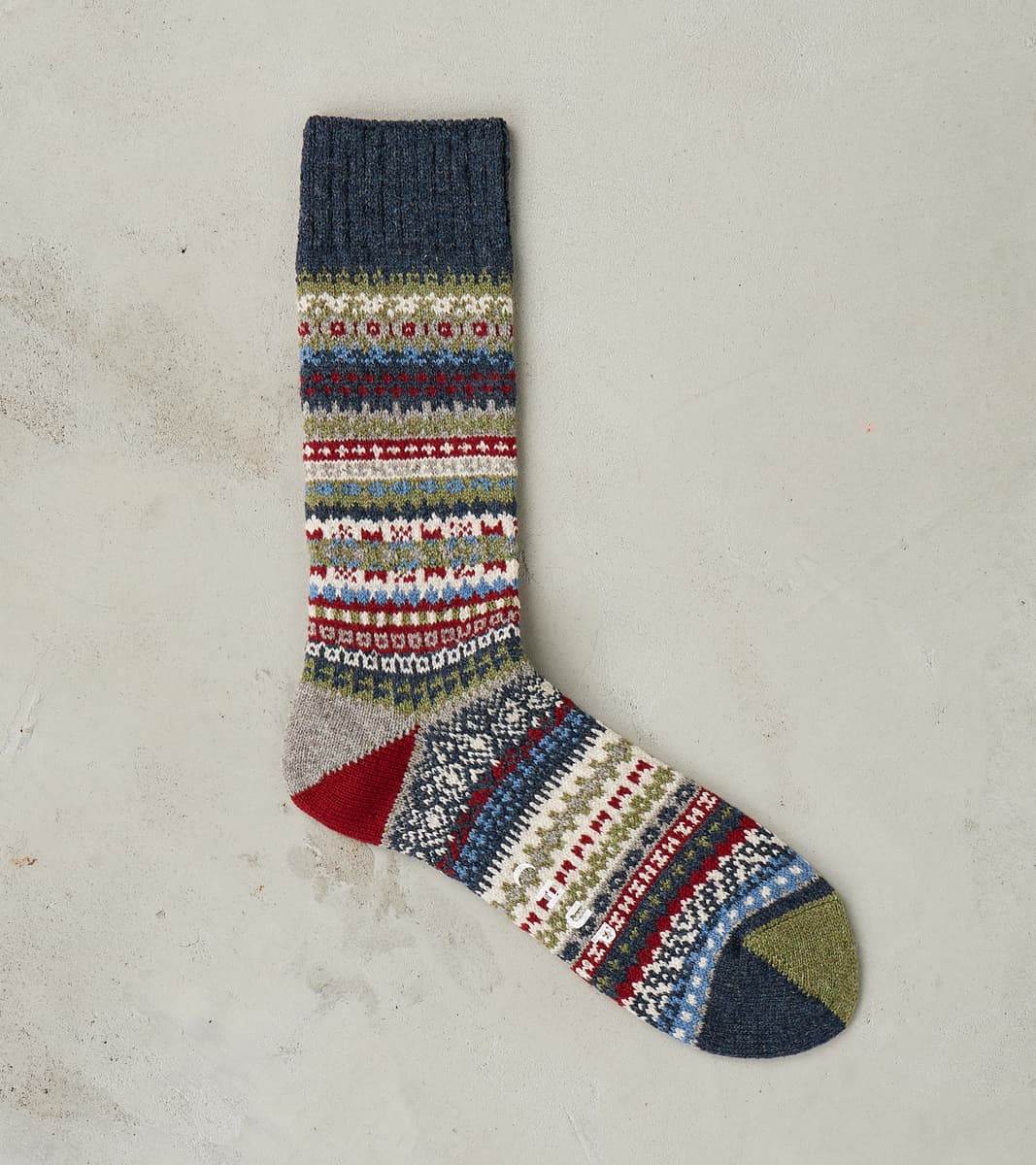The Portmeirion Sock in Indigo by Chup is inspired by the landscape and village architecture of an iconic Welsh village, represented in traditional knitting motifs common to the region and Northern Europe. To highlight the importance of nature and architecture in relation to the dramatic seascape of the area, this original design pays homage to the environment through repeat patterns. With a storied history and balanced palette of sage green, sky blue, brick red, cloud white, and indigo blue, these sock patterns will bring reverence and character to the foundation of your style rotations. Produced in Japan with meticulous care on vintage stocking frame machines, each sock features a single-knit construction. For durability, softness, and natural temperature regulation, they feature a washable Merino wool blend yarn that provides breathable insulation with the comfort of a dense pile. Crafted to collectible quality, Chup Socks are artisan-produced and truly unique accompaniments to your hand-grade footwear, making a Chup not just a sock but an artful luxury heritage accessory.