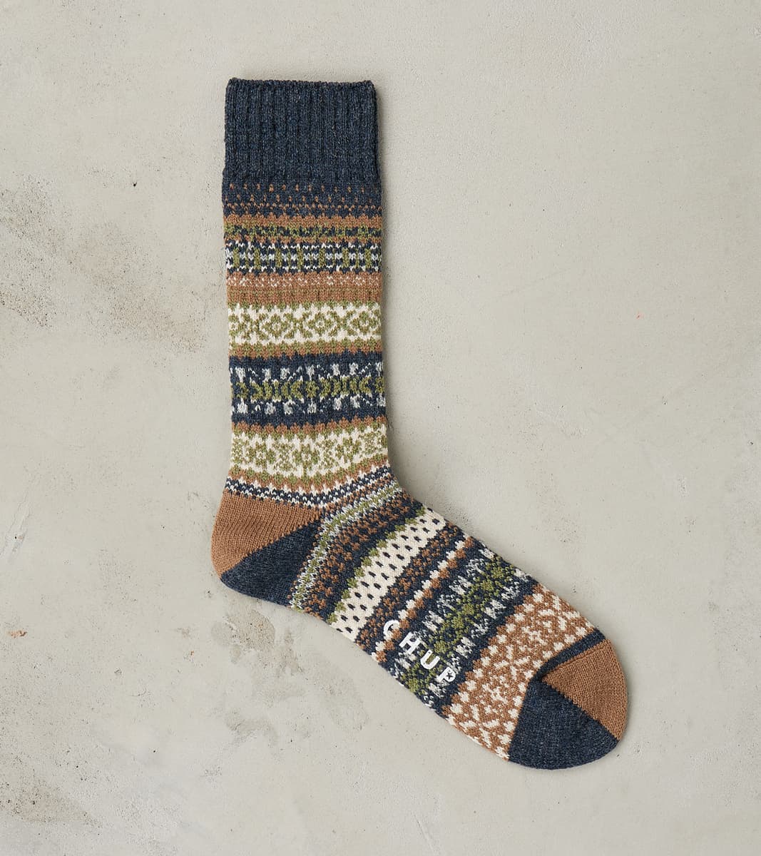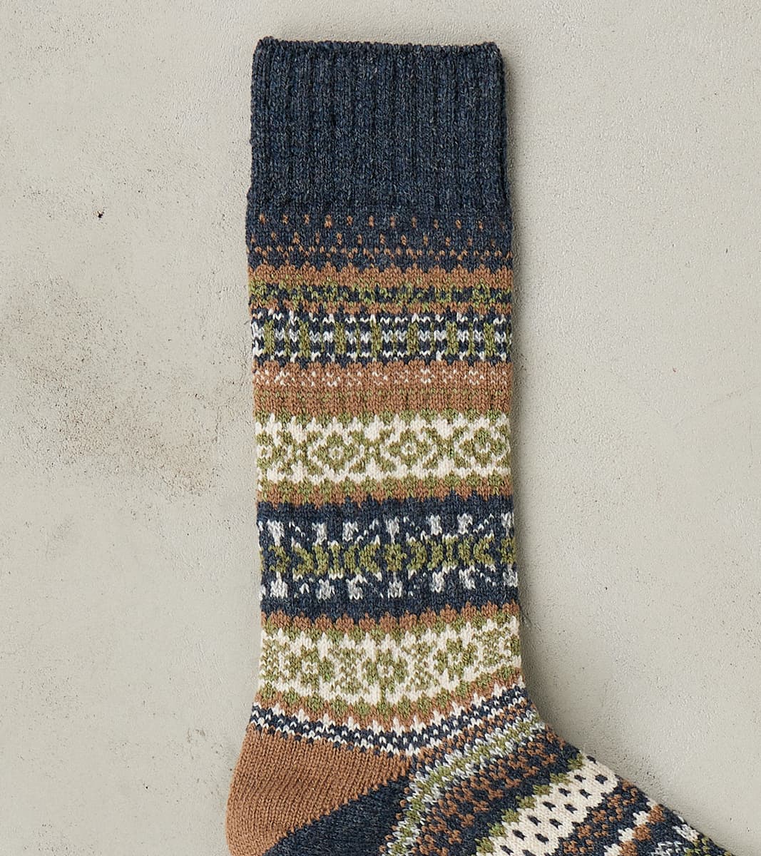 The Sulata Sock in Indigo by Chup is inspired by the seasonal change in Ireland from winter to spring, represented in traditional Celtic knitting motifs common to the region. To highlight the visual effect of melting snow and layered foliage on the hills and forests, this original design pays homage to the environment through repeated patterns. With a storied history and balanced palette of pine green, beach brown, cloud grey, and indigo, these sock patterns will bring reverence and character to the foundation of your style rotations. Produced in Japan with meticulous care on vintage stocking-frame machines, each sock features single-knit construction. For durability, softness, and natural temperature regulation, they feature a washable Merino wool blend yarn that provides breathable insulation with the comfort of a dense pile. Crafted to collectible quality, Chup Socks are artisan-produced and truly unique accompaniments to your hand-grade footwear, making a Chup not just a sock but an artful luxury heritage accessory.