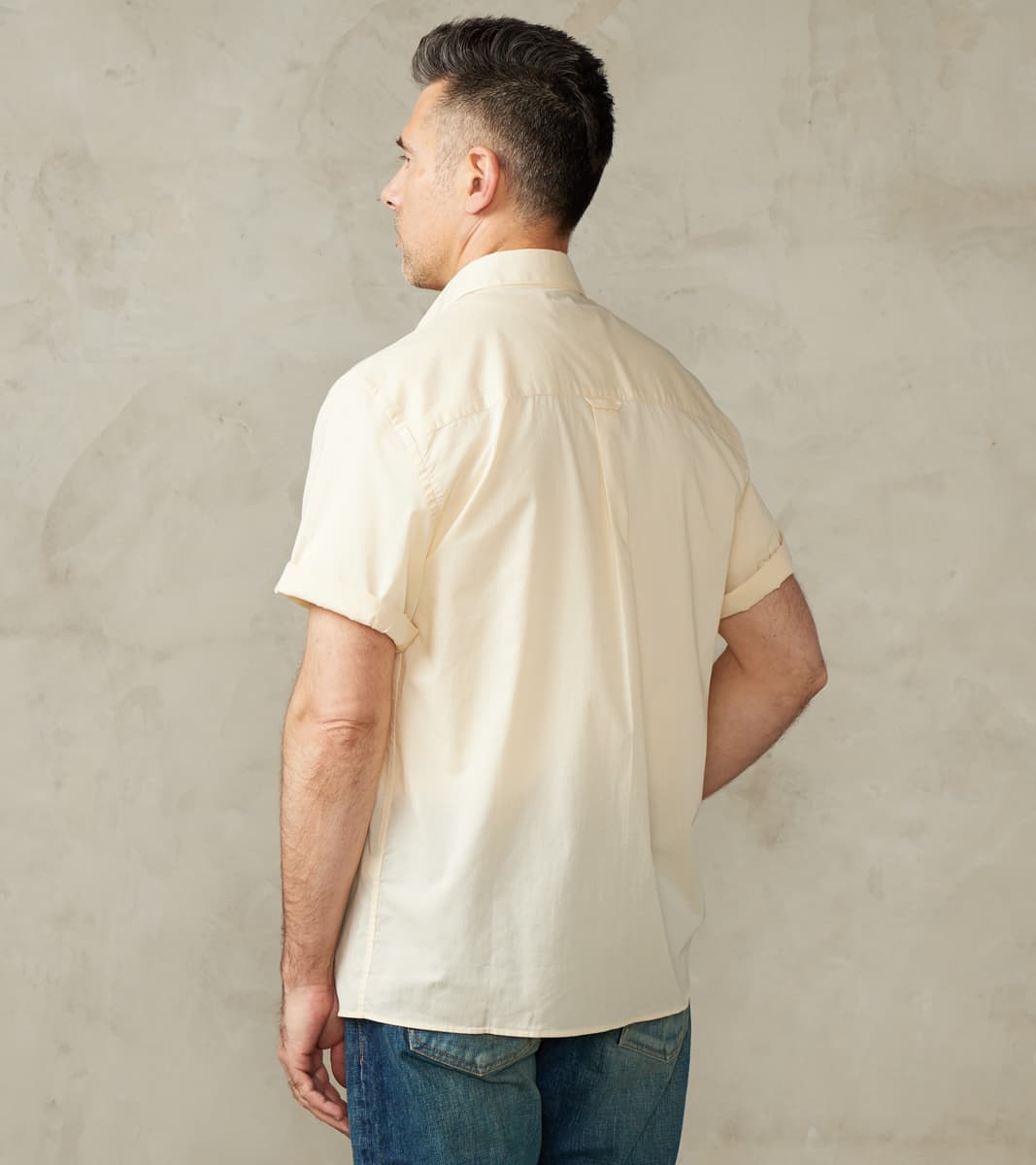 The De Bonne Facture Cream English Washed Cotton Voile Painter's Short Sleeve Shirt is part of the soft tailoring collection inspired by the palette, textures, and foliage of the Mediterranean, reflecting the human connection to the spiritual through nature. With a focus on sustainability and connecting the garment to the landscape, this Painter's Short Sleeve Shirt is made from 100% US-grown cotton with finely spun yarns, milled in England to a lightweight, silky, and luxurious voile cloth that's washed for softness and drape for a beautiful spring-summer shirting piece. With a minimalist design approach inspired by vintage fashion, each element carries thematic consistency and purpose with details like a point collar, set-in short sleeves, pleated patch chest pockets, and a blocked silhouette with a box pleat back and square hem that enhances movement and drape, completed with corozo nut buttons for the front placket and felled seams throughout. Paying homage to a vintage artist shirt from the 1950s, this piece is atelier made in Fanzeres, Portugal, by shirting specialist Mr. João Nuno Luz, which provides the soul of fine regional craftsmanship. When combined with the authenticity of fully traceable natural materials, the yield is an artisan piece for the timeless wardrobe of the contemporary fashion connoisseur. Featuring premium materials and production with an historical approach to a forward-focused look, the Cream Washed Voile Painter's Shirt will add polished execution to any casual luxury ensemble for the pool, event, or excursion.