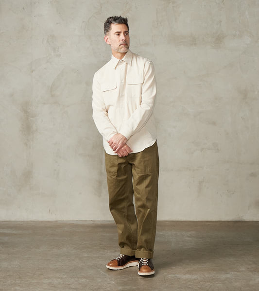 De Bonne Facture Outerwear generally runs large and is based on European tailoring sizing. For the Overshirt, we suggest using your measured chest/suiting size and adding (6) for a tailored fit, or adding (8) for a classic fit and to accommodate heavy layering. Alternatively, take the smaller of your range in common US Alpha sizing for a classic fit, or an additional size down for a tailored fit.