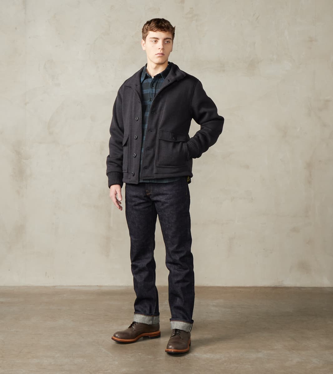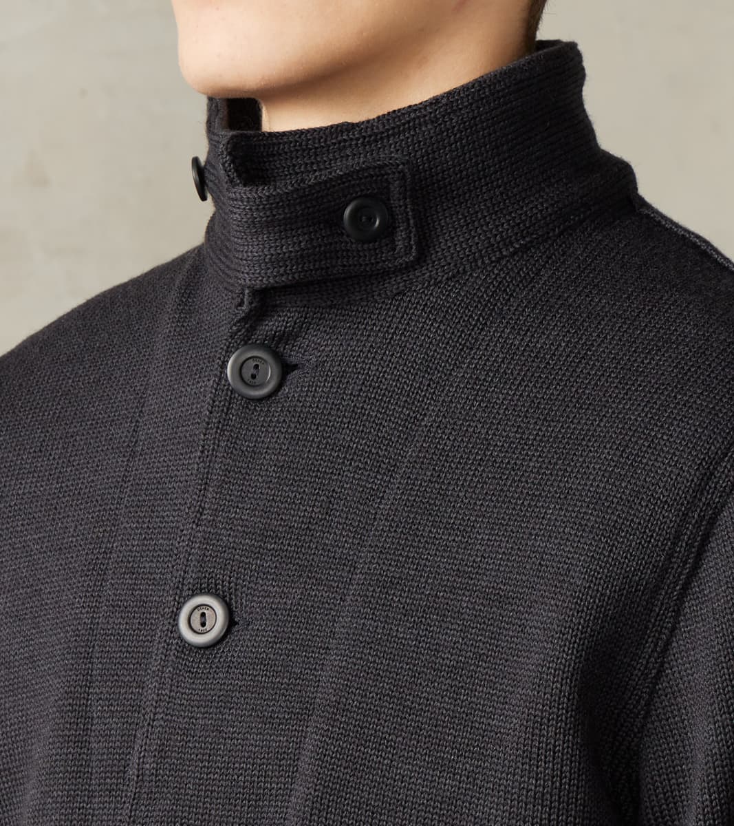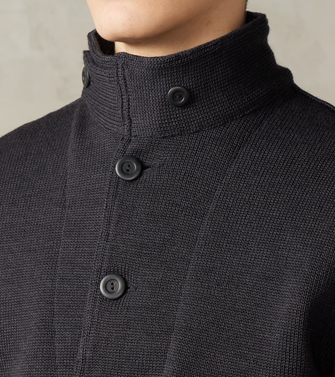 The Dehen 1920 Lined Submariner Sweater Coat in Dark Charcoal is inspired by pre-WWII U.S. military maritime outerwear garments that William L. Dehen would have been issued as a Submariner in the U.S. Navy. This evolved knit jacket is equally appropriate in both urban environments and on the battlefield, made in an outerwear-appropriate four-end heavyweight worsted virgin wool that is knit entirely in-house on vintage machines utilized since the 1950s. In what has become a timeless addition to our Dehen line-up of hand-crafted outerwear offerings using the best materials available, this piece improves upon the original with a fully satin lined body and sleeves, tonal corozo buttons on the front placket, flap front patch pockets designed for accompaniments, and lined side entry hand pockets. This knit jacket will impress those seeking authentic American workmanship with a buttoned collar latch, interior chest pocket, and locker loop, finished with knit worsted wool fold-back cuffs made with Dehen’s own 1940s weaving machine. The Submariner Knit Jacket is a perfected essential, at home downtown or on deck in fall through spring, informed by the past and built for voyages ahead.