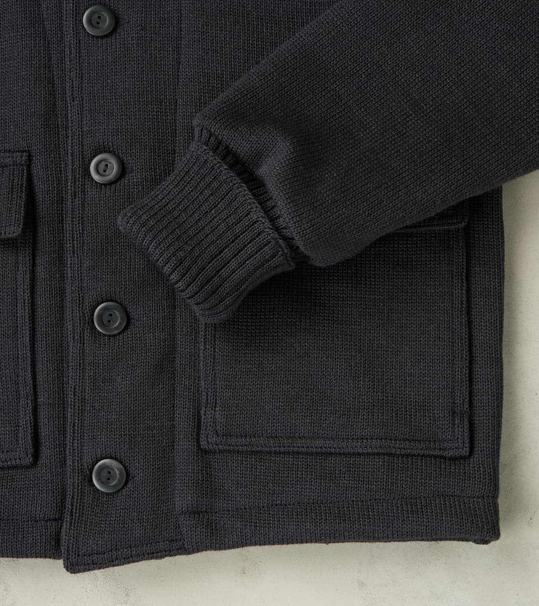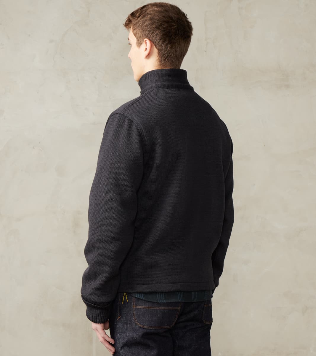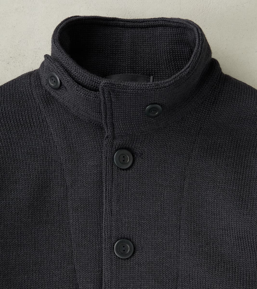 The Dehen 1920 Lined Submariner Sweater Coat in Dark Charcoal is inspired by pre-WWII U.S. military maritime outerwear garments that William L. Dehen would have been issued as a Submariner in the U.S. Navy. This evolved knit jacket is equally appropriate in both urban environments and on the battlefield, made in an outerwear-appropriate four-end heavyweight worsted virgin wool that is knit entirely in-house on vintage machines utilized since the 1950s. In what has become a timeless addition to our Dehen line-up of hand-crafted outerwear offerings using the best materials available, this piece improves upon the original with a fully satin lined body and sleeves, tonal corozo buttons on the front placket, flap front patch pockets designed for accompaniments, and lined side entry hand pockets. This knit jacket will impress those seeking authentic American workmanship with a buttoned collar latch, interior chest pocket, and locker loop, finished with knit worsted wool fold-back cuffs made with Dehen’s own 1940s weaving machine. The Submariner Knit Jacket is a perfected essential, at home downtown or on deck in fall through spring, informed by the past and built for voyages ahead.