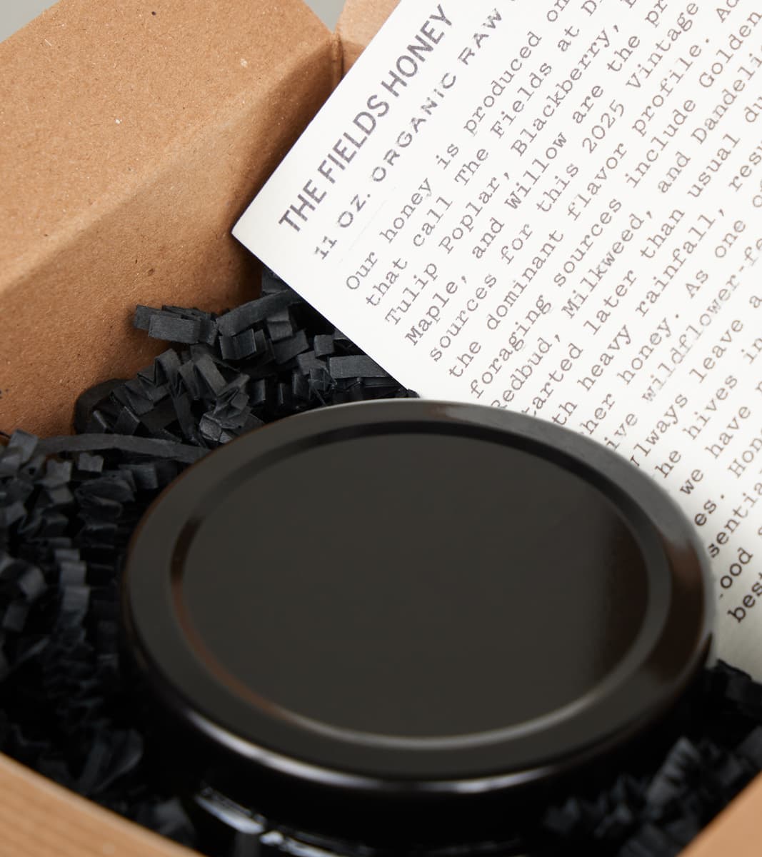 The Fields Honey is organic, raw, and unfiltered, derived from indigenous flowering trees and our converted pollinator habitats of native wildflower meadows by bees that call The Fields at Division Road home. This 2025 vintage marks our third annual harvest and production, driven by a passion for preservation, restoration, and conservation. The Fields 11 oz. Raw and Unfiltered 2025 Vintage is comprised of Tulip Poplar, Blackberry, Black Locust, Maple, and Willow nectar as the dominant sources and includes under-notes of Golden Asters, Redbud, Milkweed, and Dandelion. This year's long and moist spring delayed the bees' foraging and harvesting until later in the summer. This resulted in a dark, richer honey with earthy and spicy notes that complement the floral flavors. As one of the only 100% naturally foraged, native wildflower-fed apiaries in the state, we always leave a substantial amount of honey in the hives instead of scraping them bare, and we have never used substitute feed in our hives. Honey and pollen are packed with essential nutrients and serve as the primary food source for honeybees, giving them the best chance for long-term health. The honey is presented in a glass jar with actual-size pen and ink artwork by Keana, exclusive to this vintage and inspired by the wildflower foliage that supports the on-site apiary at The Fields. Each jar includes an informational card with tasting notes related to the vintage and is individually packaged in pinstripe kraft boxes. This honey delivers an authentic taste of the fields we have restored into an ecological wonderland and could be the best honey you've ever tasted. It is produced from a labor of love for nature and preservation.