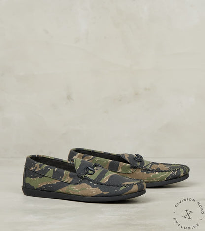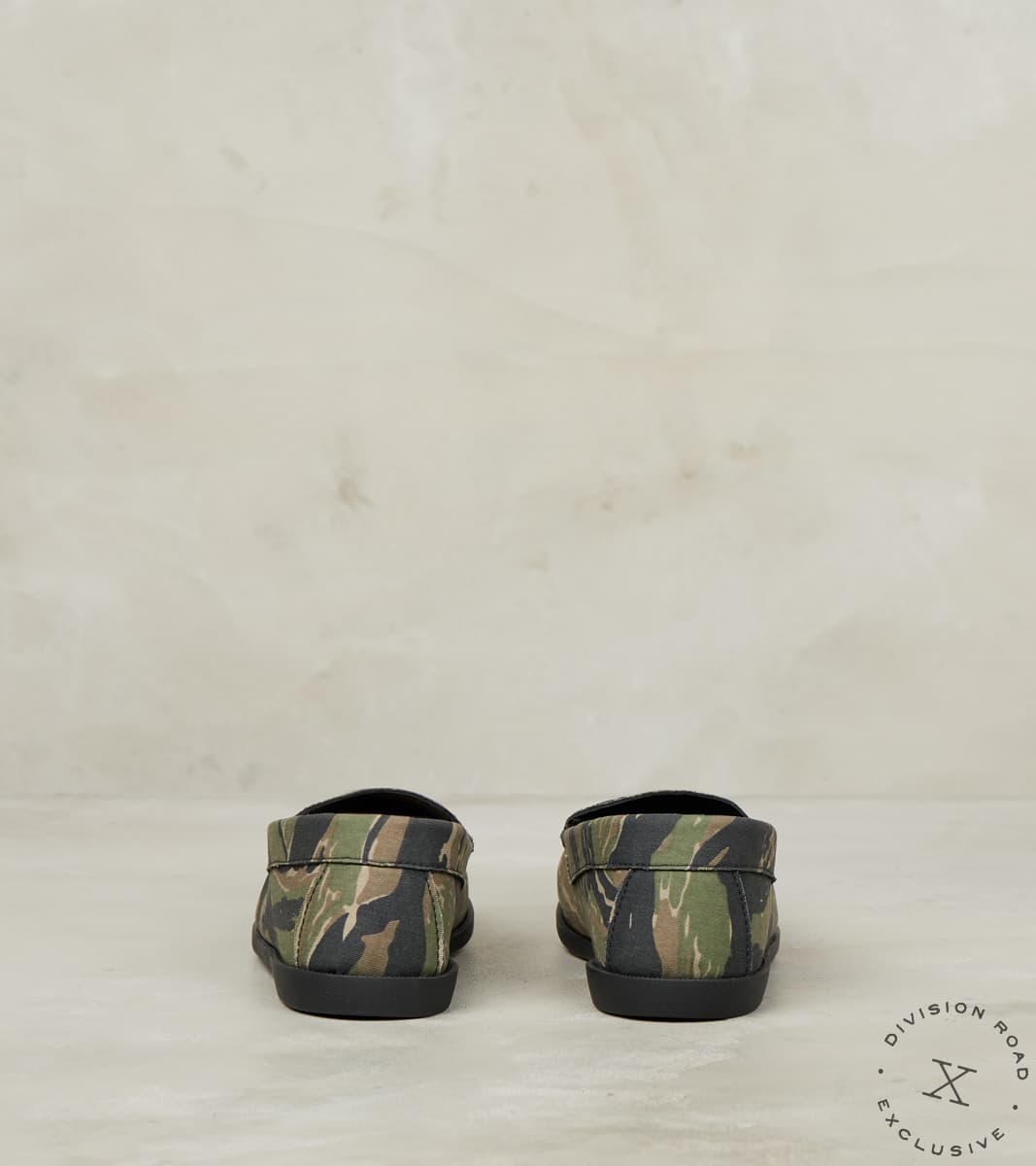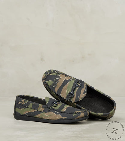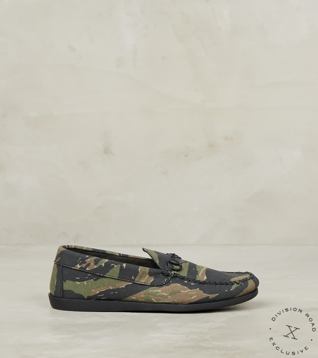 The EasyMoc x Division Road Deadstock Tiger Stripe Camo Horse Bit Camp Moc is a fully functional moccasin shoe designed in collaboration with founder Greg Cordeiro. Made to serve in daily duty for the style-savvy looking to represent workshop craft, this shoe highlights Maine’s finest traditions of hand-lasted, hand-sewn, true moccasin production. This Division Road make-up is made with deadstock from the 1960s original camouflage milled in Japan for the South Vietnamese Armed Forces and later adopted by the American Special Forces during the Vietnam War. The fully leather-lined, double vamp upper is hand-lasted on an adapted vintage moccasin boot form for an accommodating fit that allows the moccasin hand-sewn leather construction to mold to the foot. This Camp Moc is complemented with matte gun black horse bit hardware, coordinated with black heavy gauge waxed thread for the moccasin toe, and overcast stitching for a refined make-up suitable for formal and casual occasions. This EasyMoc is assembled for a lifetime of utility using considered elements, including a Leather Ortholite® Comfort Hybrid Footbed for an elevated modern interior and a Blake welted insole to a proportionally balanced black Vibram Camp sole that is flexible, stable, and re-soleable. The Tiger Stripe Camo Horse Bit Camp Moc is made for the design-minded individual seeking stylish, authentic craftsmanship to create inspired, heritage, or modern outfits.
