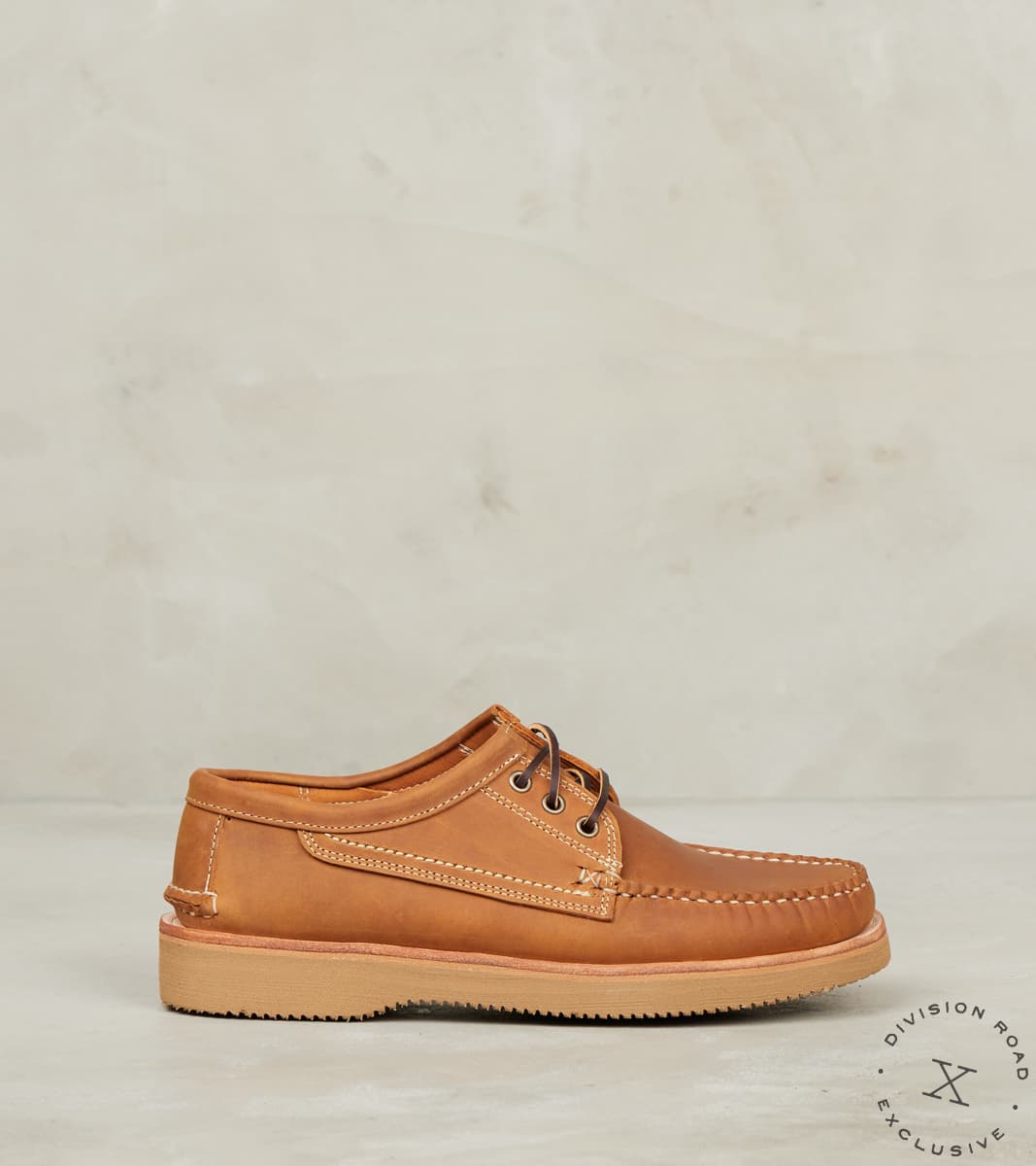 The EasyMoc x Division Road Toffee Crazy Horse Rambler 3-Eye Moc is a fully functional derby shoe designed in collaboration with founder Greg Cordeiro. Made to serve in daily duty for the style-savvy looking to represent workshop craft, this shoe highlights Maine’s finest traditions of hand-lasted, hand-sewn, true moccasin production. This Division Road make-up is made with Crazy Horse from Seidel Tannery, which uses full-weight steer hides that are heavily stuffed using an exclusive recipe of oil and wax to yield a flexible and durable leather with a buffed grain for a matte finish that allows the ingredients to come to the surface for protection and pull-up. Coming in an aniline finished, undyed crust Toffee Tan color, this leather will patina beautifully for an aged finish that goes from matte lows to oily highs in various shades of brown. The fully leather-lined, double vamp upper is hand-lasted on an adapted vintage moccasin boot form for an accommodating fit that allows the moccasin hand-sewn leather construction to mold to the foot. This shoe pattern is complemented and completed with a full collar for a locked fit below the ankle, a reinforced quarter with a unique heavy-duty sail stitch, natural upper thread including the heavy gauge waxed moccasin toe, heel, and overcast stitching, and is completed with tonal antique brass eyelets for a make-up refined for the city and well-equipped to explore the woods. The Rambler Moc is assembled for a lifetime of utility using considered elements, including an Ortholite® Comfort Hybrid Recycled Footbed for a modern interior and a Blake welted insole to a natural leather midsole for full re-craftability. For proportional balance and a stable surface, the Rambler Moc is completed with an outsole stitched midsole atop a Vibram 2060 industrial walking sole ideal for stable striding from concrete to campsite in a workman-made moccasin that styles up to your best heritage or modern ensembles.