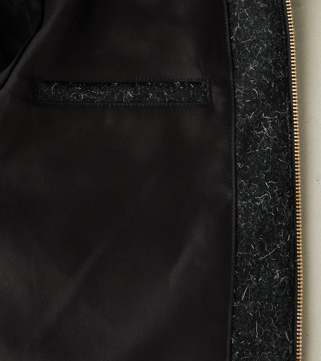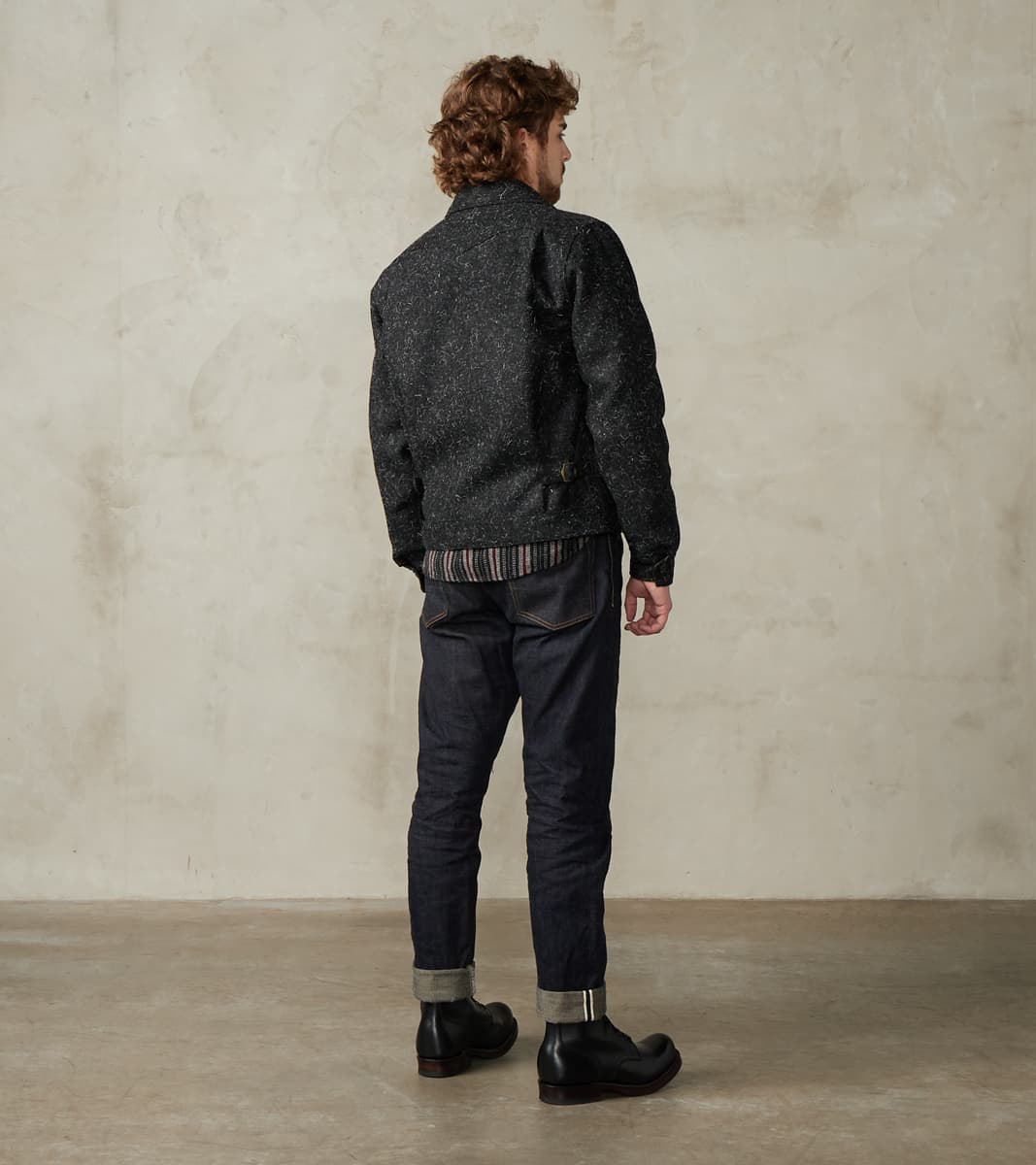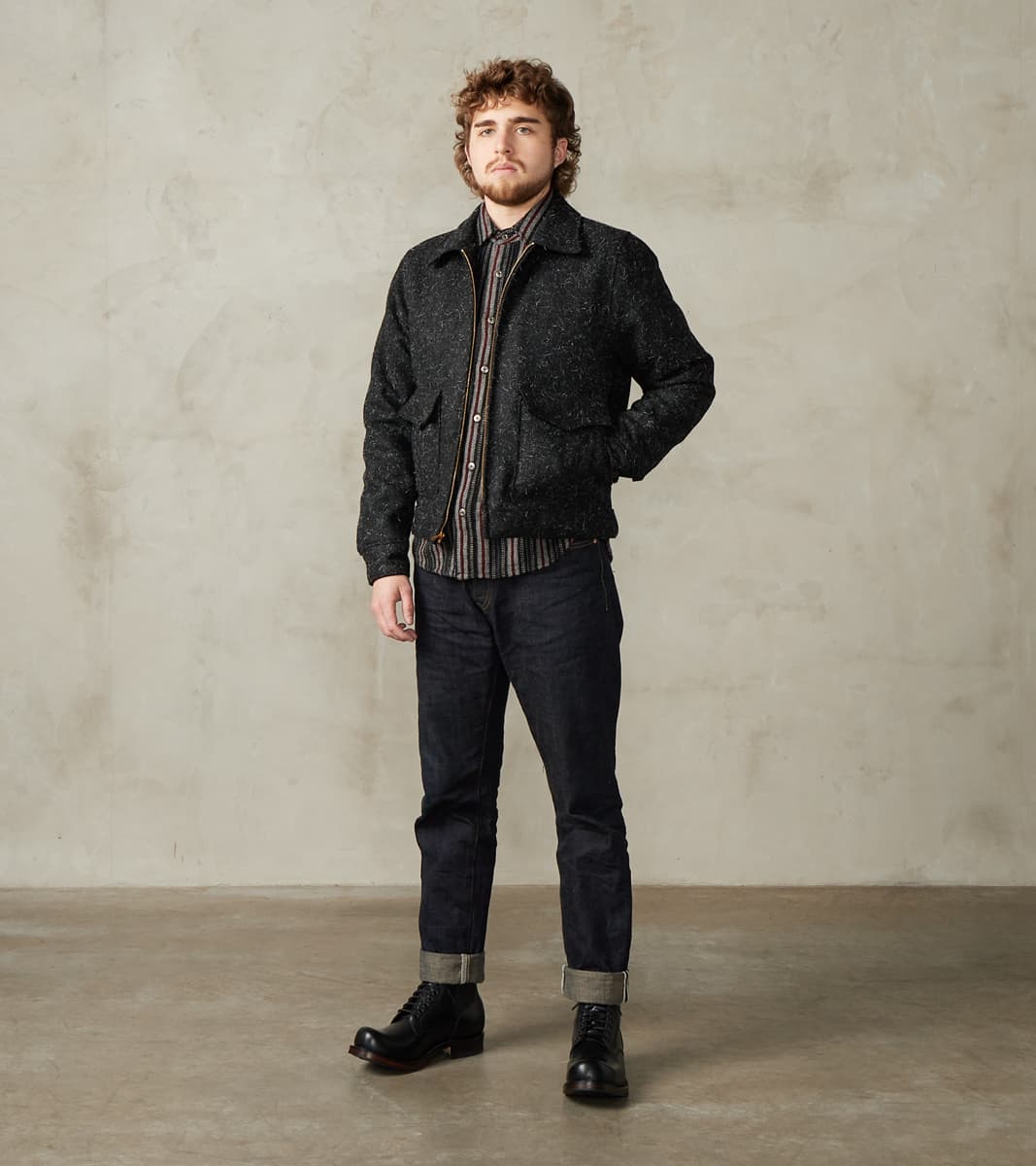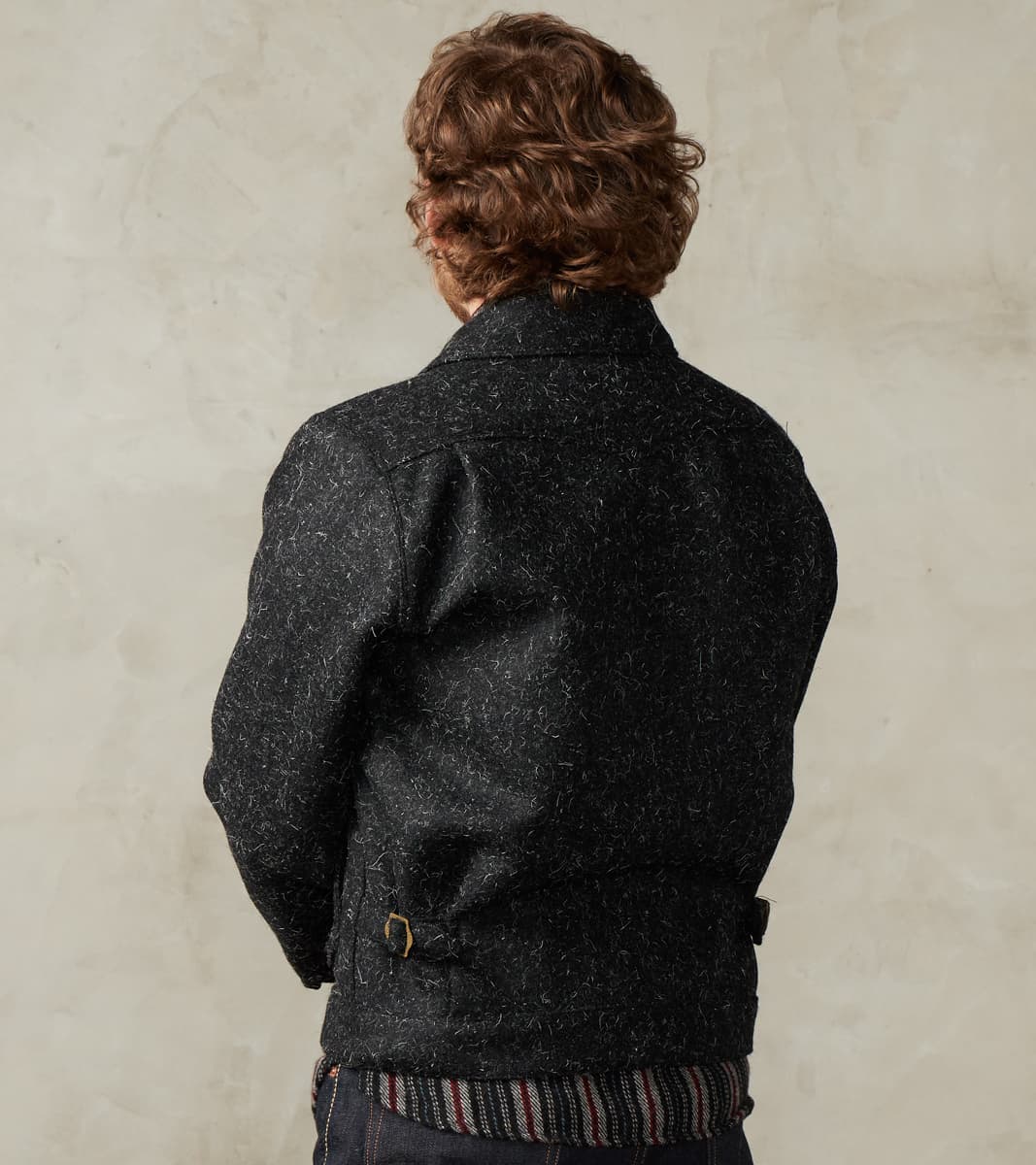 The Freenote Cloth Black Wool Alcorn Jacket combines elements of military and motorcycle outerwear garments in a new-heritage version designed to be a dutiful and stylish fall through spring staple. This Alcorn features a 14 oz. Japanese Wool Cloth loomed as a plain weave using rustic sheer kemp fibers with a textured natural grey speckled on a black and charcoal field for a versatile and unique palette. This 100% wool cloth replicates high-pile vintage blanket cloths popular in Western workwear known for enhanced durability, insulation, and flexibility. A new classic from Freenote, the Alcorn Jacket is inspired by bomber and riding jackets from the 1940s, designed in a tailored fit with well-considered and custom details like a Universal brass zipped front placket, concealed snap flap front patch pockets with side hand entry and cuffs that are trimmed in Italian corduroy, and a curved back yoke with pleated shoulders and an adjustable hem with back waist tabs and custom brass buckles. Staying true to heritage production details and evolved design elements, this jacket features a Japanese cotton/rayon blend moleskin body lining and rayon-lined sleeves, an internal chest pocket, and is constructed with felled seams throughout. The Freenote Cloth Wool Alcorn Jacket is a modern take on Western workwear made in the United States with old-world quality — sure to become a future heirloom for the vintage-inspired enthusiast seeking something new.
