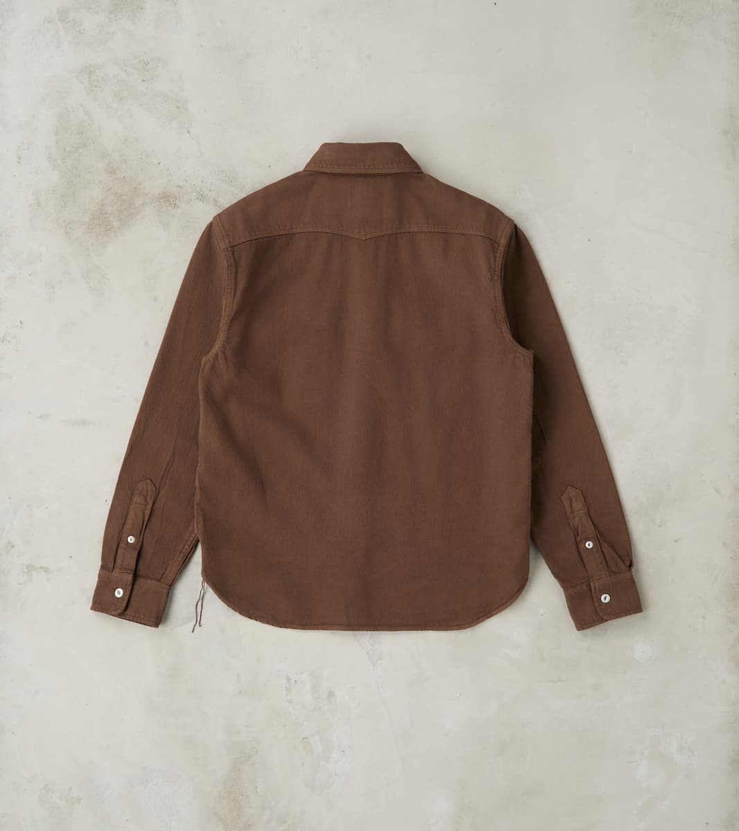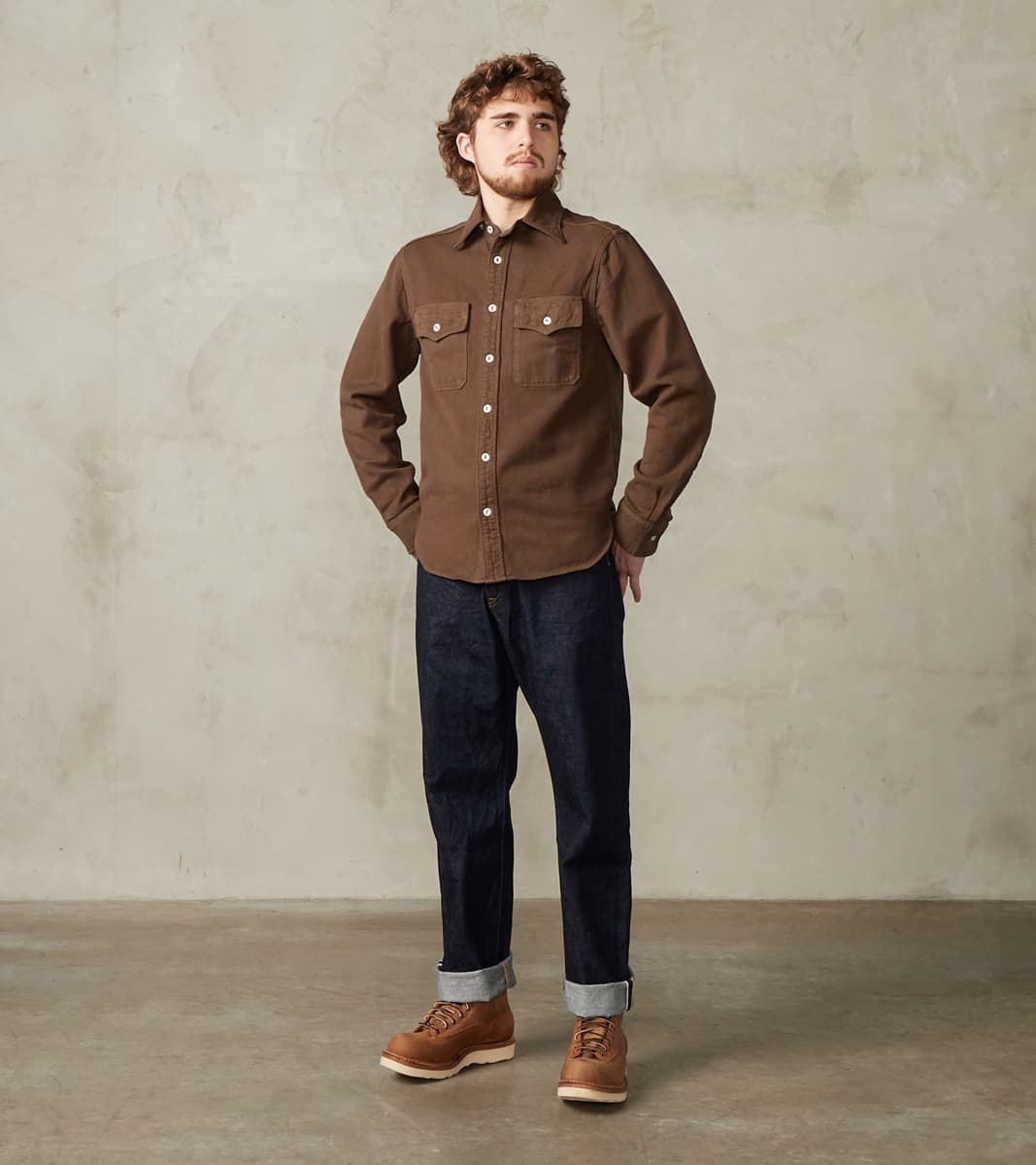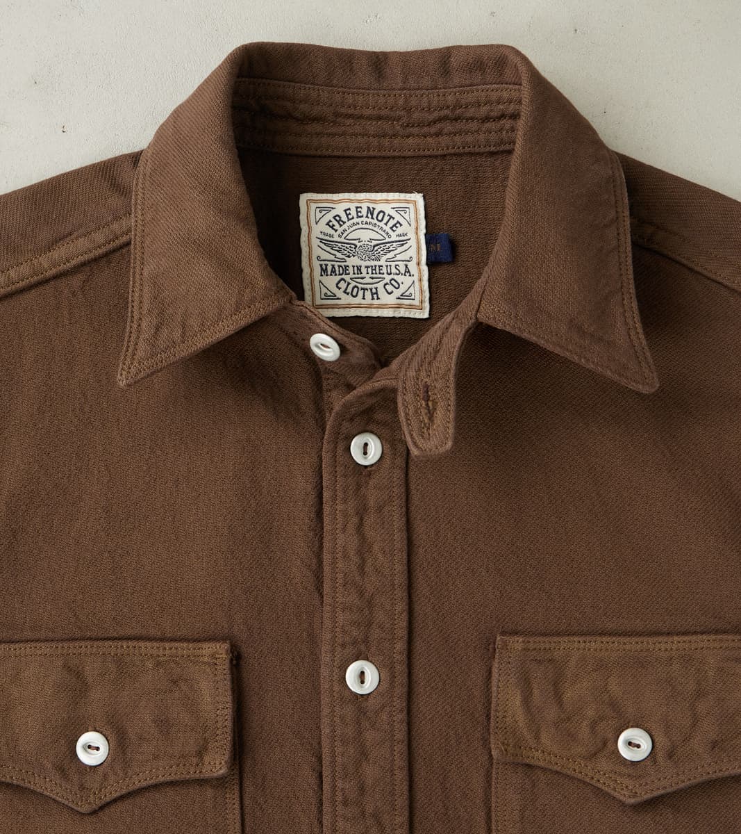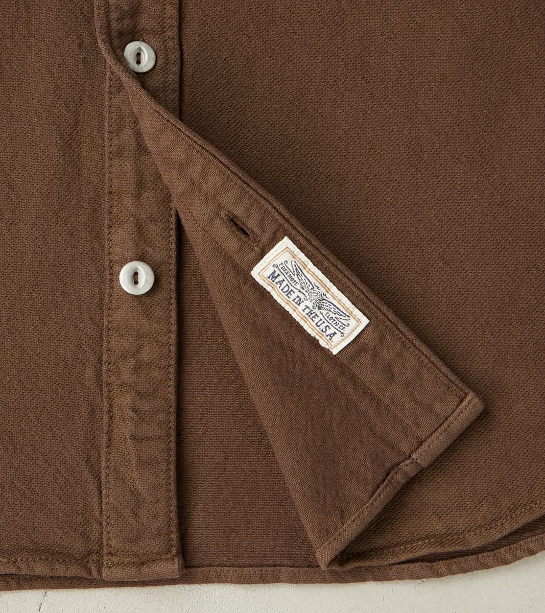 The Freenote Cloth Scout USA Twill Shirt in Cedar is a medium-weight piece produced from a US milled cloth using 100% US Grown Cotton for an overshirt or casual button down appropriate as an all-season style staple. Using the Scout Shirt pattern, this piece is perfectly proportioned and made to be worn untucked for vintage-styled flavor, hallmarking utility and field shirts worn in the outdoors for generations. This USA Twill is piece-dyed to a saturated cedar brown and heavily garment-washed for a softened, worn-in feel that will only improve with age. Staying true to heritage production details and evolved design elements, this shirt features a point collar, buttoned throat latch, curved back yoke panel, buttoned patch chest pockets with curved flaps, and pleated button cuffs. It is completed with Japanese metal fisheye buttons, felled seams, bartack reinforcements, and chainstitched construction throughout with inseam run-off. The Freenote Cloth Scout Twill Shirt is a modern take on Western workwear made in the United States with old-world quality — sure to become a future heirloom for the vintage-inspired enthusiast seeking something new.