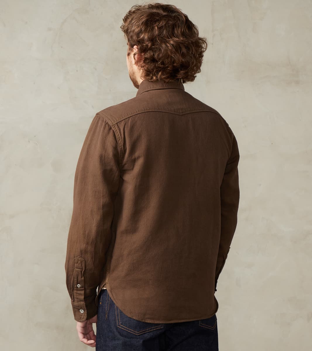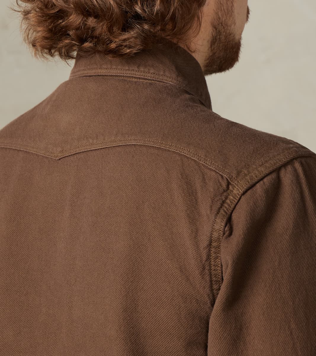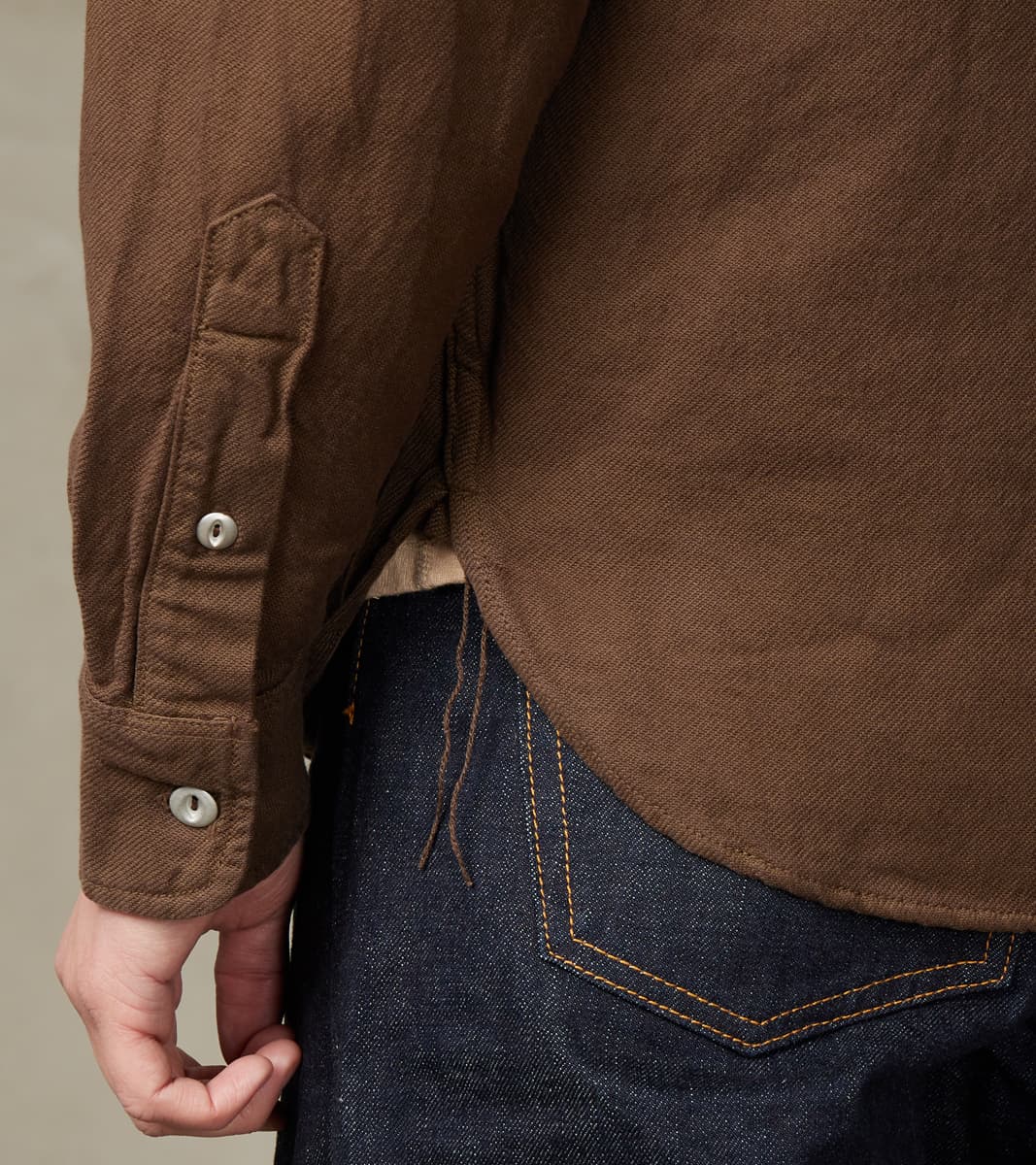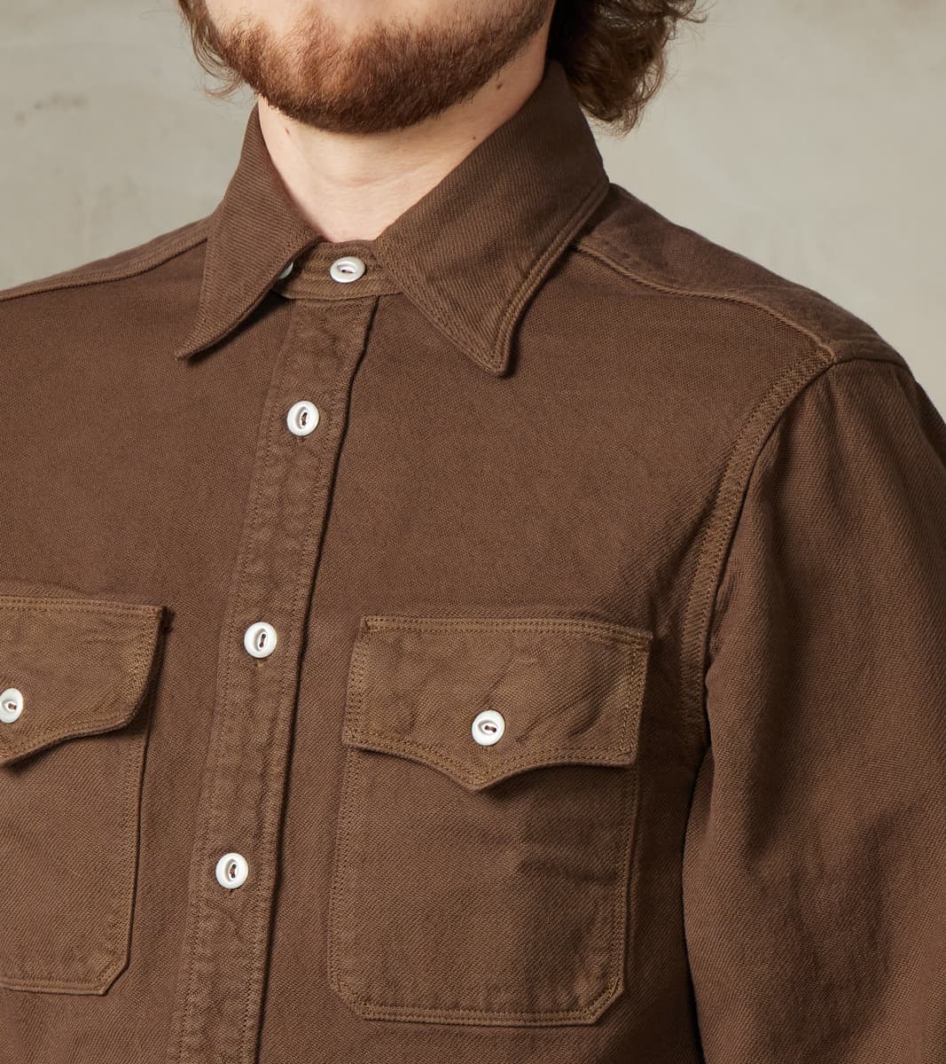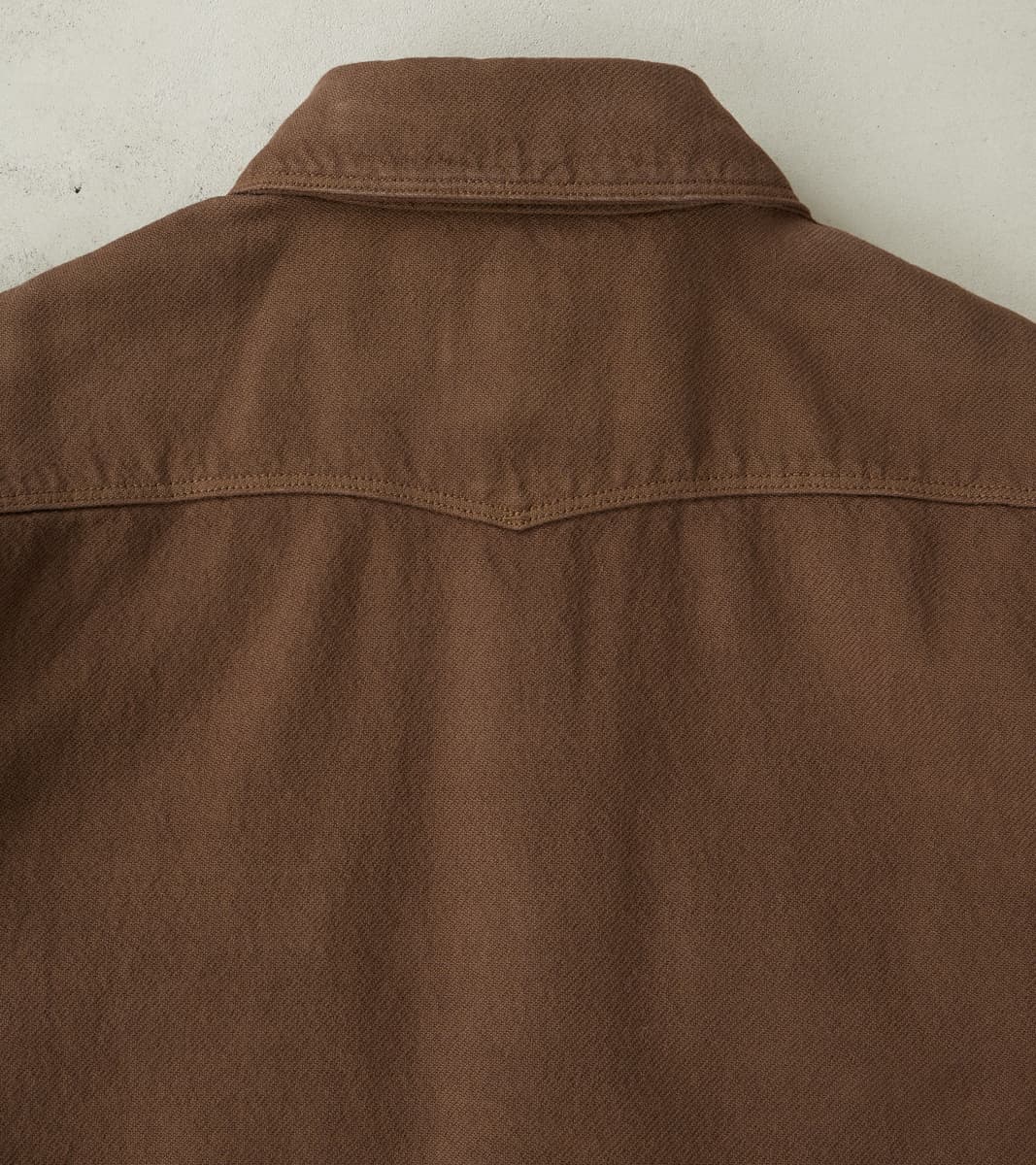 The Freenote Cloth Scout USA Twill Shirt in Cedar is a medium-weight piece produced from a US milled cloth using 100% US Grown Cotton for an overshirt or casual button down appropriate as an all-season style staple. Using the Scout Shirt pattern, this piece is perfectly proportioned and made to be worn untucked for vintage-styled flavor, hallmarking utility and field shirts worn in the outdoors for generations. This USA Twill is piece-dyed to a saturated cedar brown and heavily garment-washed for a softened, worn-in feel that will only improve with age. Staying true to heritage production details and evolved design elements, this shirt features a point collar, buttoned throat latch, curved back yoke panel, buttoned patch chest pockets with curved flaps, and pleated button cuffs. It is completed with Japanese metal fisheye buttons, felled seams, bartack reinforcements, and chainstitched construction throughout with inseam run-off. The Freenote Cloth Scout Twill Shirt is a modern take on Western workwear made in the United States with old-world quality — sure to become a future heirloom for the vintage-inspired enthusiast seeking something new.
