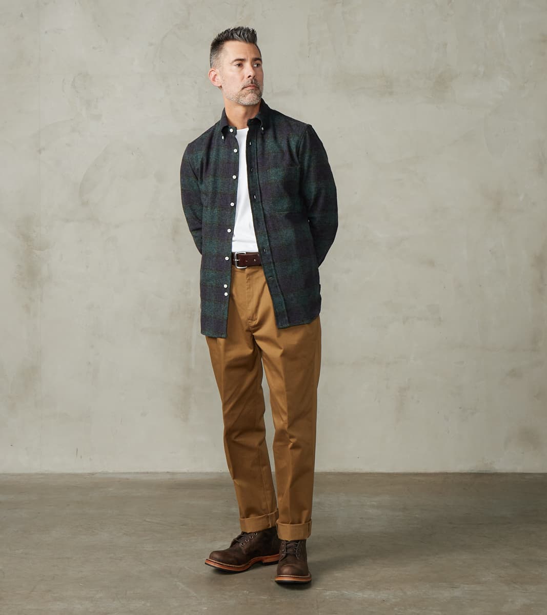 The Japanese Cotton Tweed in Navy from Gitman Vintage is made in a three-season 7.5 oz. heavyweight fabric loomed to have the pattern texture of tweed in a complex English-inspired check using yarn-dyed shades of navy and green. This fabric is produced in Japan from 100% Combed Cotton 2-ply twisted Grandrelle yarns in various colors, creating a natural, irregular pattern. It is subtly brushed to achieve a luxurious, soft, and flexible hand in a hearty woven material. It features Gitman's original details, including the signature button-down collar, chest pocket, chalk buttons, a locker loop, and a final horizontal buttonhole in green thread. This shirt is produced in the modern tailored fit with a moderate hem sweep that styles well tucked or untucked, and an adapted straight cut "just right" for most body types. Gitman Vintage shirts are classic, simple, and original, with a casual sophistication that makes them a standard wardrobe piece for many well-dressed men.