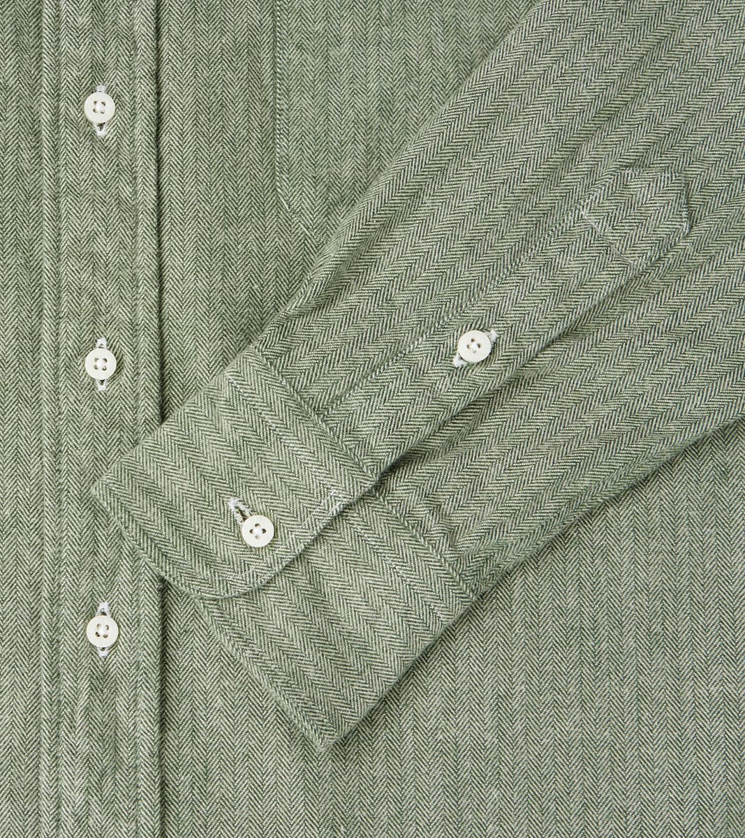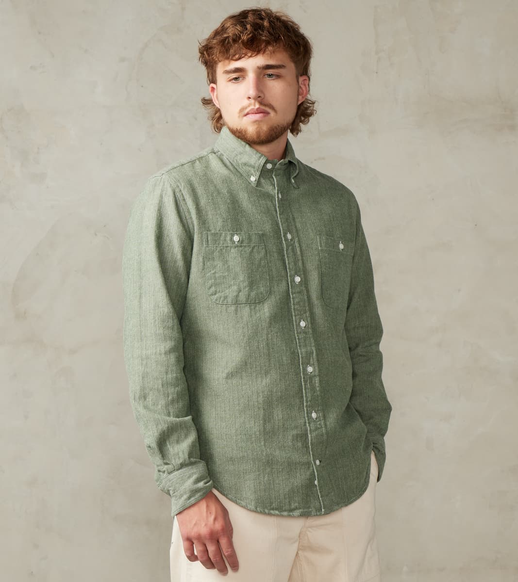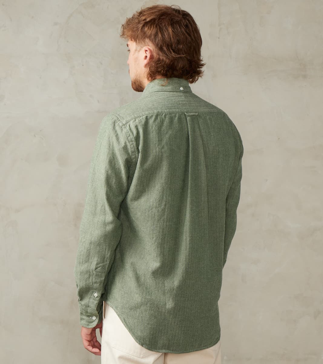 The Shetland Herringbone Flannel in Basil from Gitman Vintage is a Division Road exclusive made in a three-season 6 oz. medium weight 100% Cotton herringbone twill weave that uses tonally shaded yarns to create a subtle textured pattern, resulting in another brilliantly updated, timeless piece. Loomed from fully combed yarns, this cotton tweed has been double-brushed to create a luxurious, soft, and flexible hand in a durable and hearty woven material. This shirt comes with dual buttoned chest pockets, Gitman's signature button-down collar style, and is replete with original details like chalk buttons, a locker loop, and a final horizontal buttonhole in green thread. This shirt is produced in the modern tailored fit with a moderate hem sweep that styles well tucked or untucked and an adapted straight cut "just right" for most body types. Gitman Vintage shirts are classic, simple, original, and have a casual sophistication, making them a standard wardrobe piece for many well-dressed men. We are unique in our offerings of Gitman Vintage by neck sizing for all you gents between alpha sizes; you now have the opportunity for a perfectly fitting Gitman right out of the box.
