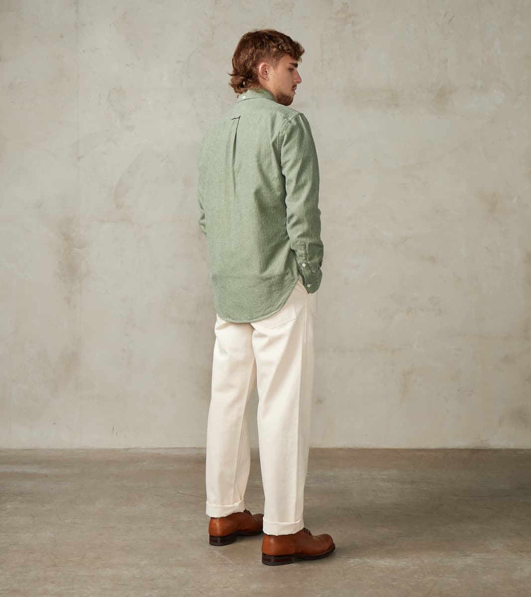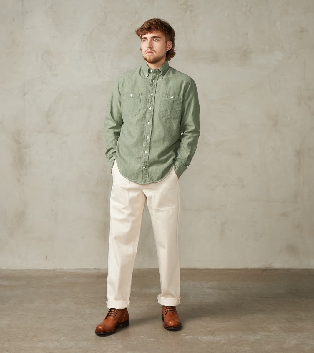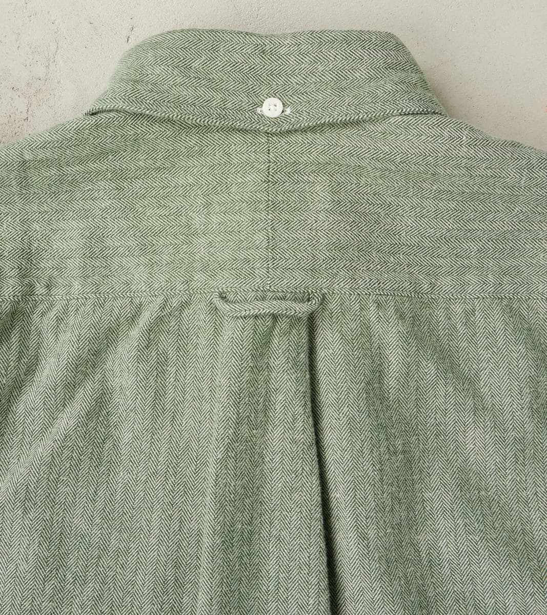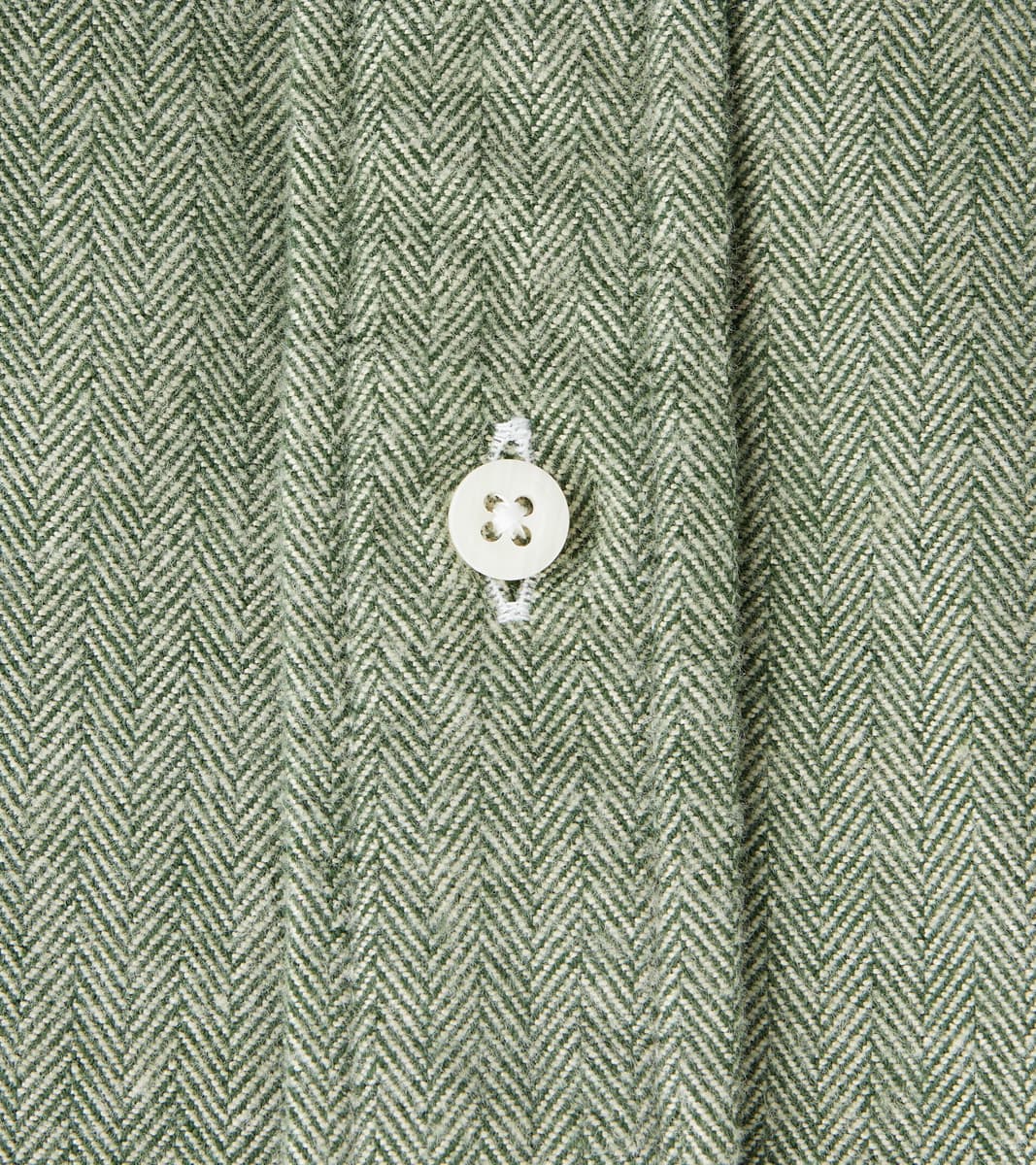 The Shetland Herringbone Flannel in Basil from Gitman Vintage is a Division Road exclusive made in a three-season 6 oz. medium weight 100% Cotton herringbone twill weave that uses tonally shaded yarns to create a subtle textured pattern, resulting in another brilliantly updated, timeless piece. Loomed from fully combed yarns, this cotton tweed has been double-brushed to create a luxurious, soft, and flexible hand in a durable and hearty woven material. This shirt comes with dual buttoned chest pockets, Gitman's signature button-down collar style, and is replete with original details like chalk buttons, a locker loop, and a final horizontal buttonhole in green thread. This shirt is produced in the modern tailored fit with a moderate hem sweep that styles well tucked or untucked and an adapted straight cut "just right" for most body types. Gitman Vintage shirts are classic, simple, original, and have a casual sophistication, making them a standard wardrobe piece for many well-dressed men. We are unique in our offerings of Gitman Vintage by neck sizing for all you gents between alpha sizes; you now have the opportunity for a perfectly fitting Gitman right out of the box.