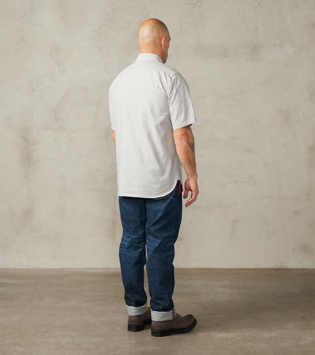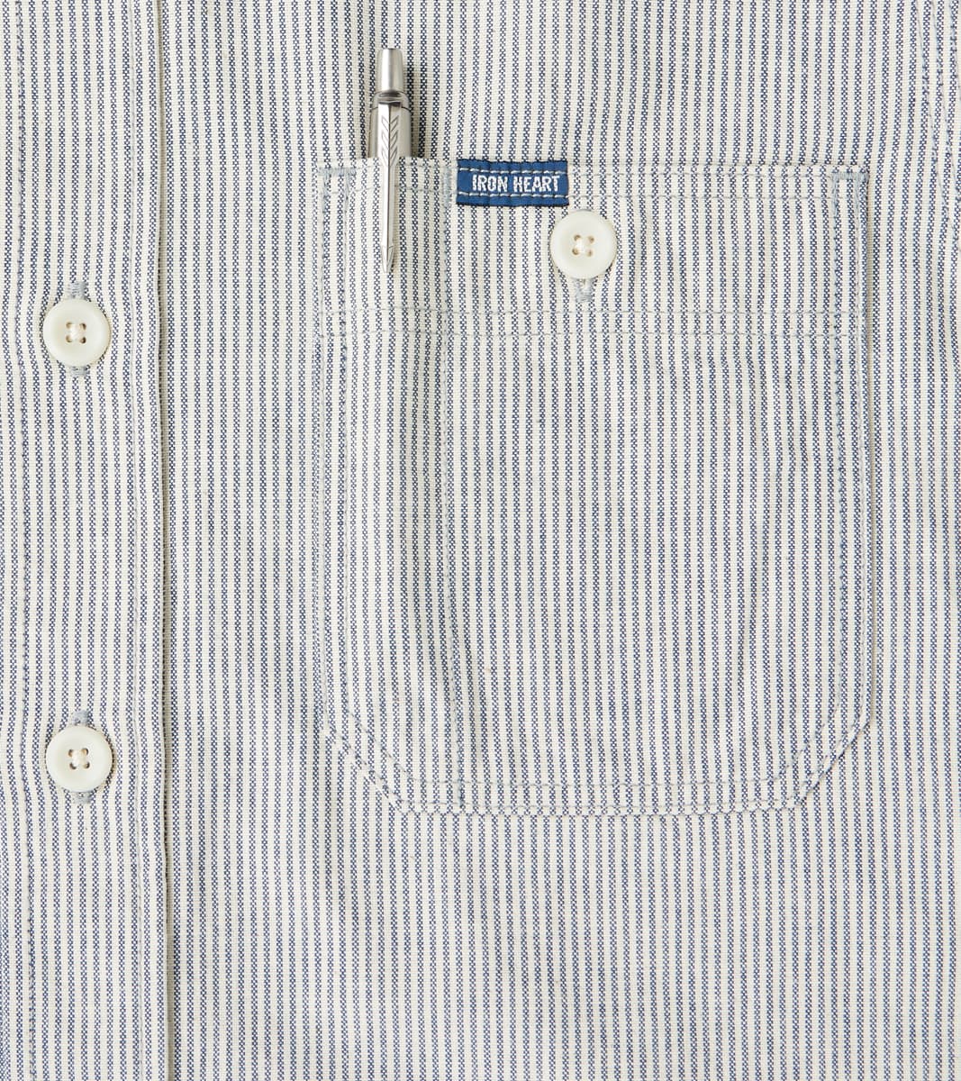 The Iron Heart IHSH-420-HIC Short Sleeved Work Shirt is a medium-weight, reinforced piece produced from a 5 oz. sanforized and rinsed Japanese Selvedge Oxford Broadcloth in a yarn-dyed Hickory Stripe that's appropriate as a warm weather style staple. Using the signature Iron Heart Work Shirt pattern, this piece is perfectly proportioned in length to be worn untucked for modern, vintage-styled grit. This classic striped pattern uniquely incorporates rope-dyed indigo yarns woven with white yarns for a personalized fade to convey edge in the workshop. This Work Shirt features numerous carefully considered construction and design details that enhance the original inspiration, such as white concave military-grade melamine buttons on the dual patch front chest pockets, which include a pencil slot, and the front placket, creating a piece for the stylistically sound and self-reliant. Additionally, red selvedge line reveals on the placket and side seam gusset, paired with red thread internal felled seams and chainstitched construction with inseam run-off, give this piece all the necessary heritage provenance, and then some. The Hickory Stripe Short Sleeved Work Shirt strikes a balance between classic and modern applications, making it a future heirloom, a seasonal go-to, and a substantial piece that will only improve with wear. Built for the biker and over-engineered from the start, the Iron Heart 420-HIC tests the limits of what can be artfully woven and sewn, delivering a lifetime of durability in a work-ready design.
