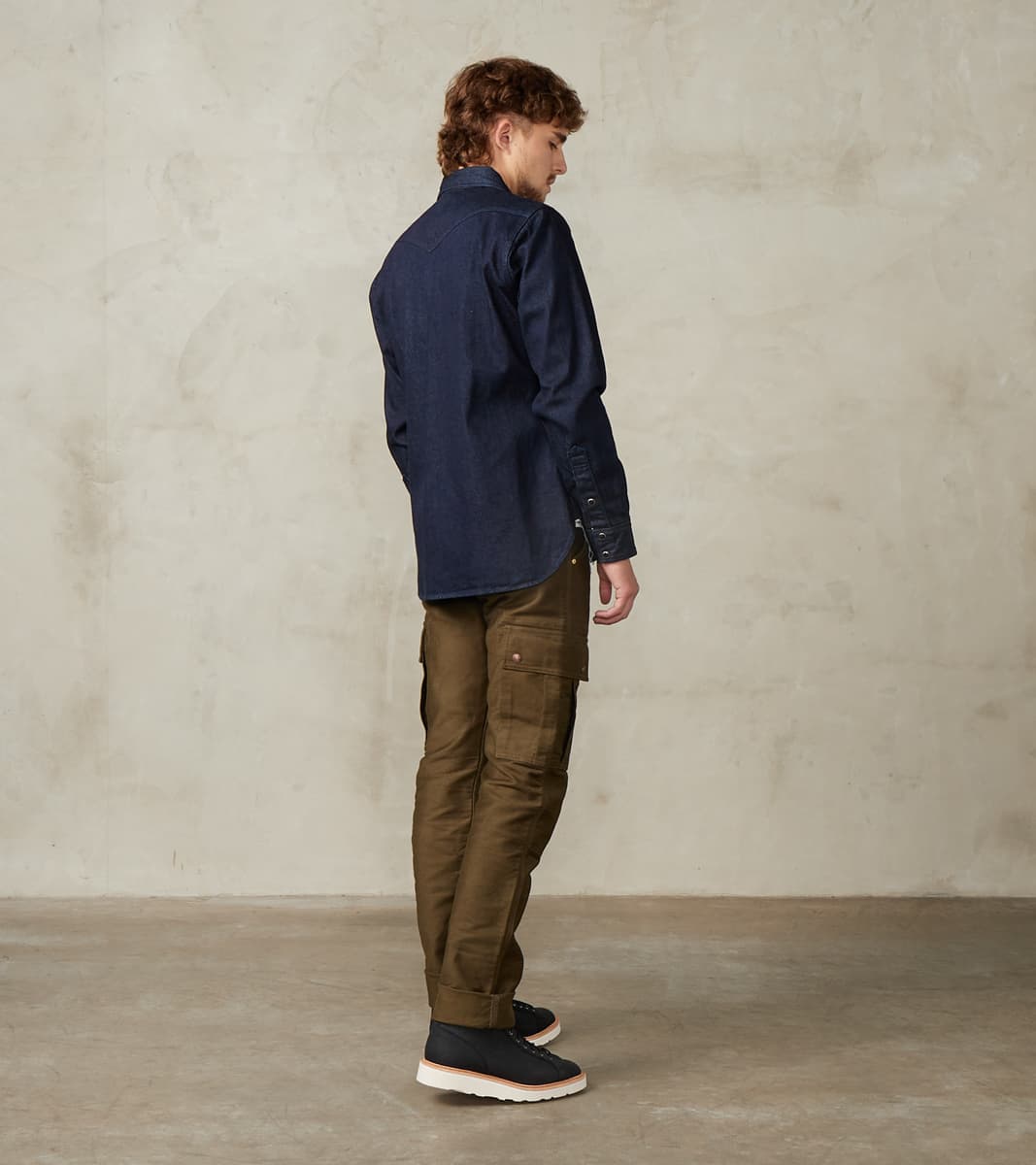 The Iron Heart x Division Road IHDR-502-ODG Serviceman in Olive Drab Green Military Whipcord is an exclusive development based on the 888 cut as a Classic Tapered fit with a mid-high rise, roomy seat, broad thigh, and a modern-meets-vintage tapered leg with a moderate hem for full functionality and style versatility. This collaboration was designed to infuse military, workwear, and moto club inspirations, materials, and production techniques to create an evolved collectible for our Division Road Army on their journey from the barracks to the battlefield. Being true to the originals with a heritage update, this Serviceman Cargo features a unique 12 oz. Japanese Bedford Whipcord fashioned after jungle cloths from the 1940s and made military-grade from hearty 100% Cotton in a twisted yarn that's woven into a corded texture that allows for a pliable durability and clean canvas that will evolve subtly with the heavy use this piece is intended to endure. Built for the motorcycle community and over-engineered to start, Iron Heart tests the limits of what actually can be artfully woven and sewn. The Serviceman Cargo stays true to this tradition of enhancing moto-ready builds with a beyond military-grade disposition, evident from the double-layer knee panel and cargo flap pocket reinforcement, brass riveted slash front pockets, welt back pockets, heavy-duty twill pocket bags, and gusseted cargo pockets with military-grade engraved copper snap button closures. Furthering the elevated execution of this modern free rider military cargo pant remake is the use of a reproduction Universal zipper fly, bartack reinforcements, and triple chainstitched felled inseam and outseam with heavy gauge chainstitching construction throughout to ensure a lifetime of utility while signifying your cult collector rank.