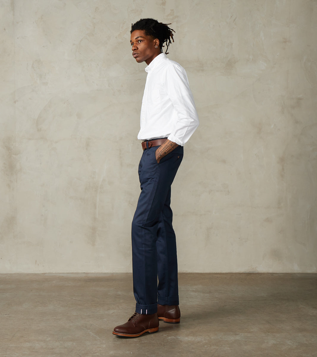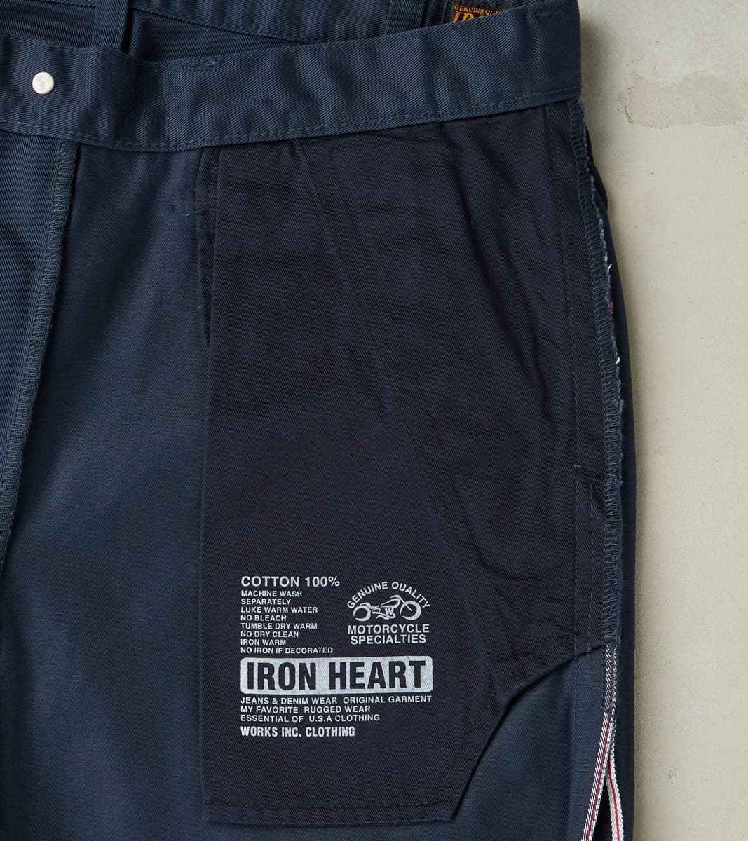 The Iron Heart IH-721-NAV in Navy is a modern remake of military-inspired Chinos in the mid-low rise Super Slim Tapered Fit based on the 777 cut with a moderate seat and thigh, tapered leg, and narrow hem. Remaining true to the original while providing a heritage update, this Chino is made from 9 oz. sanforized and once-washed Selvedge Chino cloth in 100% Cotton that has been cold-mercerized. This process enhances durability and rigidity, giving the fabric a slight sheen, thus improving upon the cloth used in military originals without sacrificing its distinct style. Over years of wear, this cloth will break in and dull while retaining its shape and refined finish. The comfortably slim form contains a rugged appeal, resulting in chinos perfect for the gent who lives his history in the present. Built for the motorcycle community and over-engineered from the start, Iron Heart tests the limits of what can be artfully woven and sewn. This Chino stays true to the tradition of workwear builds with a semi-casual sensibility, featuring a Universal reproduction zipper fly, slash front pockets, welt back pockets with an engraved copper snap, a front coin pocket, heavy-duty canvas pocket bags, bartack reinforcements, flat-felled inseams, and chainstitching construction throughout. As a result, the Iron Heart 721 Navy Selvedge Chino has enough class and character to reflect the honor roll rebel in all of us.