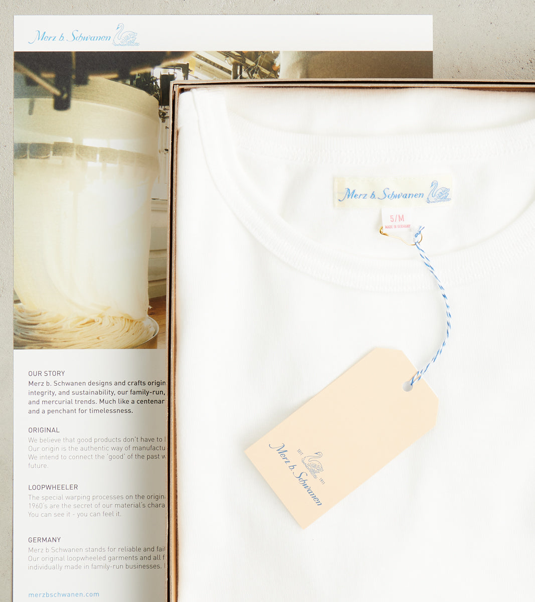 Merz b. Schwanen is on the small side of true to size, and is made with a loom-state unwashed, loopwheel fabric that will have about a half (.5) size shrinkage upon first wash. For a classic-fitting garment, consider taking the larger size in your range, and for a relaxed fit, go one (1) size up.