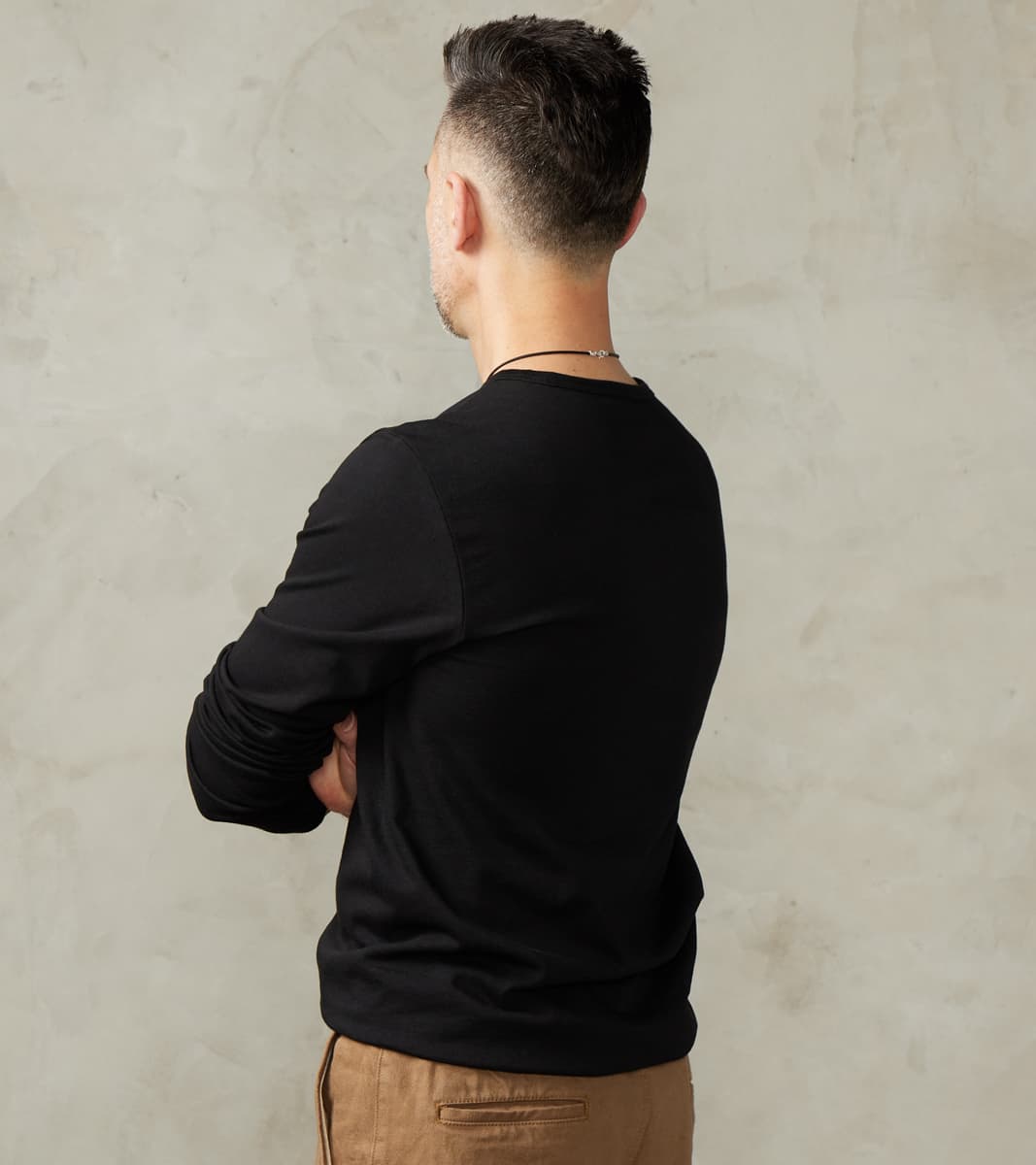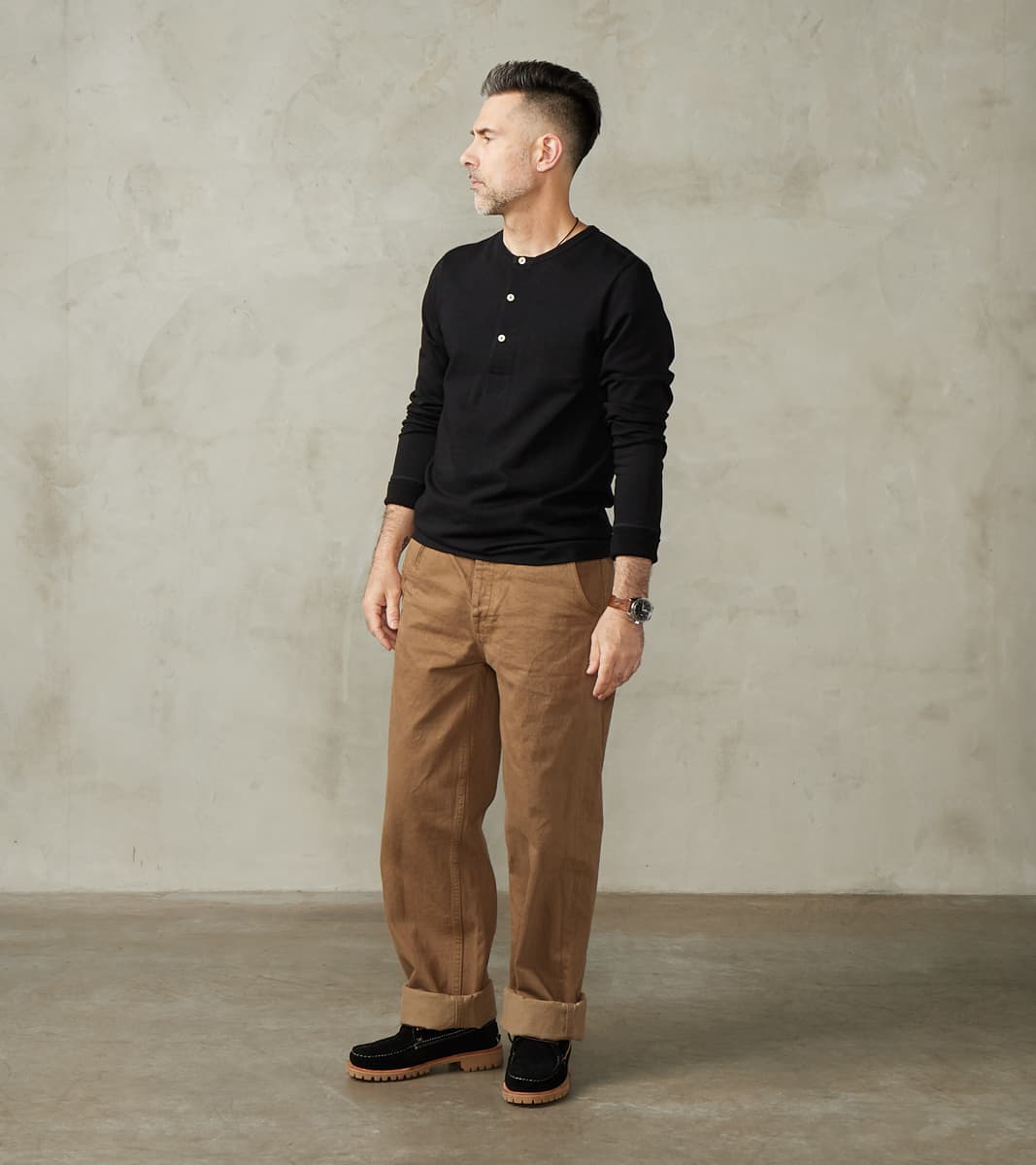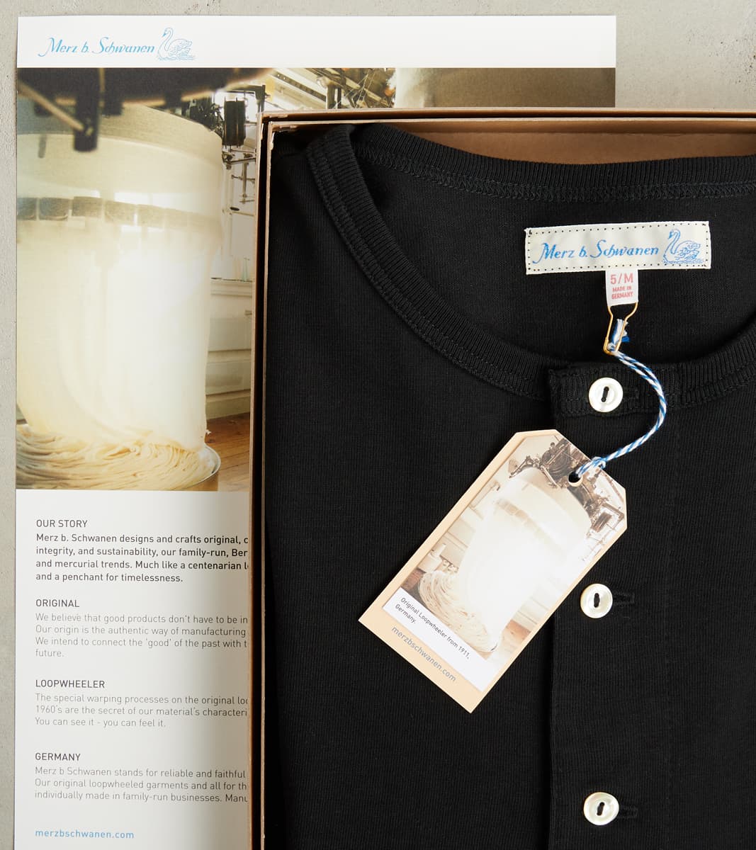 Merz b. Schwanen is on the small side of true to size, and is made with a loom-state unwashed, loopwheel fabric that will have about a half (.5) size shrinkage upon first wash. For a classic-fitting garment, consider taking the larger size in your range, and for a relaxed fit, go one (1) size up.