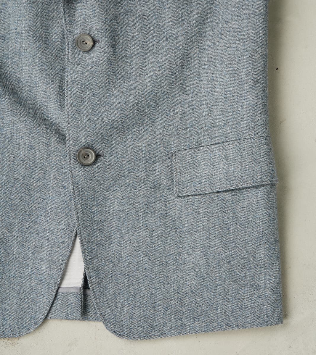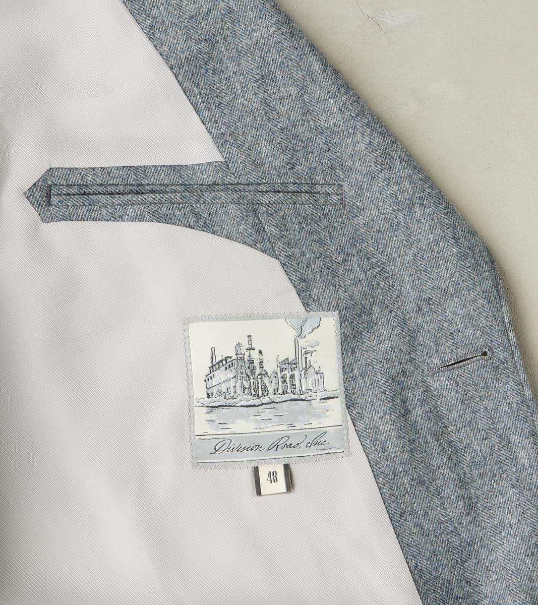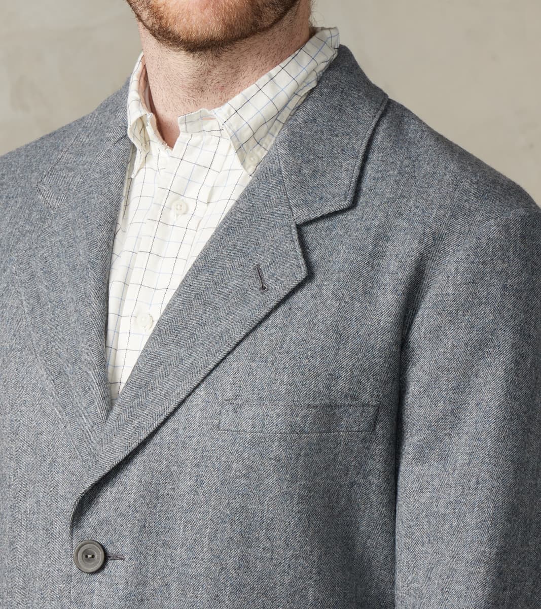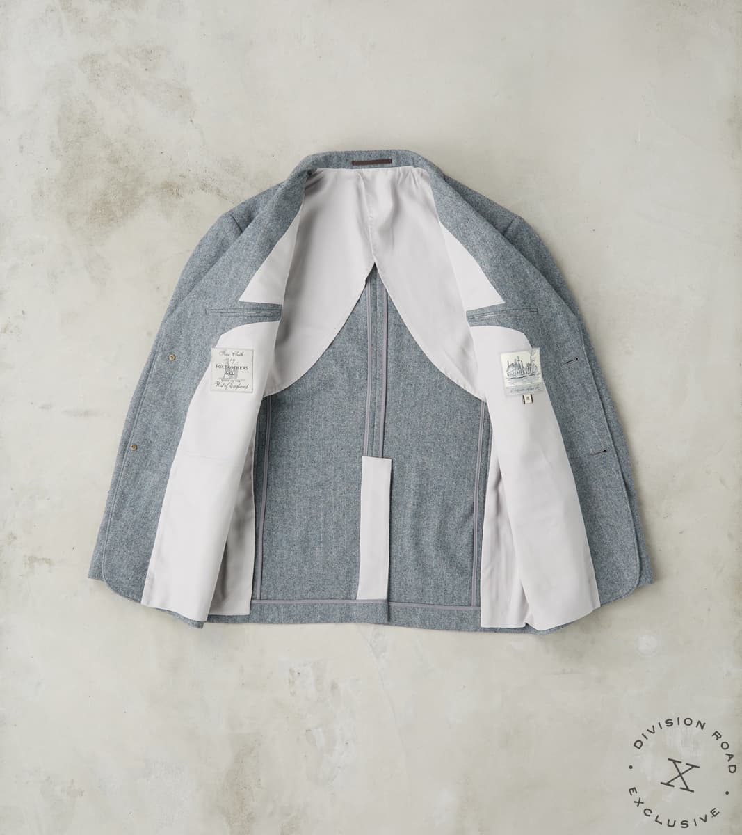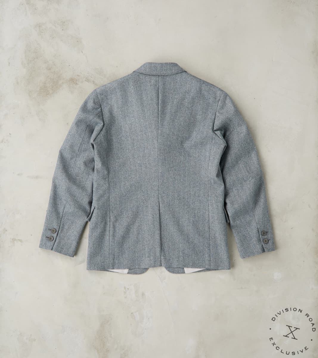 The American Sack Jacket by MotivMfg x Division Road is designed as a meeting point between tailored formal and dutiful leisure blazers, perfectly balanced in design to be a timeless wardrobe staple. This piece is derived from sack jackets popularized in the United States from the 1920s-50s and re-designed with an anatomically tailored fit that bridges modern and vintage styling with a 2-button front, elongated notch lapel, and center vent. This jacket is made in a limited bolt, medium-weight 13 oz. Grey Chalk Stripe upon Herringbone Twill weave produced at the 200-year-old original Somerset mill by the world-famous Fox Brothers® using the finest 100% British Merino Wool with the signature Worsted Flannel finishing for a suiting grade fabric engineered for the outdoors. Since 1772, Fox Brothers has produced top-tier textiles used in many applications, from Savile Row tailoring to British Military garments. By sourcing the best fibers from around the world and using intensive hand-driven milling and cording processes, they produce fabrics of the highest grade with comfort, density, and durability, all wrapped into one. This incredibly luxurious, flexible, and robust cloth boasts a complex herringbone twill weave using shades of cool grey yarns with a subtle, woven natural grey chalk stripe for a sophisticated aesthetic that reflects its enhanced class. This American Sack Jacket is designed with a soft padded shoulder and dress-to-casual versatility with a Cupro twill half-lined body that provides drape with mobility, along with Bemberg lined sleeves and functional buttoned cuffs for practical refinement. Paying homage to the originals but elevated with tailored sophistication, this jacket has beautifully shaped and utilitarian pocketing like a welt chest pocket, flap front welted pockets, and dual chest interior welt pockets for accompaniments. This piece is packed with superior bespoke and old-world detailing like felled and taped seams, bartack reinforcements throughout, and genuine horn buttons that have a unique matte finish. MotivMfg has re-established a pattern-to-bespoke garment one-roof workshop in Beijing with the ethos, process, techniques, and materials of Savile Row to produce historically informed garments in styles and production methods lost by the West. We are honored to partner with MotivMfg to offer exclusive collaborations for a new and timeless uniform for the Division Road Army.