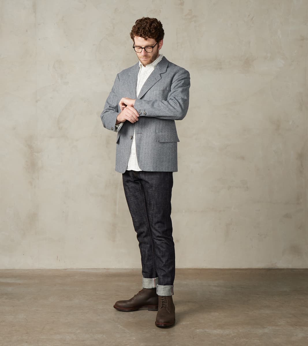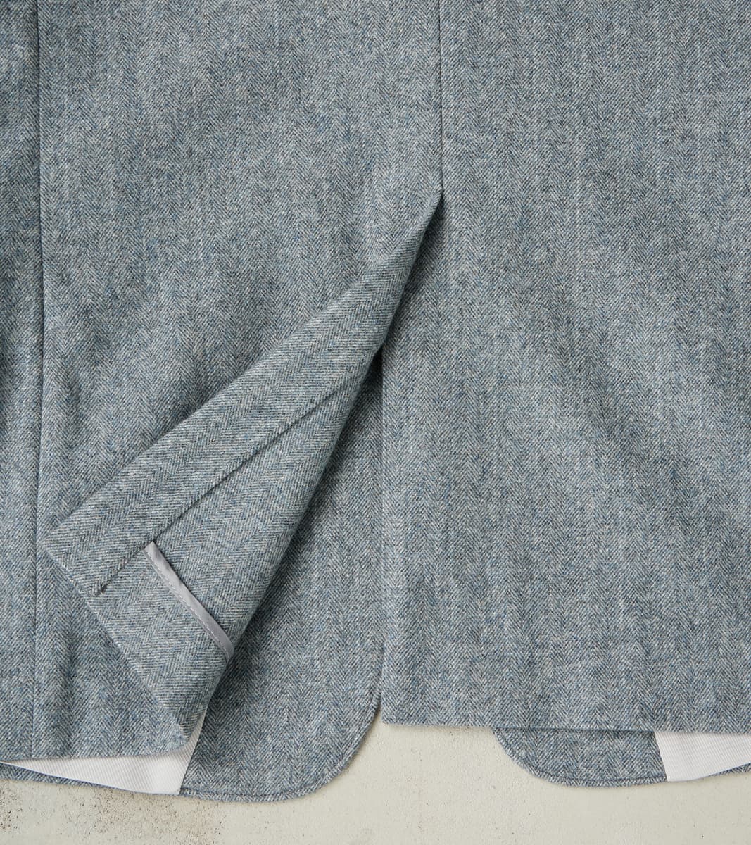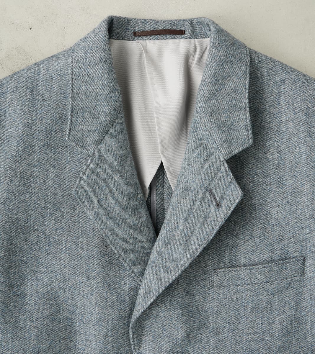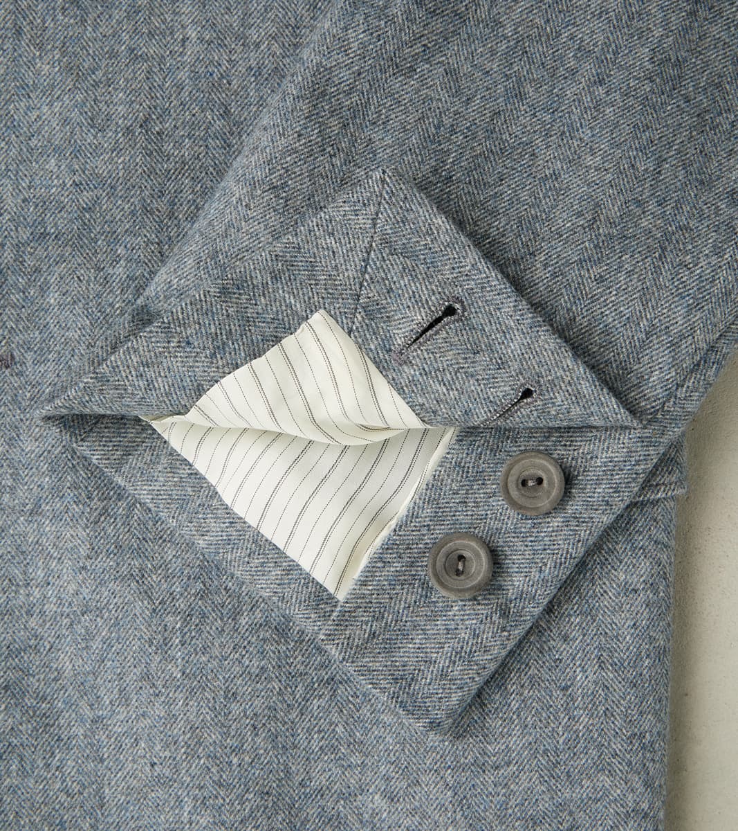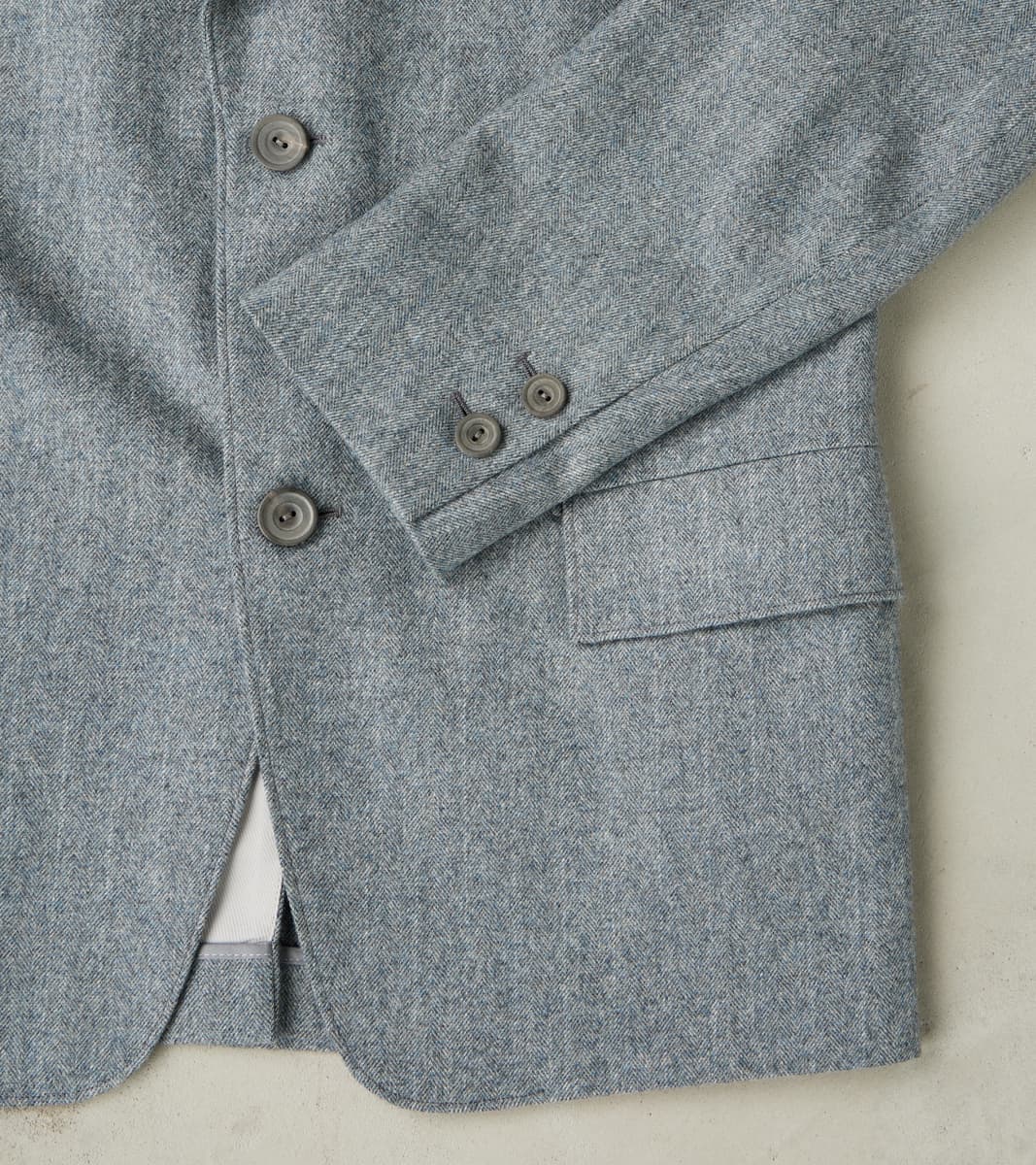 The American Sack Jacket by MotivMfg x Division Road is designed as a meeting point between tailored formal and dutiful leisure blazers, perfectly balanced in design to be a timeless wardrobe staple. This piece is derived from sack jackets popularized in the United States from the 1920s-50s and re-designed with an anatomically tailored fit that bridges modern and vintage styling with a 2-button front, elongated notch lapel, and center vent. This jacket is made in a limited bolt, medium-weight 13 oz. Grey Chalk Stripe upon Herringbone Twill weave produced at the 200-year-old original Somerset mill by the world-famous Fox Brothers® using the finest 100% British Merino Wool with the signature Worsted Flannel finishing for a suiting grade fabric engineered for the outdoors. Since 1772, Fox Brothers has produced top-tier textiles used in many applications, from Savile Row tailoring to British Military garments. By sourcing the best fibers from around the world and using intensive hand-driven milling and cording processes, they produce fabrics of the highest grade with comfort, density, and durability, all wrapped into one. This incredibly luxurious, flexible, and robust cloth boasts a complex herringbone twill weave using shades of cool grey yarns with a subtle, woven natural grey chalk stripe for a sophisticated aesthetic that reflects its enhanced class. This American Sack Jacket is designed with a soft padded shoulder and dress-to-casual versatility with a Cupro twill half-lined body that provides drape with mobility, along with Bemberg lined sleeves and functional buttoned cuffs for practical refinement. Paying homage to the originals but elevated with tailored sophistication, this jacket has beautifully shaped and utilitarian pocketing like a welt chest pocket, flap front welted pockets, and dual chest interior welt pockets for accompaniments. This piece is packed with superior bespoke and old-world detailing like felled and taped seams, bartack reinforcements throughout, and genuine horn buttons that have a unique matte finish. MotivMfg has re-established a pattern-to-bespoke garment one-roof workshop in Beijing with the ethos, process, techniques, and materials of Savile Row to produce historically informed garments in styles and production methods lost by the West. We are honored to partner with MotivMfg to offer exclusive collaborations for a new and timeless uniform for the Division Road Army.