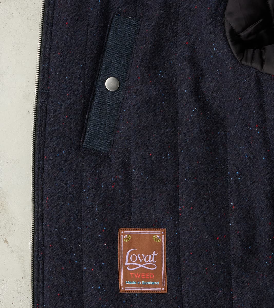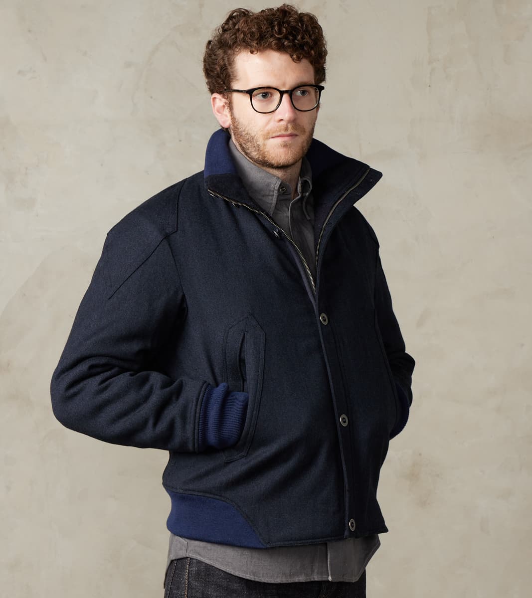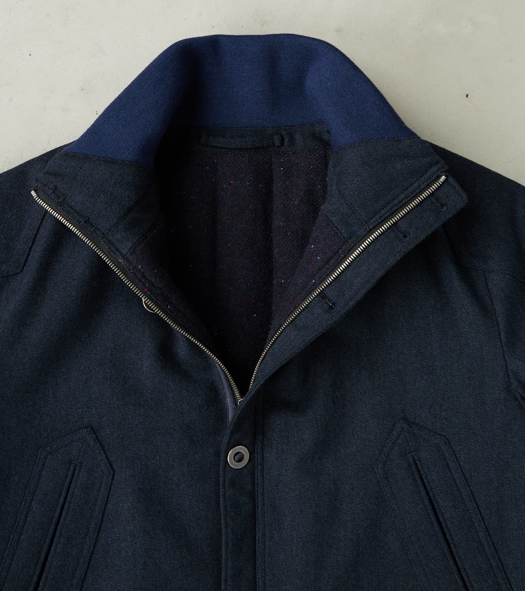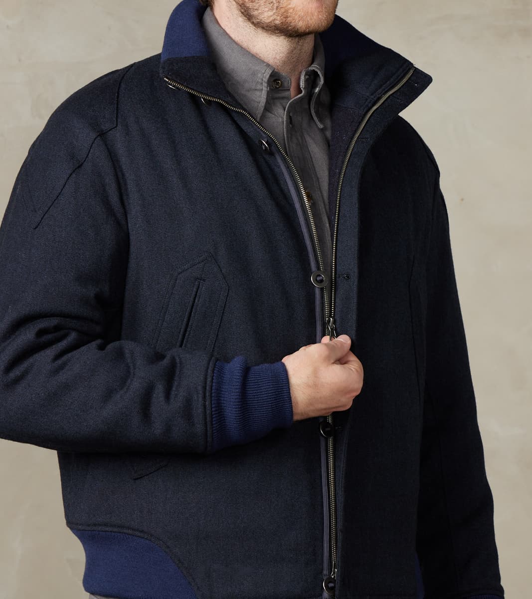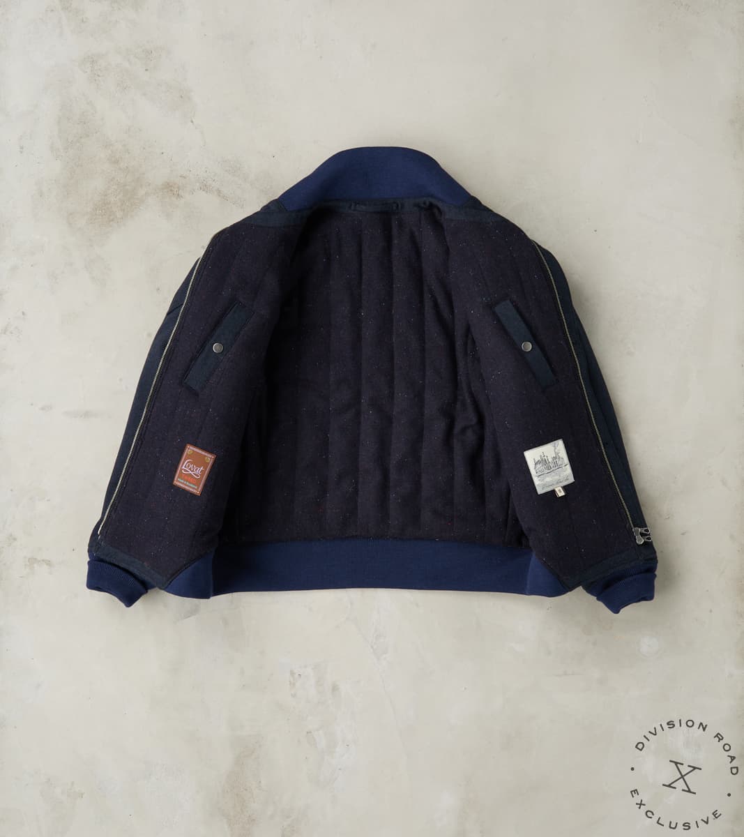 The American Vector Bomber by MotivMfg x Division Road is designed to bridge vintage military jackets and modern tailoring. This outerwear garment is derived from a WWII Tanker Jacket that takes fit and detailing from aviator styles, recreated as a cleanly designed, fully insulated wool batten bomber in an anatomically tailored fit. A complicated articulated raglan sleeve with integrated diamond-shaped shoulder patches for reinforcement is combined with a pleated back shoulder to allow for movement in a design-centric approach to a cut perfectly balanced between vintage and contemporary. This jacket is made from a 15 oz. Lovat Mill® Covert Cloth that uses the finest 100% Worsted Lambswool for a suiting grade fabric engineered for the outdoors while maintaining a sophisticated aesthetic and luxurious finish. Famous for its historic milling processes tied to worsting yarns and cloths, Covert Cloth goes back to the early 1900s as a military-grade stepped twill weave wool designed to endure regimental riding and harsh conditions, providing waterproof outdoor protection for officers and gentlemen alike. Produced by Scotland's renowned Lovat® Mill — established in 1826 as the "Home of Tweed" and focused on true sustainability and traceability through vertical production — this Covert Cloth has a pronounced drape and flexibility with a luxurious, textured finish in a true midnight navy. This American Vector Bomber is designed with a zipped and buttoned storm placket front and articulated ribbed stand collar, hem, and cuffs, allowing for outdoor versatility and functionality with elevated style. Paying homage to the originals with sophisticated finishing, this jacket is fully lined with a brilliant tonal British Lambswool Twill Flannel. It has beautifully diamond-shaped wide-welt hand pockets and two interior snap pockets for comfortable and secure carrying. This piece is packed with superior bespoke and old-world detailing like felled seams, bartack reinforcements throughout, and custom cast and burnished gunmetal buttons. MotivMfg has re-established a pattern-to-bespoke garment one-roof workshop in Beijing with the ethos, process, techniques, and materials of Savile Row to produce historically informed garments in styles and production methods lost by the West. We are honored to partner with MotivMfg to offer exclusive collaborations for a new and timeless uniform for the Division Road Army.