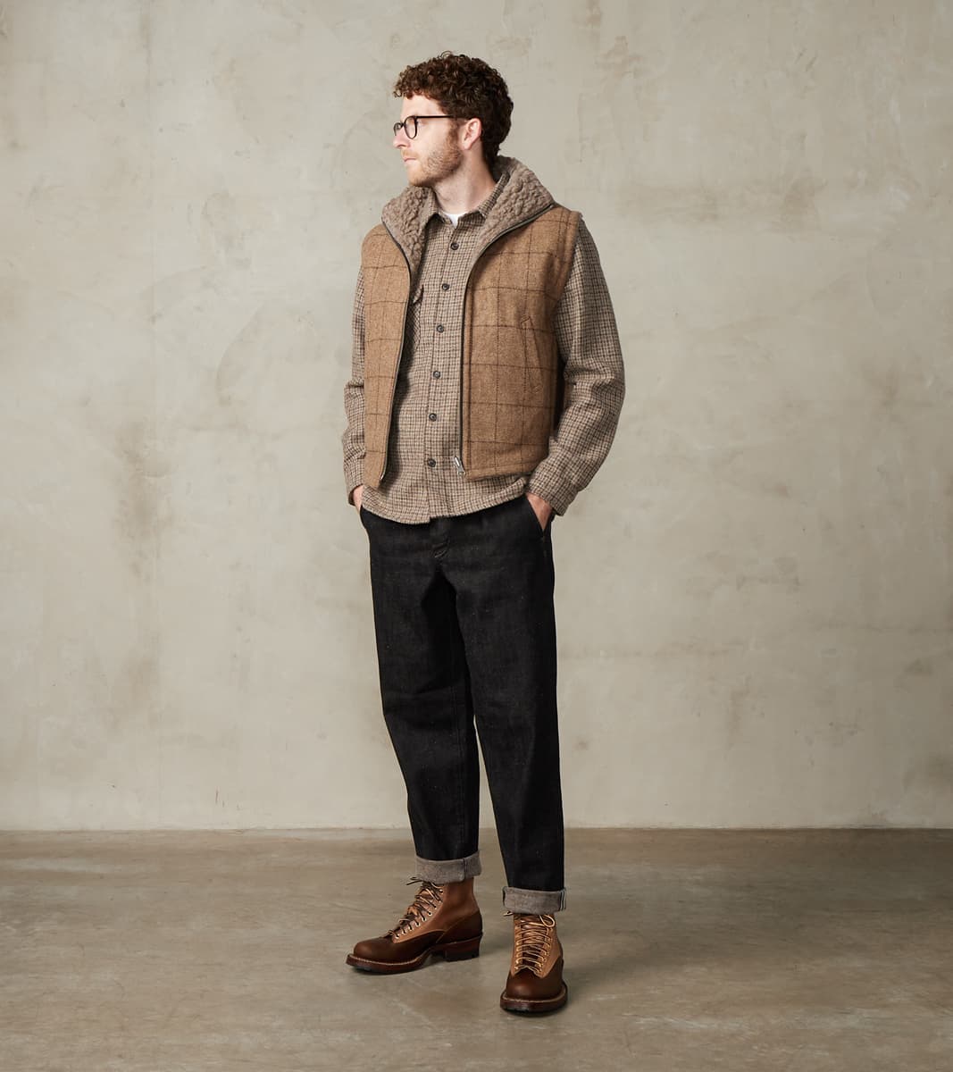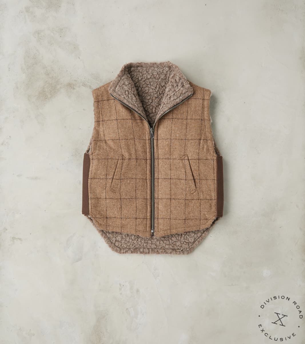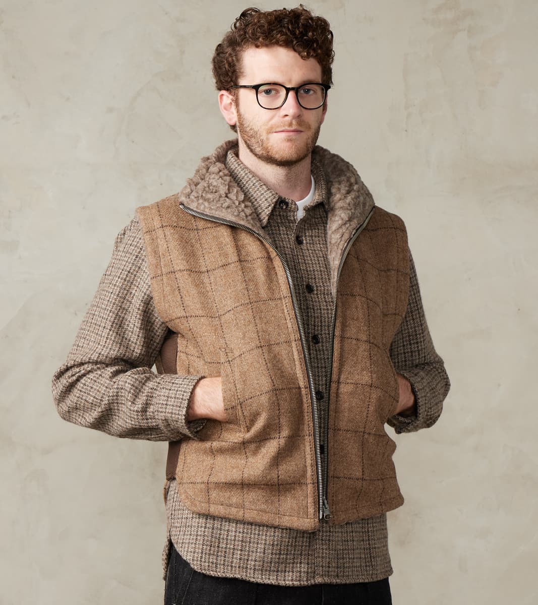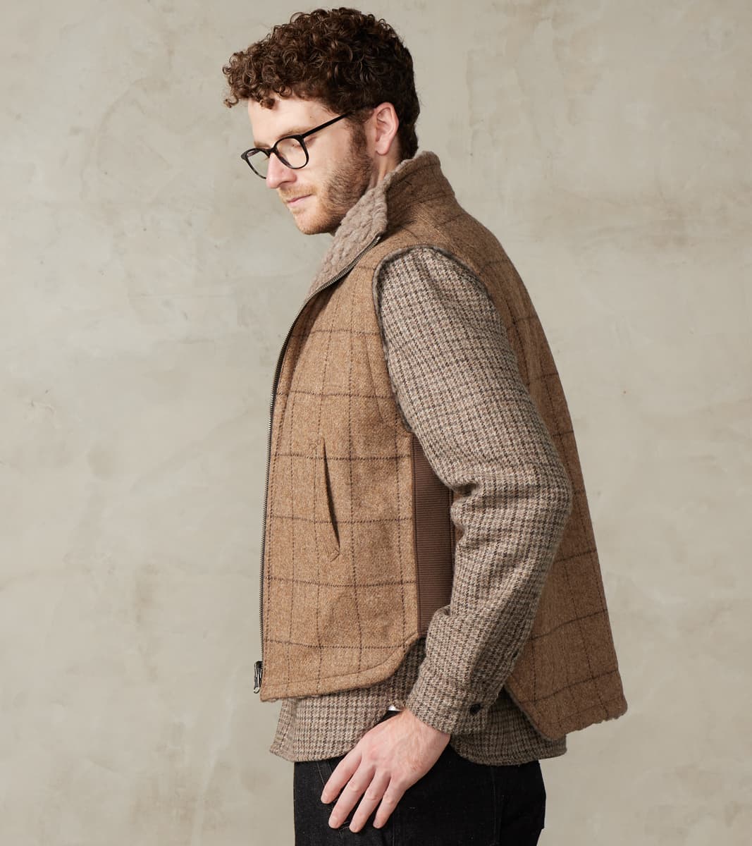 The English Army Reversible Jerkin Vest by MotivMfg x Division Road is designed as a meeting point between vintage insulated English military vests and countryside garments. This piece is derived from an early 20th-century outdoorsman leather vest adapted for the British Army in WWII and is recreated as a high-style reversible garment with an anatomically tailored fit. This outerwear-focused vest is made in a medium-weight 14 oz. Windowpane woolen cloth produced from entirely undyed 100% British Wool from various sheep breeds for contrasting shades of brown woven into a traditional pattern. From one of England's oldest mills, dating to 1782, Marling & Evans®, this natural tweed woolen has a durable and pronounced texture while remaining chemical-free. It is minimally processed in a simple soap wash to retain the wool's natural oils for durability and a soft hand. It boasts a complex and defined pattern using shades of khaki and espresso for a sophisticated pattern with a natural, luxurious, and textured finish. This English Army Jerkin Vest is reversible with a gunmetal zipped front to the secondary natural, undyed Wool-Poly Fleece side with a high pile for a forward, urban-to-outdoor aesthetic and versatility. Paying homage to the originals with refined sophistication, the pattern-matched front face comes with welted hand pockets paired with a high storm collar, ribbed side panels for comfort and function, and a military-inspired high front and low back hem for a cleanly designed utility piece that styles well with various garments. This vest is packed with superior bespoke and old-world detailing like felled seams and bartack reinforcements. MotivMfg has re-established a pattern-to-bespoke garment one-roof workshop in Beijing with the ethos, process, techniques, and materials of Savile Row to produce historically informed garments in styles and production methods lost by the West. We are honored to partner with MotivMfg to offer exclusive collaborations for a new and timeless uniform for the Division Road Army.