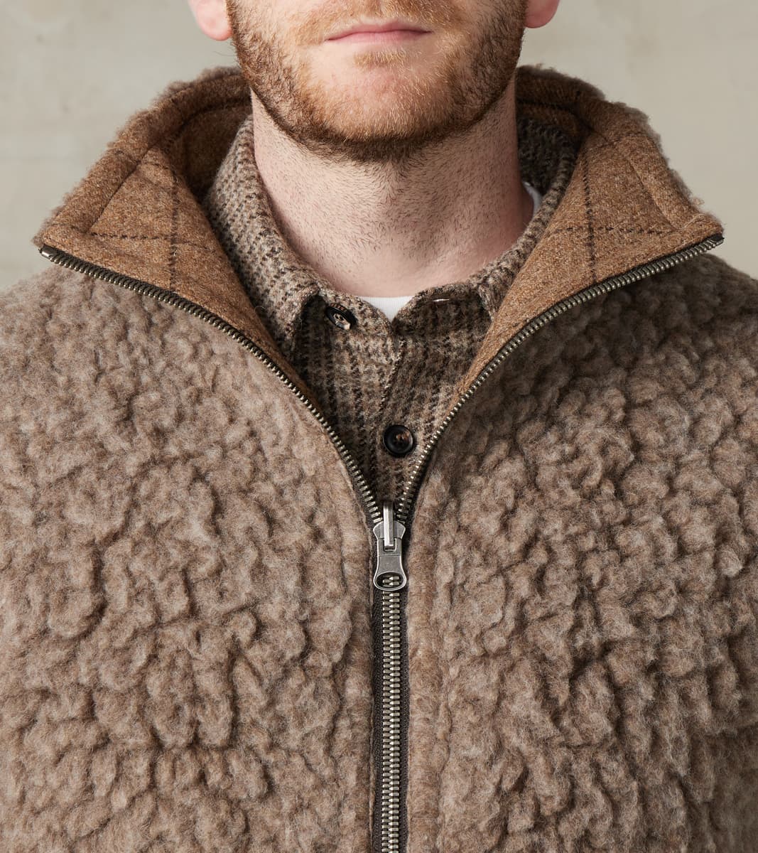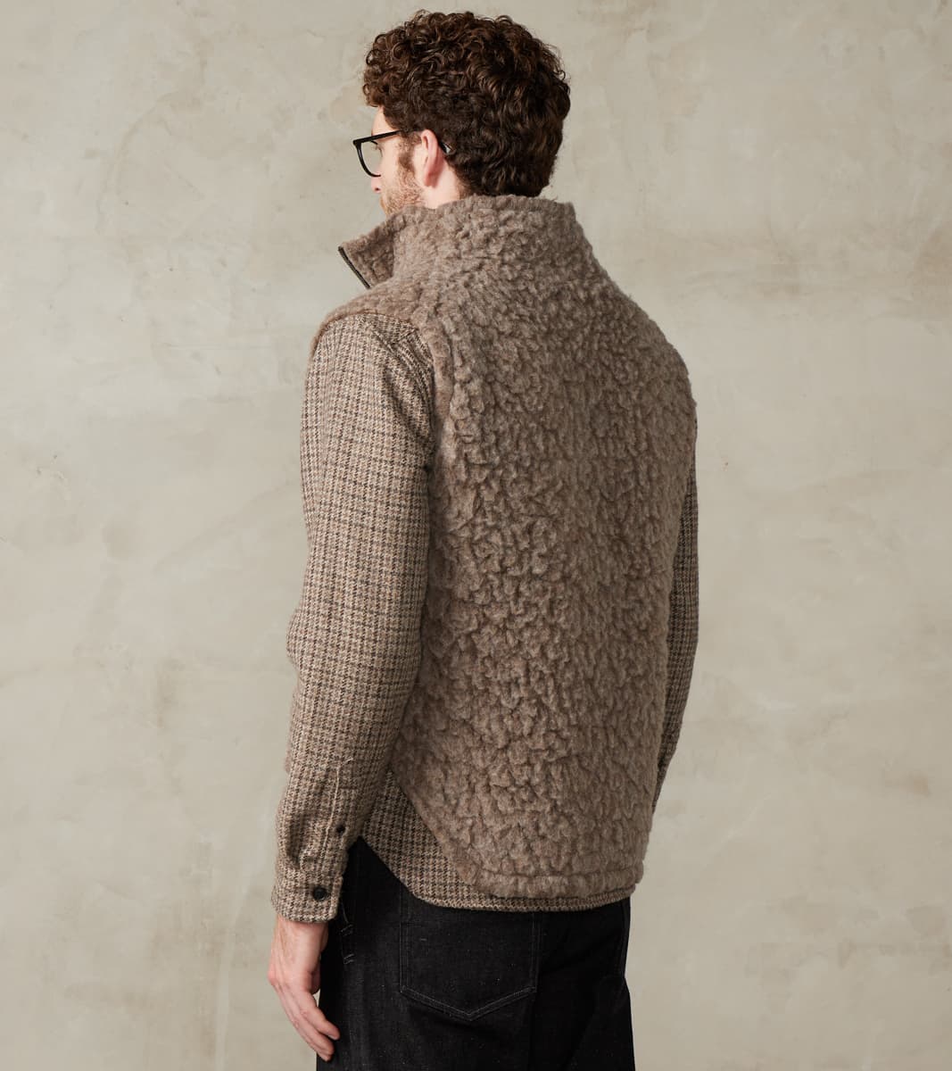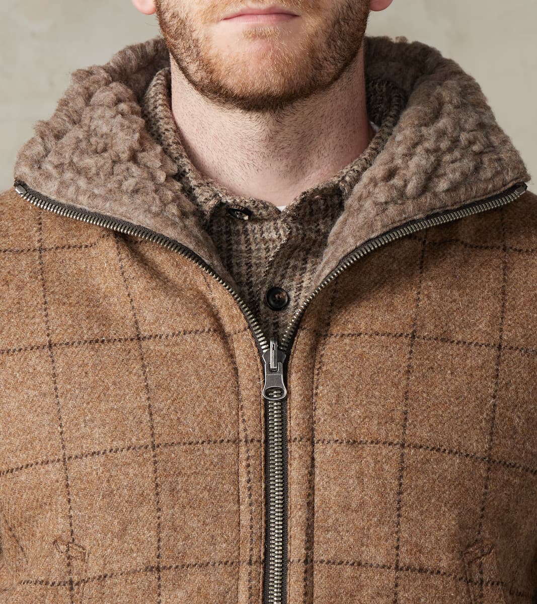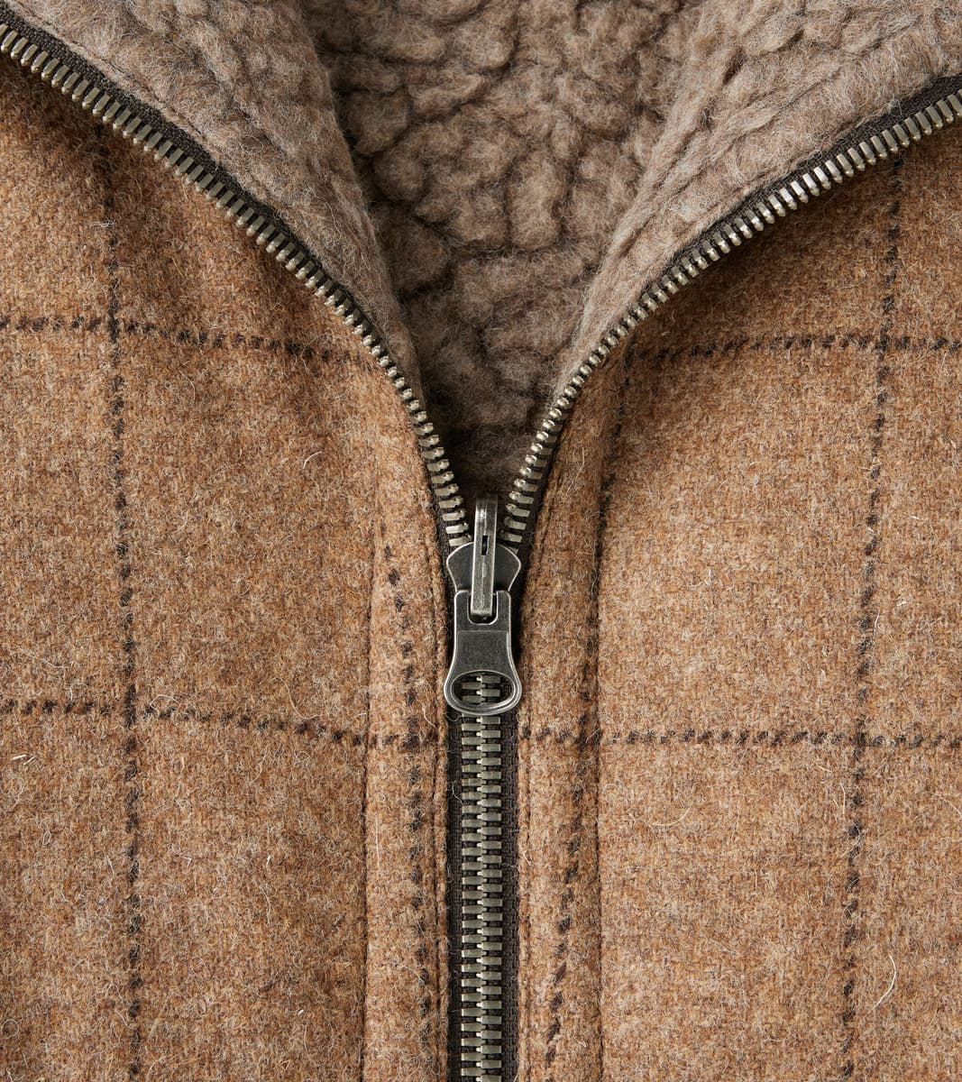 The English Army Reversible Jerkin Vest by MotivMfg x Division Road is designed as a meeting point between vintage insulated English military vests and countryside garments. This piece is derived from an early 20th-century outdoorsman leather vest adapted for the British Army in WWII and is recreated as a high-style reversible garment with an anatomically tailored fit. This outerwear-focused vest is made in a medium-weight 14 oz. Windowpane woolen cloth produced from entirely undyed 100% British Wool from various sheep breeds for contrasting shades of brown woven into a traditional pattern. From one of England's oldest mills, dating to 1782, Marling & Evans®, this natural tweed woolen has a durable and pronounced texture while remaining chemical-free. It is minimally processed in a simple soap wash to retain the wool's natural oils for durability and a soft hand. It boasts a complex and defined pattern using shades of khaki and espresso for a sophisticated pattern with a natural, luxurious, and textured finish. This English Army Jerkin Vest is reversible with a gunmetal zipped front to the secondary natural, undyed Wool-Poly Fleece side with a high pile for a forward, urban-to-outdoor aesthetic and versatility. Paying homage to the originals with refined sophistication, the pattern-matched front face comes with welted hand pockets paired with a high storm collar, ribbed side panels for comfort and function, and a military-inspired high front and low back hem for a cleanly designed utility piece that styles well with various garments. This vest is packed with superior bespoke and old-world detailing like felled seams and bartack reinforcements. MotivMfg has re-established a pattern-to-bespoke garment one-roof workshop in Beijing with the ethos, process, techniques, and materials of Savile Row to produce historically informed garments in styles and production methods lost by the West. We are honored to partner with MotivMfg to offer exclusive collaborations for a new and timeless uniform for the Division Road Army.