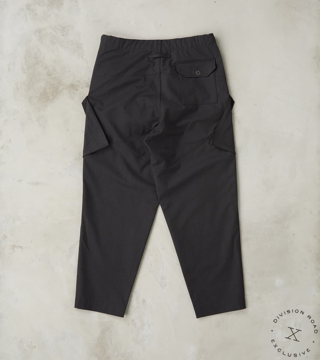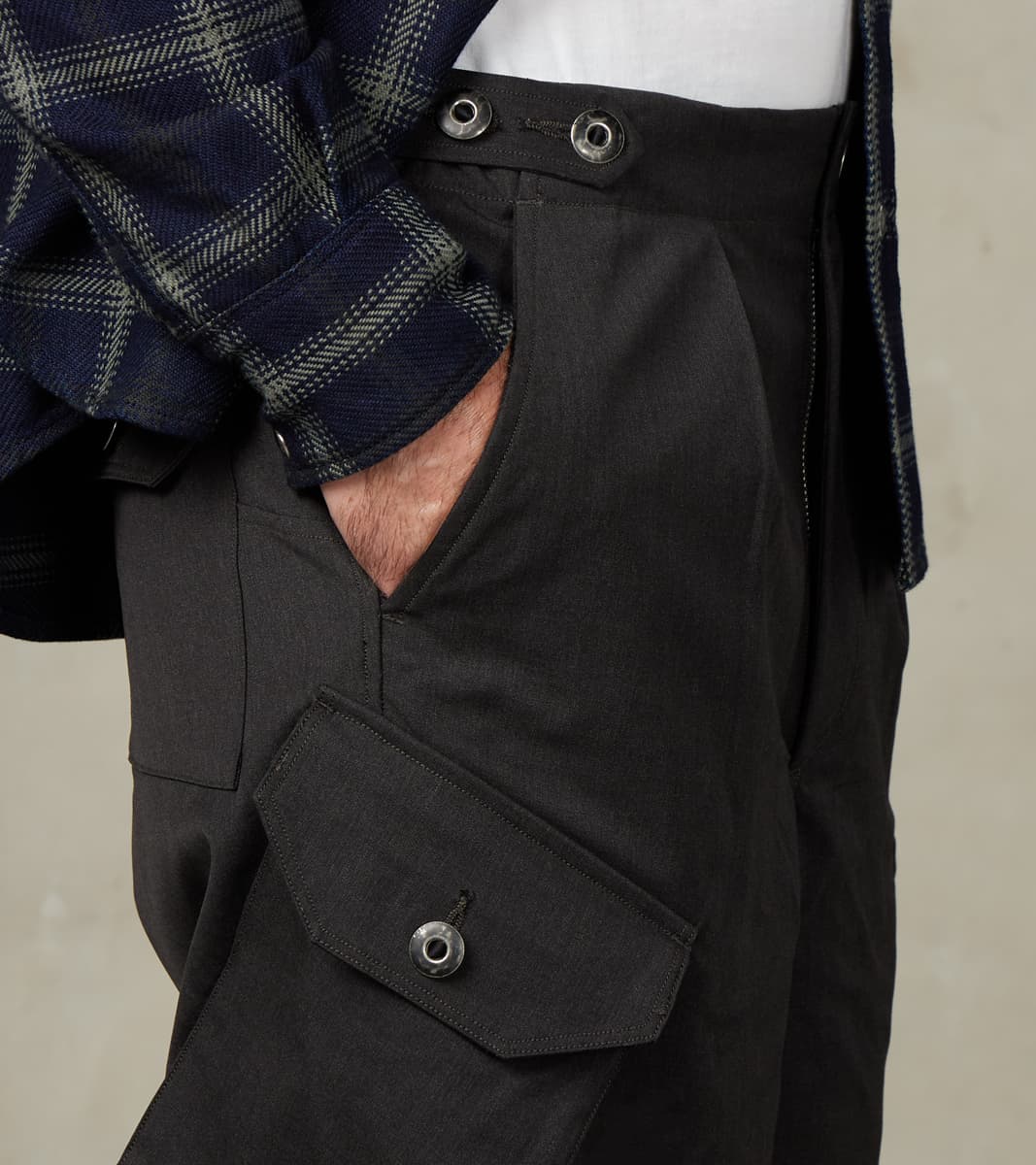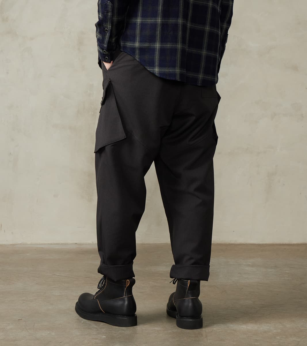The Swiss Army Cargo Trouser by MotivMfg x Division Road is a high-rise, single-pleated pant with a roomy and relaxed top block and thigh that tapers to a moderate hem, offering a perfectly balanced, modern take on mid-20th century Swiss and German military and aeronautical utility pants, designed to be an inspirational piece in the Original Gentleman's wardrobe. This trouser is crafted from luxurious and technical Optim ™ Wool, developed and produced by Woolmark ®, which is a wind, wrinkle, and water-resistant suiting-grade woolen with a light all-season weight and a dense, structured drape, perfect for styling versatility while on reconnaissance in the city or trekking the outdoors. This 8 oz. Optim Wool Gabardine utilizes 100% Merino wool fibers that are stretched in spinning and shrunken in wet-finishing for a smooth twill weave that highlights and enhances the wool's natural weather resistance, breathability, temperature regulation, and durability. Paying homage to the original with sophisticated finishing, this trouser features a single pleat for an optimal fit with drape, an adjustable waistband with an ingenious tab button front, and a concealed elastic back, complete with a zipped fly and top button front. These Swiss Army Cargo Trousers are enhanced with a full lining and design-focused utilitarian pocketing, including gusseted and angled side cargo pockets, a patch back pocket with button closures, and slant front pockets for all the tools and accompaniments one needs. Finally, this pant is packed with superior bespoke and old-world detailing, such as an articulated back yoke and legs, cotton ripstop pocket bags and interior trim, felled seams, bartack reinforcements throughout, a finished tailor's hem for easy inseam alterations, and custom cast and burnished gunmetal buttons. MotivMfg has re-established a pattern-to-bespoke garment, one-roof workshop in Beijing with the ethos, processes, techniques, and materials of Savile Row to produce historically informed garments in styles and production methods lost by the West. We are honored to partner with MotivMfg to offer exclusive collaborations for a new and timeless uniform for the Division Road Army.