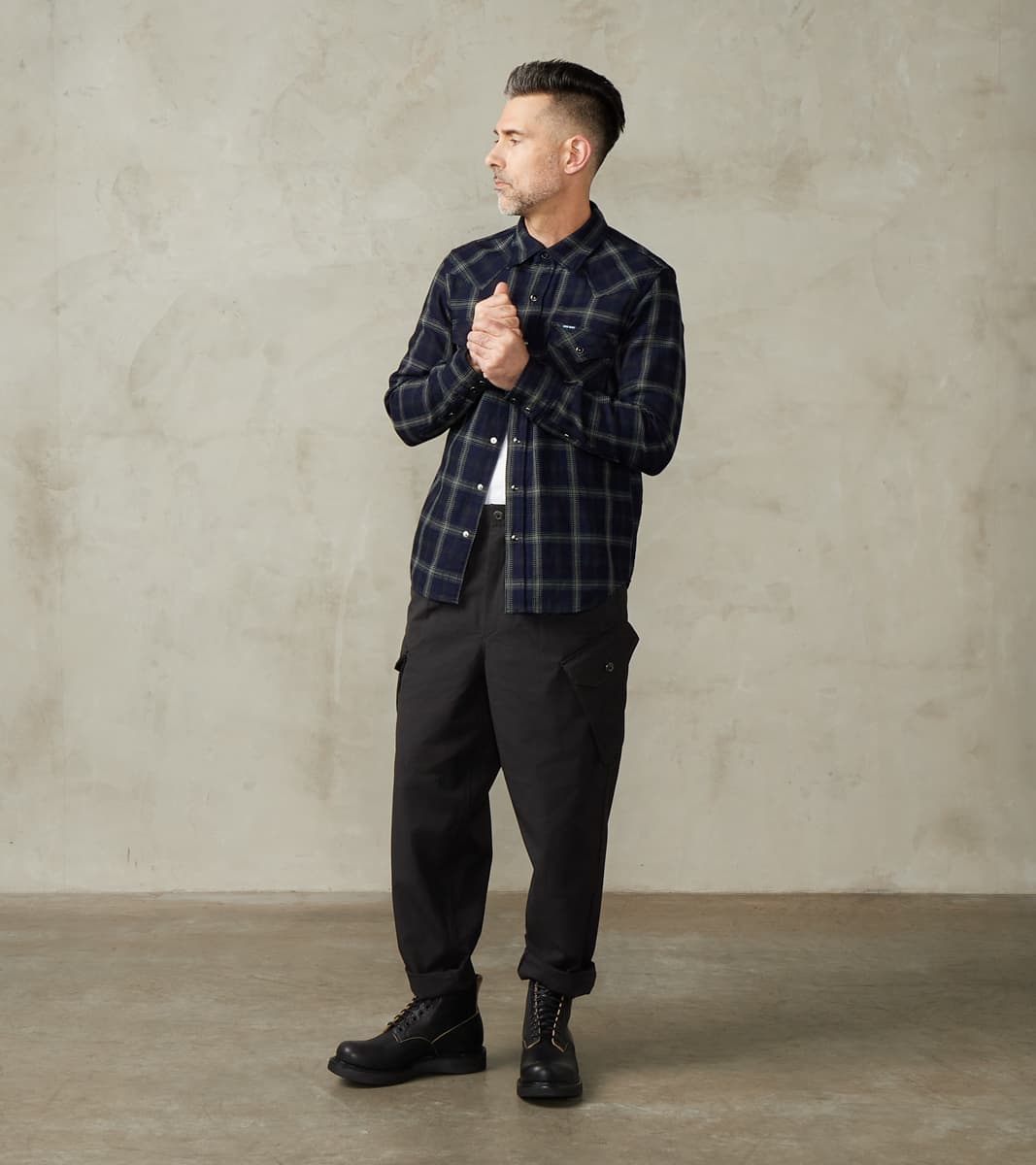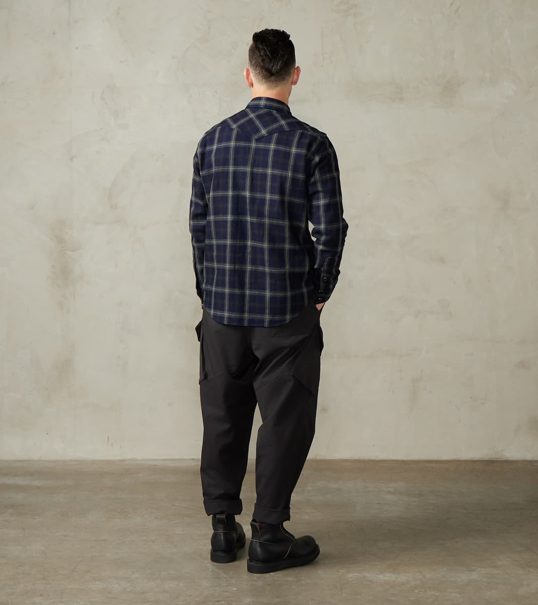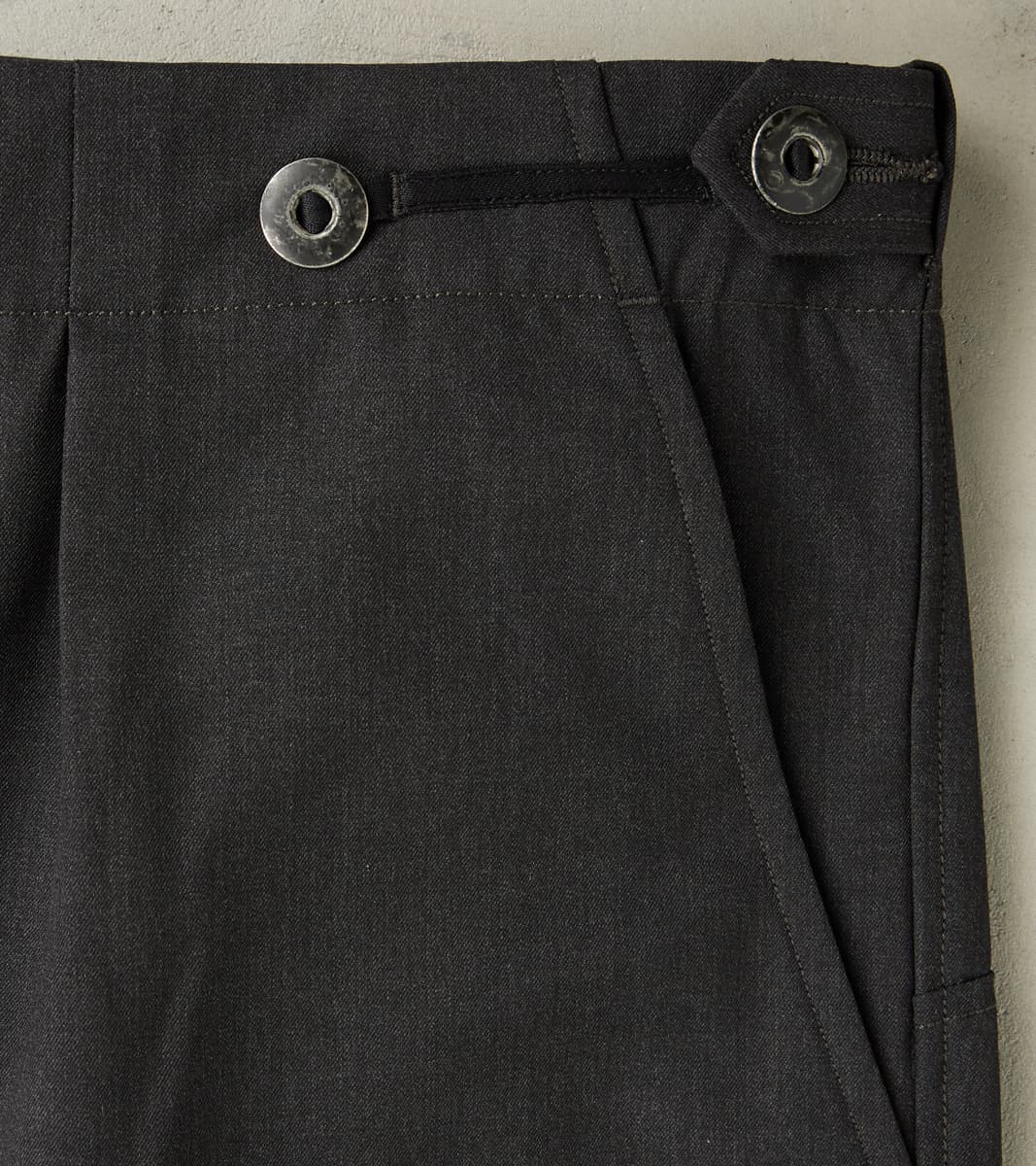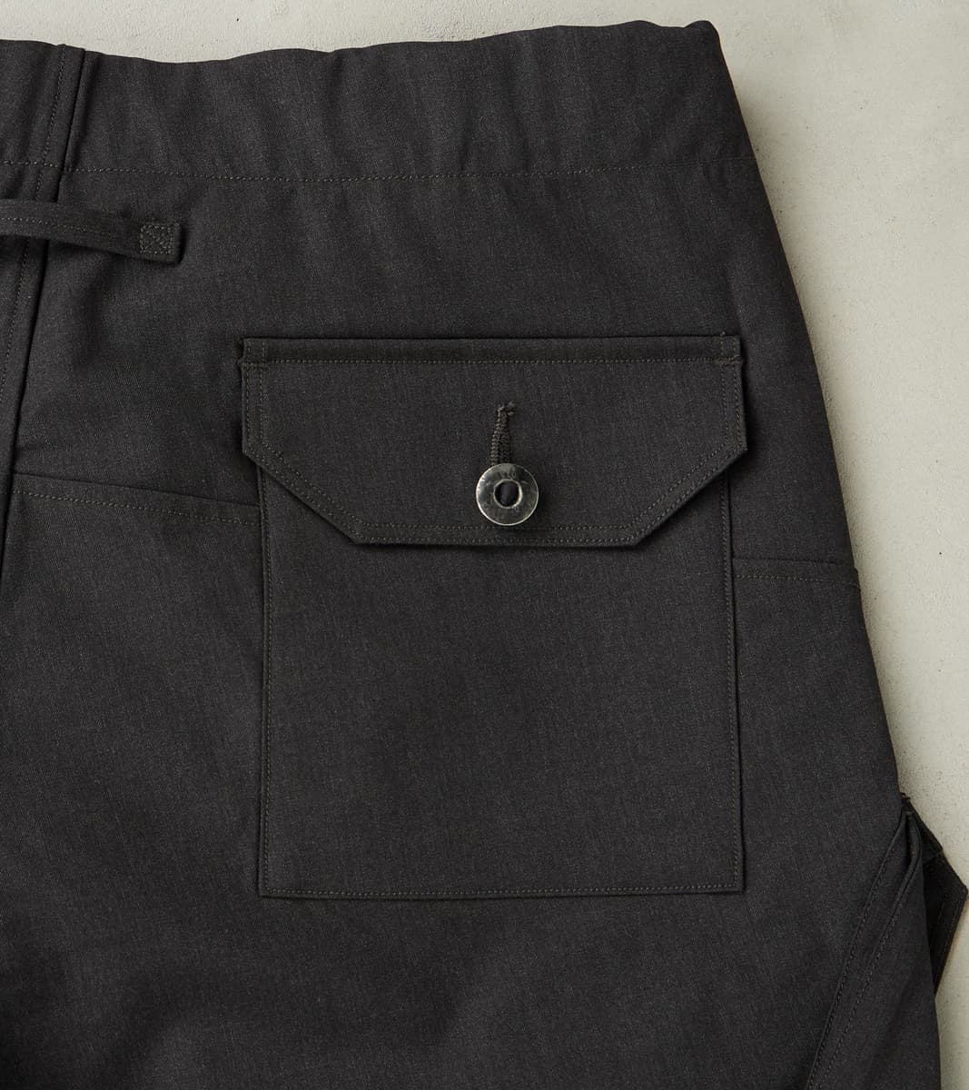 The Swiss Army Cargo Trouser by MotivMfg x Division Road is a high-rise, single-pleated pant with a roomy and relaxed top block and thigh that tapers to a moderate hem, offering a perfectly balanced, modern take on mid-20th century Swiss and German military and aeronautical utility pants, designed to be an inspirational piece in the Original Gentleman's wardrobe. This trouser is crafted from luxurious and technical Optim ™ Wool, developed and produced by Woolmark ®, which is a wind, wrinkle, and water-resistant suiting-grade woolen with a light all-season weight and a dense, structured drape, perfect for styling versatility while on reconnaissance in the city or trekking the outdoors. This 8 oz. Optim Wool Gabardine utilizes 100% Merino wool fibers that are stretched in spinning and shrunken in wet-finishing for a smooth twill weave that highlights and enhances the wool's natural weather resistance, breathability, temperature regulation, and durability. Paying homage to the original with sophisticated finishing, this trouser features a single pleat for an optimal fit with drape, an adjustable waistband with an ingenious tab button front, and a concealed elastic back, complete with a zipped fly and top button front. These Swiss Army Cargo Trousers are enhanced with a full lining and design-focused utilitarian pocketing, including gusseted and angled side cargo pockets, a patch back pocket with button closures, and slant front pockets for all the tools and accompaniments one needs. Finally, this pant is packed with superior bespoke and old-world detailing, such as an articulated back yoke and legs, cotton ripstop pocket bags and interior trim, felled seams, bartack reinforcements throughout, a finished tailor's hem for easy inseam alterations, and custom cast and burnished gunmetal buttons. MotivMfg has re-established a pattern-to-bespoke garment, one-roof workshop in Beijing with the ethos, processes, techniques, and materials of Savile Row to produce historically informed garments in styles and production methods lost by the West. We are honored to partner with MotivMfg to offer exclusive collaborations for a new and timeless uniform for the Division Road Army.