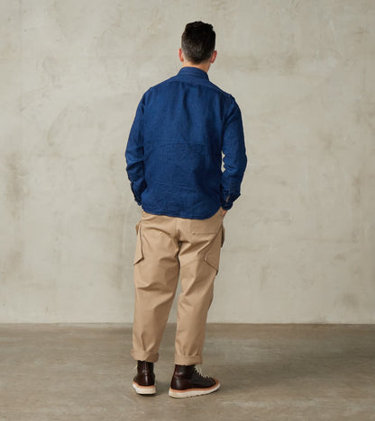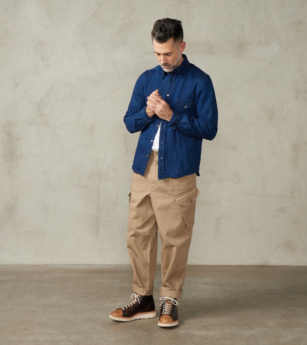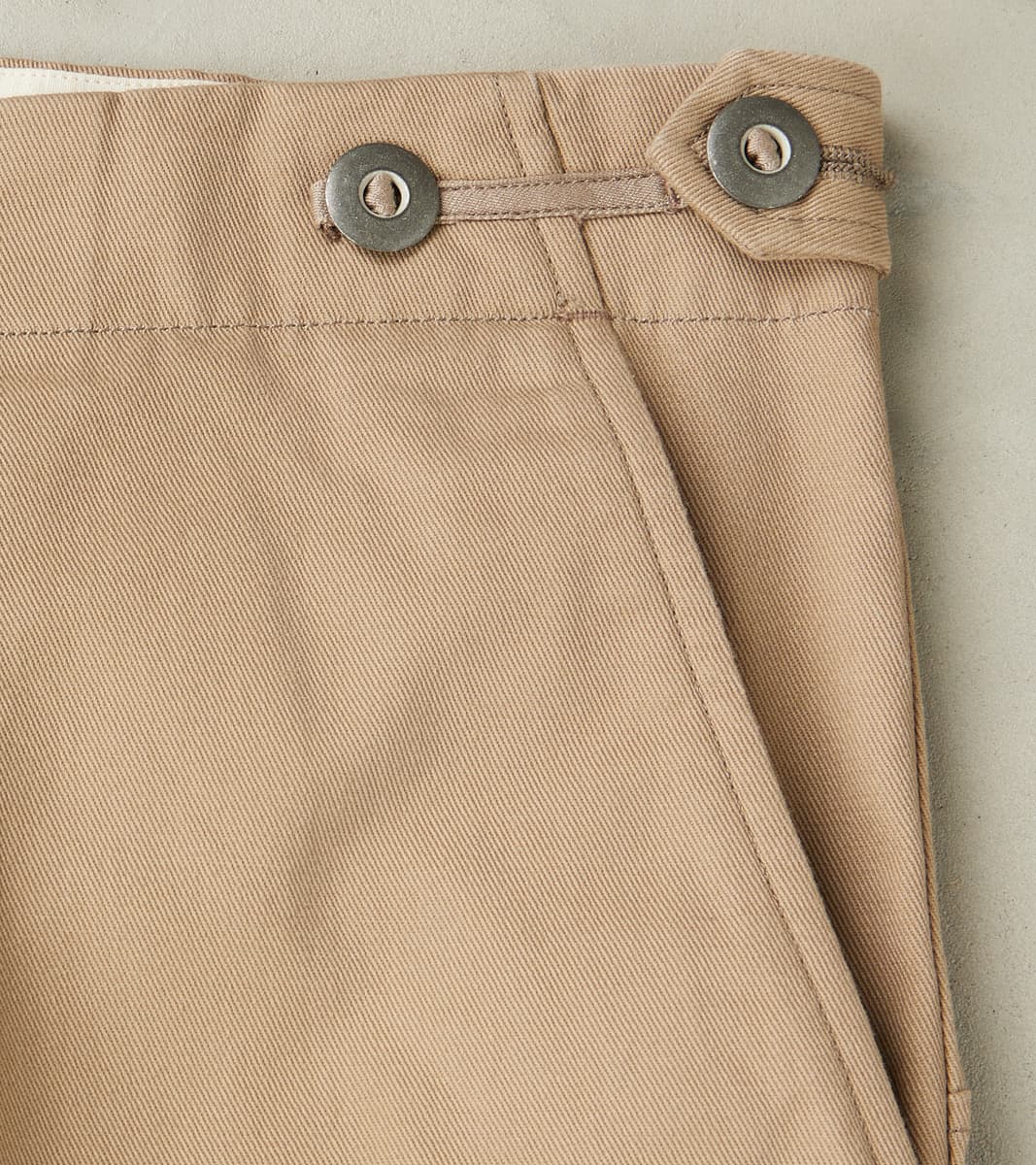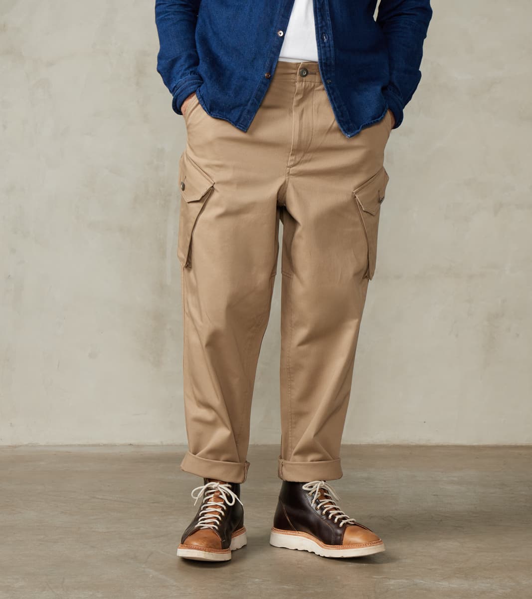 The Swiss Army Cargo Trouser by MotivMfg x Division Road is a high-rise, single-pleated pant with a roomy and relaxed top block and thigh that tapers to a moderate hem, offering a perfectly balanced, modern take on mid-20th century Swiss and German military and aeronautical utility pants, designed to be an inspirational piece in the Original Gentleman's wardrobe. This trouser is crafted from an evolved 10 oz. Japanese Military-spec High Density Twill using combed 100% Cotton yarns that have been mercerized for a clean finish, woven in the signature directional twill that yields a crisp and hearty, robust military-inspired cloth that balances the dutiful with the distinguished. Coming in a classic uniform chino Desert tan, this structured cotton cloth is perfect for styling versatility to transition effortlessly from dress to casual situations with a sense of luxury. Paying homage to the original with sophisticated finishing, this trouser features a single pleat for an optimal fit with drape, an adjustable waistband with an ingenious tab button front, and a concealed elastic back, complete with a zipped fly and top button front. These Swiss Army Cargo Trousers are enhanced with design-focused utilitarian pocketing, including gusseted and angled side cargo pockets, a patch back pocket with button closures, and slant front pockets for all the tools and accompaniments one needs. Finally, this pant is packed with superior bespoke and old-world detailing, such as an articulated back yoke and legs, cotton ripstop pocket bags and interior trim, felled seams, bartack reinforcements throughout, a finished tailor's hem for easy inseam alterations, and custom cast and brushed gunmetal buttons. MotivMfg has re-established a pattern-to-bespoke garment, one-roof workshop in Beijing with the ethos, processes, techniques, and materials of Savile Row to produce historically informed garments in styles and production methods lost by the West. We are honored to partner with MotivMfg to offer exclusive collaborations for a new and timeless uniform for the Division Road Army.