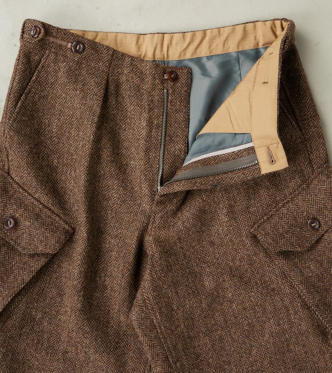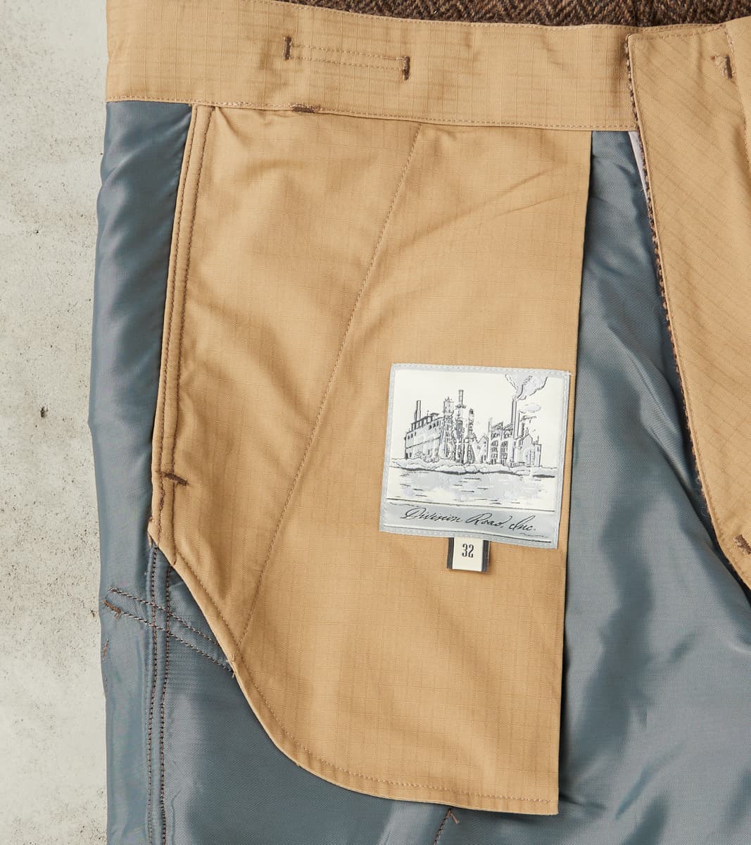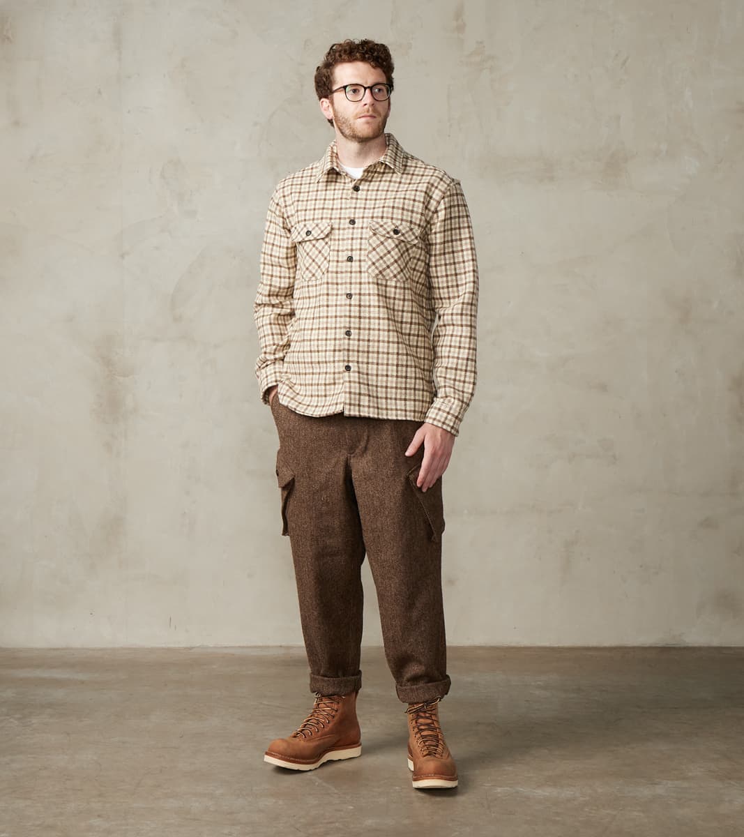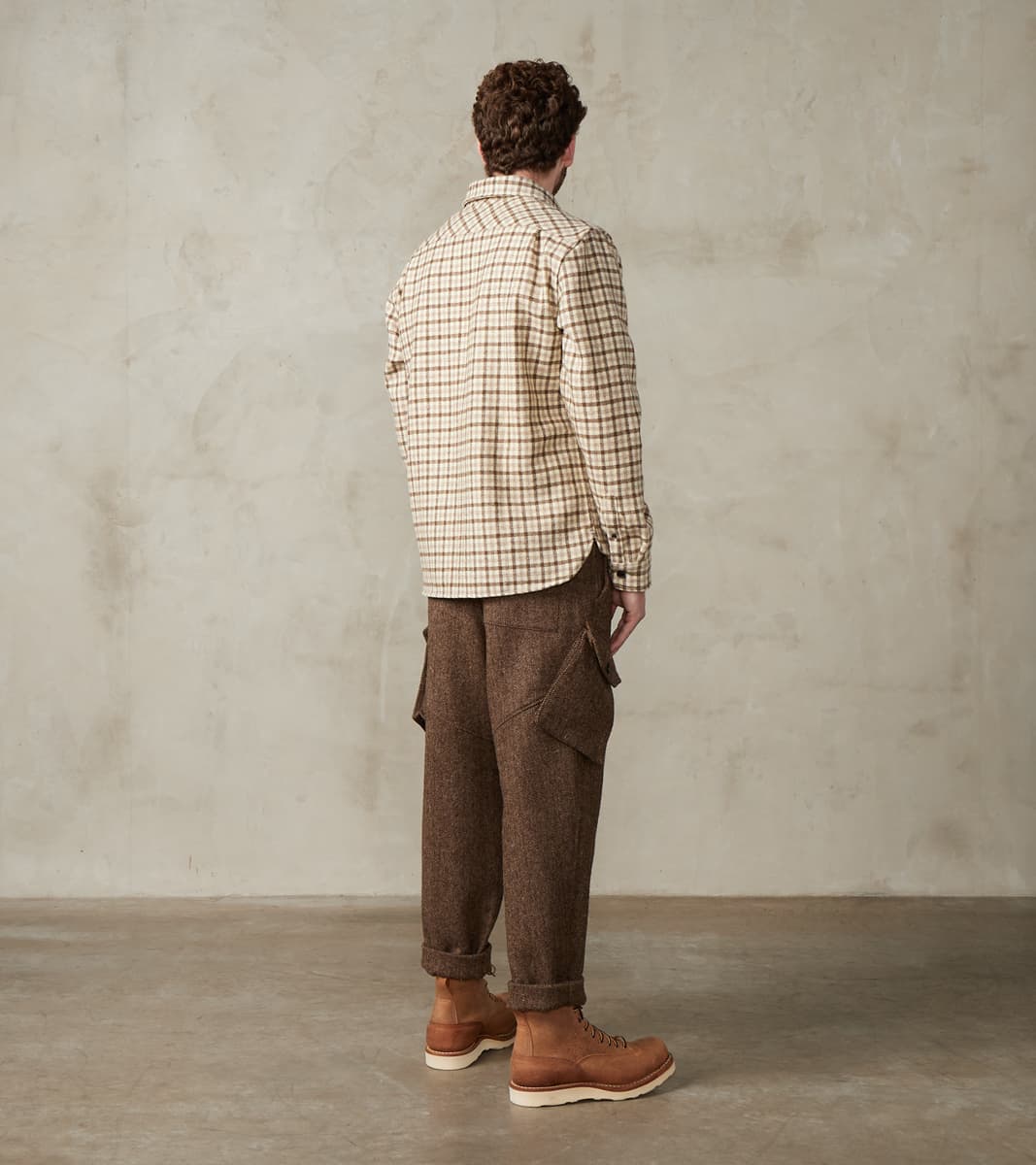 The Swiss Army Cargo Trouser by MotivMfg x Division Road is a high-rise, single-pleated pant with a roomy and relaxed top block and thigh that tapers to a moderate hem for a perfectly balanced, modern take on mid-20th century Swiss and German military and aeronautical utility pants, designed to be an inspirational piece in the Original Gentleman's wardrobe. This trouser is made in a medium-weight 14 oz. Herringbone woolen cloth produced entirely of undyed 100% British Wool from various sheep breeds for contrasting shades of brown and is woven into a traditional pattern. From one of England's oldest mills, dating to 1782, Marling & Evans®, this natural tweed woolen has a durable and pronounced texture while remaining chemical-free. It is minimally processed in a simple soap wash to retain the wool's natural oils for durability and a soft hand. It boasts a complex and defined pattern using shades of khaki, brown, and espresso for a luxurious, textured finish. Paying homage to the original with a refined aesthetic, this trouser is designed with a single pleat for an optimal fit with drape, featuring an adjustable waistband with an ingenious tab button front and concealed elastic back, completed with a zipped fly and top button front. These Swiss Army Cargo Trousers are enhanced with a full lining and design-focused utilitarian pocketing, including gusseted and angled side cargo pockets and a patch back pocket with button closures paired with slant front pockets for all the tools and accompaniments one needs. Finally, this pant is packed with superior bespoke and old-world detailing like an articulated back yoke and legs, cotton ripstop pocket bags and interior trim, felled seams, bartack reinforcements throughout, a tailor's hem for easy inseam alterations, and genuine horn buttons with a unique vintage finish. MotivMfg has re-established a pattern-to-bespoke garment, one-roof workshop in Beijing with the ethos, process, techniques, and materials of Savile Row to produce historically informed garments in styles and production methods lost by the West. We are honored to partner with MotivMfg to offer exclusive collaborations for a new and timeless uniform for the Division Road Army.