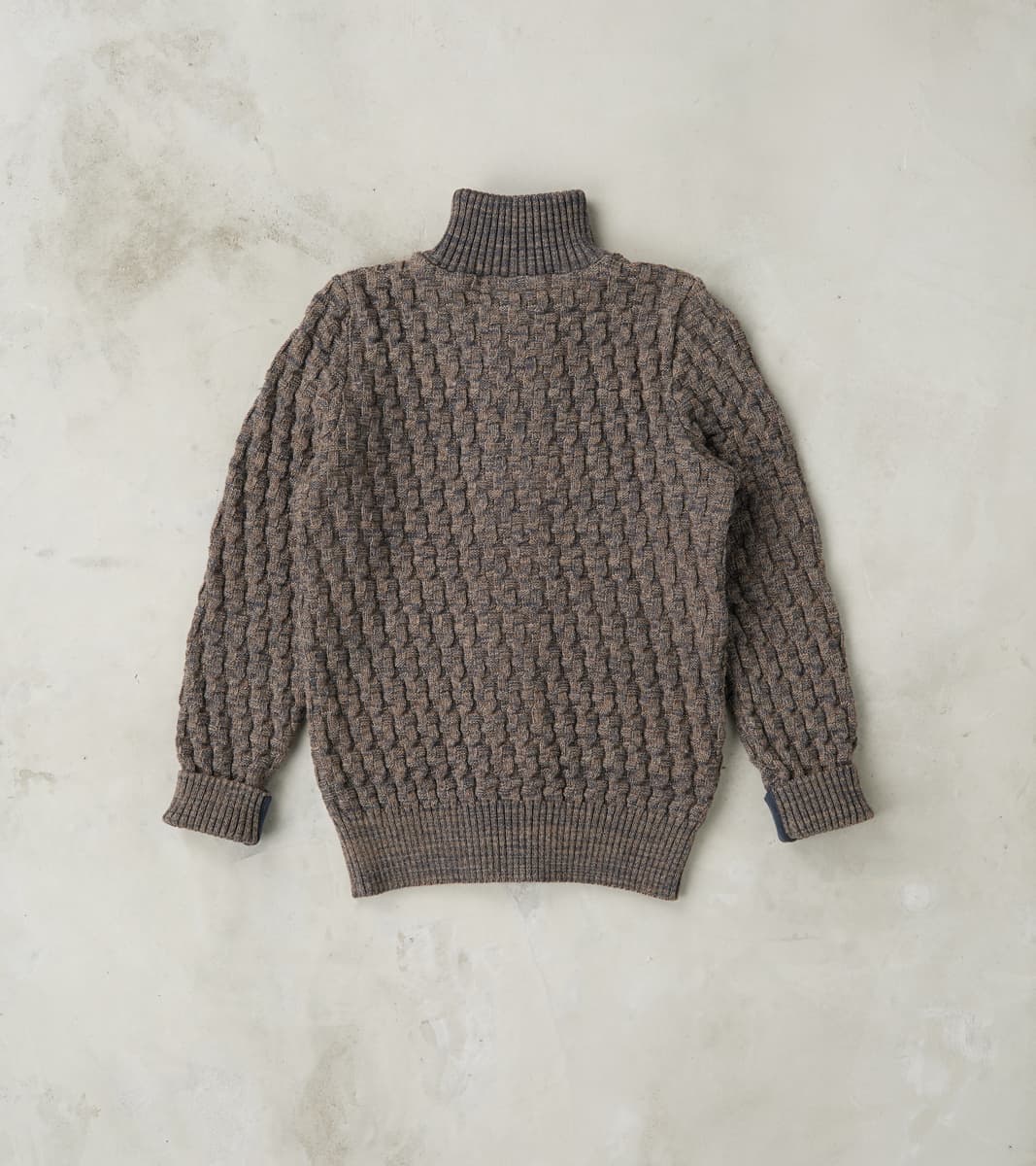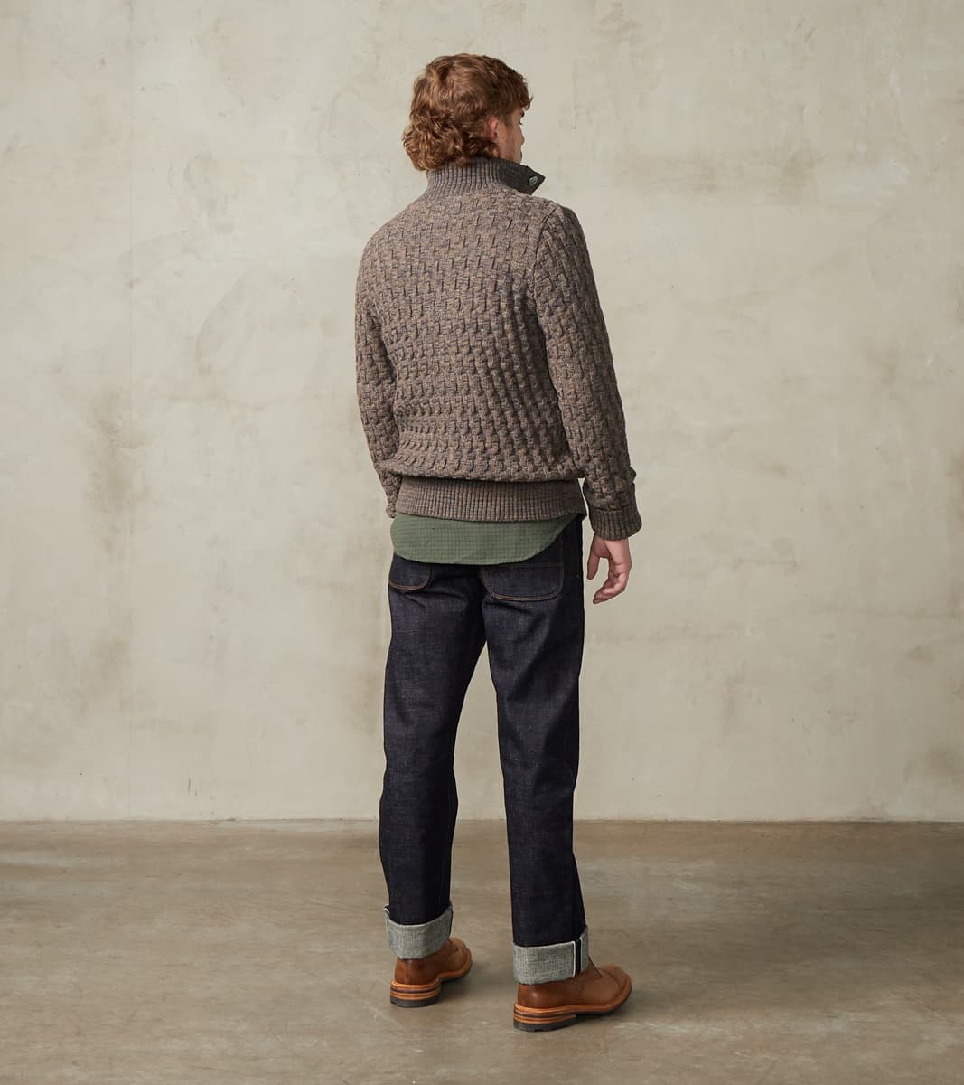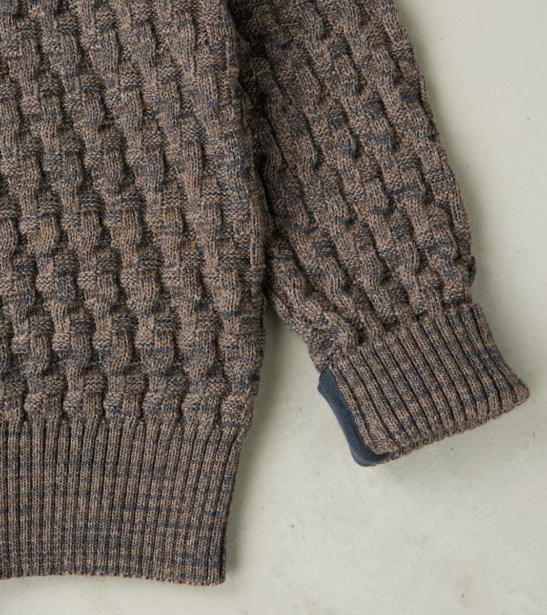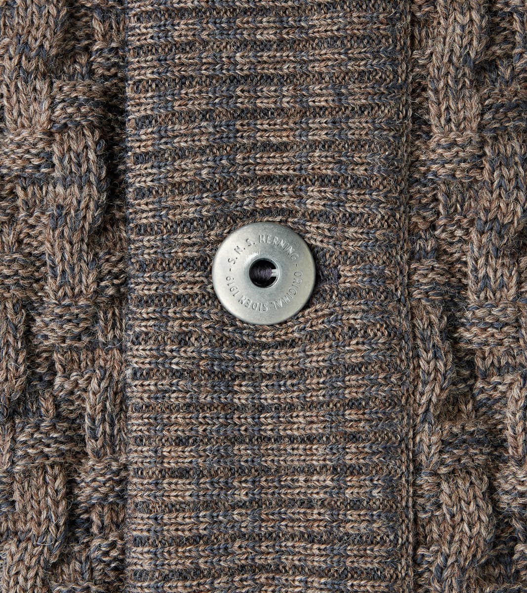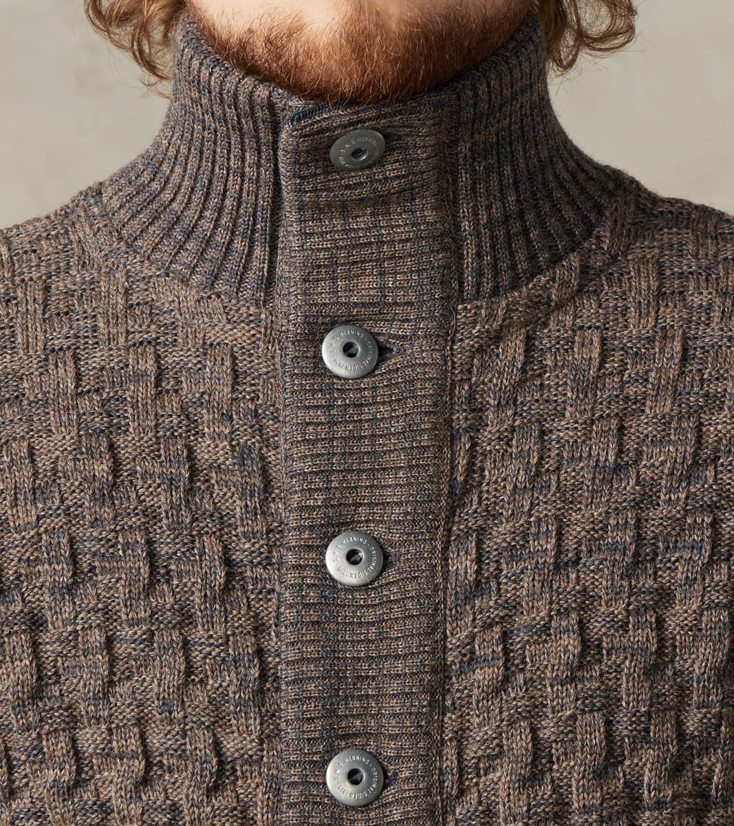 The Stark Cardigan in Terra Brown Melange by S.N.S. Herning is made in a 5-gauge multi-dimensional jacquard knit using undyed yarns of 100% Pure New Wool for a heavyweight sweater that bridges traditional heritage production and fashion aesthetics. Inspired by fisherman sweaters that S.N.S. Herning produced in the 1970s and using trademark knitwear techniques upon which the brand is founded, the Stark Cardigan provides durability, quality, and style for fall through spring. With a fashioned interior for clean and smooth comfort, the exterior has an architectural, three-dimensional box-weave waffle pattern throughout the body that transitions seamlessly into an oversized 2x1 ribbed stand collar, hem, and cuffs. The brand's signature pewter buttons are used on the front placket for a knitwear garment that shows its sophisticated production with the subtle touches of luxury. This nearly century-old, family-owned-and-operated producer uses traceable merino wool spun into durable, dense, and soft yarns, knitting machines that date back to the 1950s, and an inherited recipe of bobble knitting with engineered aesthetics to create timeless, quality garments made to last under all conditions. In a limited Terra Brown colorway that combines undyed yarns spun of grey, tan, and brown shears, this Stark Cardigan from S.N.S. Herning has a perfected modern fit for layering and various style profiles to become an historically based, fashion-forward staple in any well-curated wardrobe.