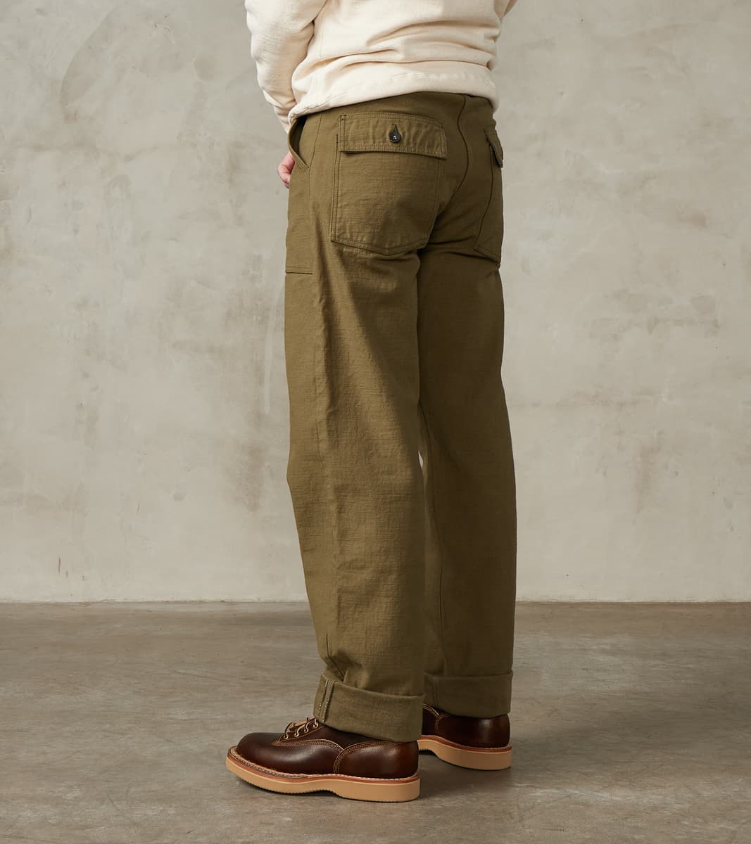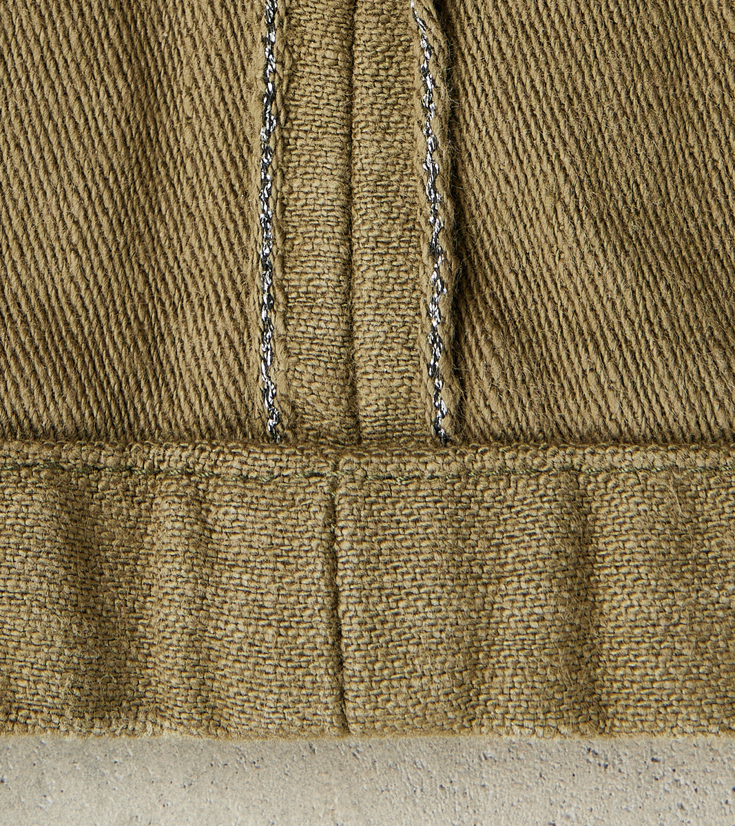 The Samurai SJ52BP Olive Selvedge Heavy Back Satin Canvas Baker Pant is a Regular Straight fit with a mid-high rise, roomy seat, and broad thigh that gently tapers through the leg to a wide hem. This cloth is made from a factory-washed and sun-dried unsanforized 15 oz. Japanese Military Satin Canvas that is produced exclusively for Samurai on vintage power shuttle looms that run at extremely low speeds and require hand operation. This process yields a lower-tension fabric, featuring an olive-dyed warp and weft with thick twisted #5 yarns that have a tough texture, flipped on the reverse back side reminiscent of vintage canvas, with irregularities that will soften quickly and develop a structured drape and natural fade patterns. Designed in Samurai's Regular Straight fit, this modern interpretation of a classic silhouette is tailored to comfortably suit all body types while forming a personalized fit over time. Assembled in a military-style trouser design, it features slash-front patch pockets and buttoned-flap patch back pockets, with specialty Samurai warrior iconography throughout, including a silver-lamé woven selvedge line, and a decorative pine-nut iron-cast and blackened button fly with selvedge detail on the interior placket. It is constructed with a chainstitched seat, a felled inseam and hem, and is reinforced with bartack stitching throughout. Representing one of the most collectible Japanese producers that continues to innovate through intensive old-world techniques, these Samurai chinos celebrate exclusive material developments, precise craftsmanship, and thoughtful design in every element, creating a unity between the garment and the wearer.