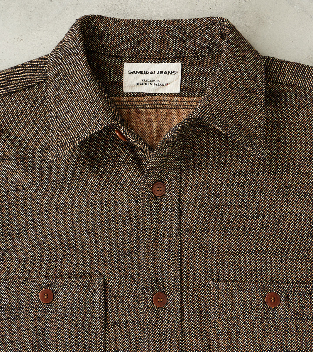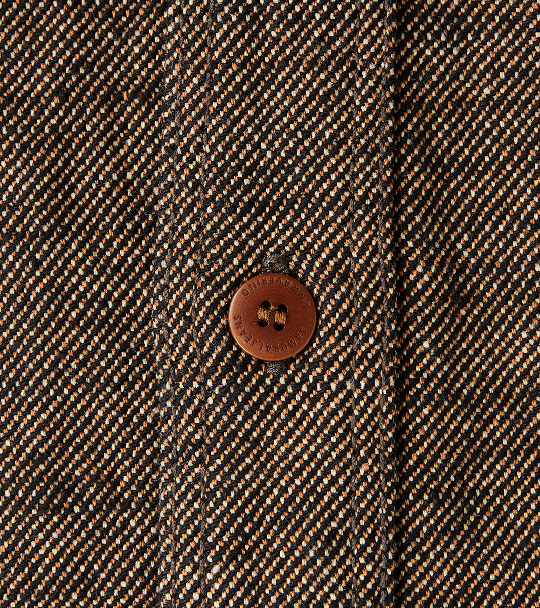The Samurai SMN25-01W Elemental Flannel Work Shirt in Black is a limited edition piece produced in an exclusive 14 oz. Japanese Plain-weave Flannel for a dutiful style-forward heritage collector’s item with patina potential. In a sophisticated cloth replicating serge woolens, this cotton canvas was developed in Niigata Prefecture using thick, twisted denim-weight yarns that are kinari rope-dyed in natural pigments of beige, ecru, chestnut, and charcoal then brushed on the interior to a soft, flexible flannel finish. This Samurai Shirt comes in the Westerners Cut with a classic fit for various body types and style profiles. This shirt features signature military basics elevated from vintage originals, including buttoned chest pockets, reinforced elbow patches, button barrel cuffs, and is finished with custom Japanese undyed nut buttons. The Elemental Flannel Work Shirt is completely chainstitched throughout, featuring a triple-stitched yoke and sleeves, and is bartack-reinforced for provenance and promised longevity. Representing one of the most collectible Japanese producers that continues to innovate through intensive old-world techniques, this Samurai celebrates exclusive material development, precise craftsmanship, and considered design through every element to create a unity of garment and wearer.