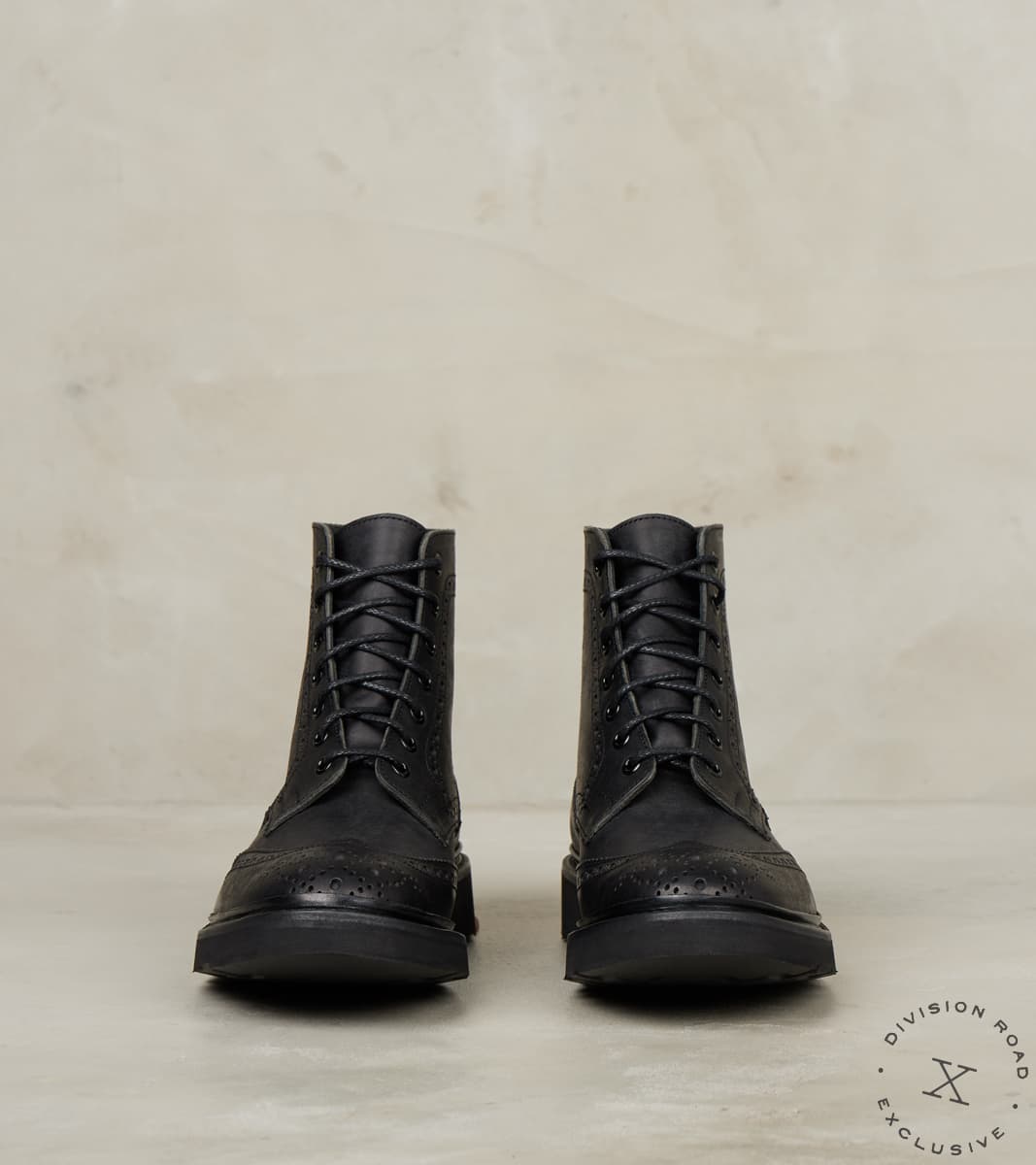 The Tricker's x Division Road Badalassi Nero Pueblo Stow Boot is an exclusive collaboration with the definitive maker of English Country footwear, using a premium Badalassi Carlo hard-wearing full-weight leather upper paired with a Vibram Morflex Christy sole. This Division Road exclusive style uses hand-selected cow shoulders with a clean and firm grain, which are vegetable-tanned in Italy by Badalassi Carlo Tannery. Their new enhanced recipe, Pueblo Vachetta, utilizes vegetable tannins and bark extracts for environmentally friendly tanning. It is a full-aniline, drum-dyed, and hand-stuffed leather with an exclusive Italian fat wax ingredient, which is then hand-glazed on the grain. This unique vegetable tannage is left in a natural crust state, allowing the waxes to self-burnish through wear, resulting in an unmatched, rich patina with tonal color changes as the finish evolves from the original matte to a semi-gloss in areas of wear. The Stow Boot is one of Tricker's original country boots, featuring the signature medallion and wingtip design with refined brogue and punching details throughout. All Tricker's undergo 260 individual steps in which craftspeople include a mulling concoction to infuse the uppers with oils, a wooden shank, a corking compound from a century-old recipe, and exquisite English finishing. This Stow's robust silhouette is achieved with the 4497s Last, creating a substantial yet elegant design that accommodates a variety of foot types. This results in a classic concrete-to-countryside-focused boot that combines country footwear build-quality with a modern form, made to the refined craftsmanship standards expected from a Tricker's. With a tonal configuration of black eyelets and a black leather storm welt atop a European-made Vibram Morflex Christy sole, this boot elevates a British classic to refined heights while serving as a solid base for any ensemble. As England's oldest shoemaker, Royal warrant holder, originator of the country boot, and one of the first and few still utilizing traditional Goodyear welting to the highest standards of quality in the industry, a Tricker's truly is made to last a lifetime in all conditions.