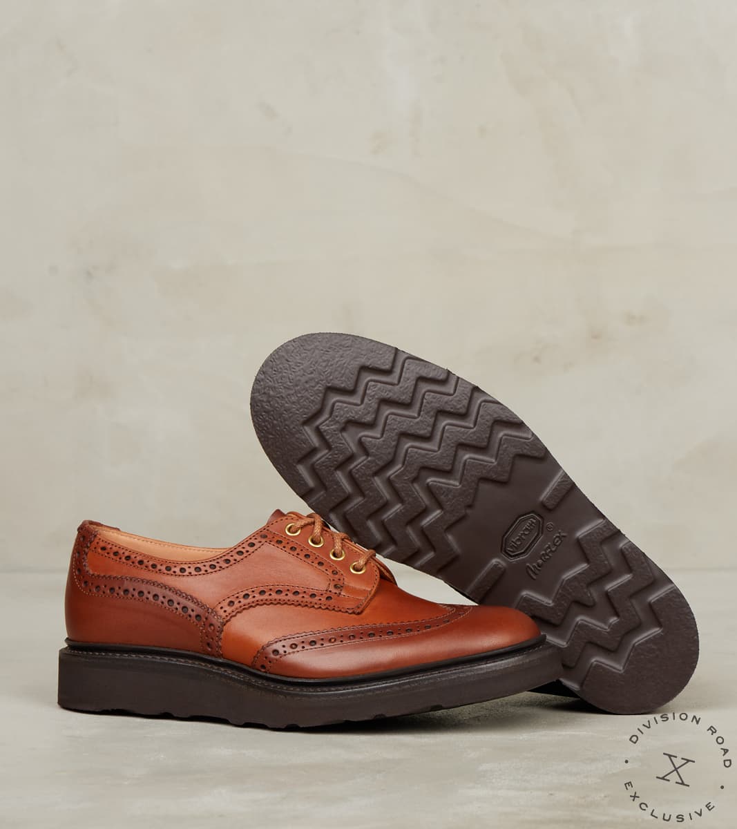 The Tricker's x Division Road Super Bourton Derby Shoe is an exclusive collaboration with the definitive maker of English Country footwear, using Tempesti's premium Ambra and Cuoio Elbamatt Liscio leather for the upper, paired with a Vibram Morflex Christy sole to create a new classic. This Division Road exclusive style features a two-tone design, with the wing and counter in Cuoio Elbamatt and Ambra Elbamatt on the vamp and quarter. One of their famous articles, Elbamatt Liscio, is vegetable tanned in Italy by Tempesti Tannery using hand-selected cow butts for a tight and pliable grain. Using a signature recipe of vegetable tannins in their trademark environmentally friendly processes, including aniline drum dyeing and hand stuffing with natural greases, the leather is left with a crust finish that preserves the unique character of the hides, allowing an unmatched, rich patina to develop. This tonal, natural, golden-brown veg-tan canvas has been hand-burnished at the Tricker's factory to replicate a fine antique that will improve with years of wear. The Bourton Derby is one of Tricker's original brogue derby shoes, featuring the signature wingtip design with refined brogue and punching details throughout. All Tricker's undergo 260 individual steps in which craftspeople include a mulling concoction to infuse the uppers with oils, a wooden shank, a corking compound from a century-old recipe, and exquisite English finishing. This Bourton Brogue Derby's more robust silhouette is achieved by using the 4497s Last, which creates a substantial yet elegant design that accommodates a variety of foot types. Completing the warm, tonal design are brass eyelets and a brown leather storm welt atop the featherweight, European-made brown Vibram Morflex Christy sole, creating a classic boardroom-to-blacktop-focused super shoe that combines hand-grade build quality with a modern streetwear form. As England's oldest shoemaker, Royal warrant holder, originator of the country boot, and one of the first and few still utilizing traditional Goodyear welting to the highest standards of quality in the industry, a Tricker's truly is made to last a lifetime in all conditions.