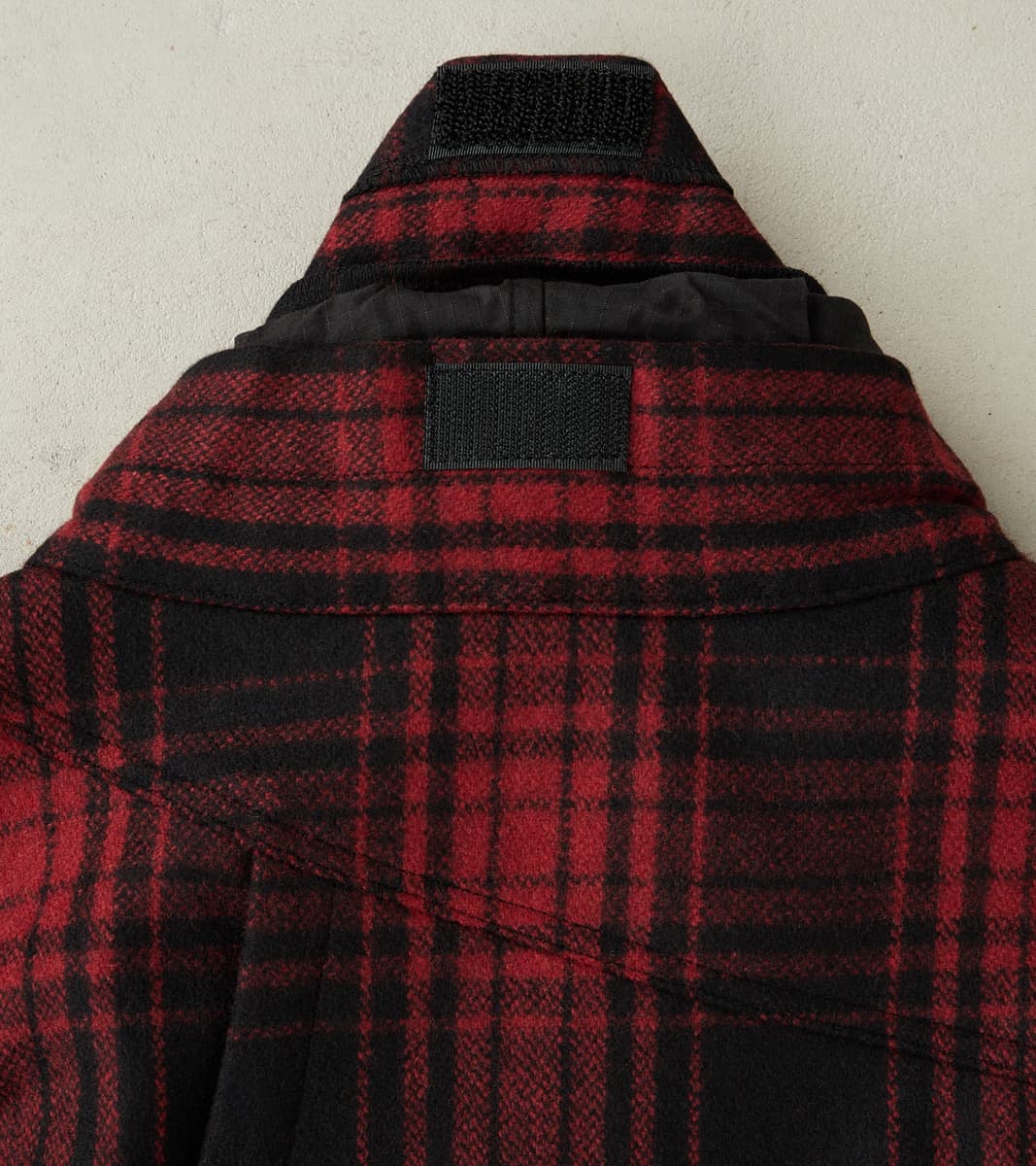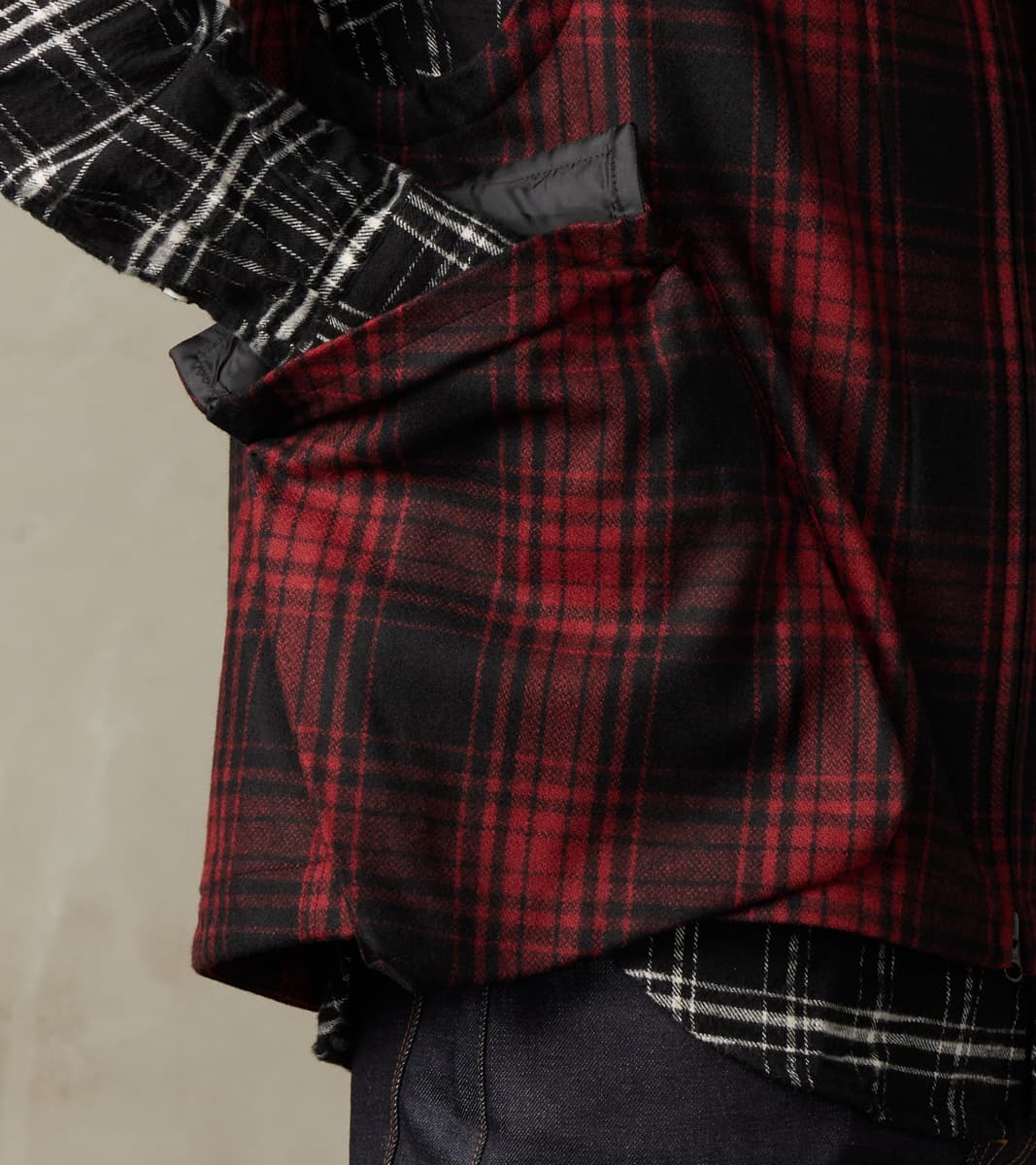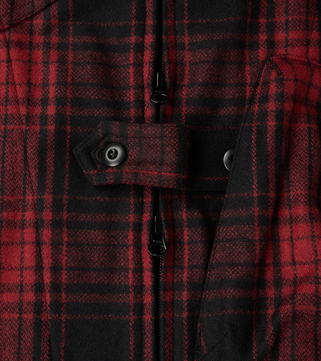 The Red Buffalo Plaid Wool Messenger Vest by ts(s) is inspired by outdoor excursion and utility vests for cyclists, using elements from technical and workwear garments in an anatomically designed fit. This vest is made in an exclusively developed 12 oz. Japanese Wool Blend using 85% Virgin Wool and 15% Nylon for durability, drape, and form. This woolen fabric is woven with dyed yarns to create a new iteration of a classic Buffalo Plaid, pattern-matched with precision. Designed and developed by Takuji Suzuki with an experimental approach to traditional menswear influences, this garment is crafted in Japan for the classic enthusiast seeking the avant-garde of heritage. The Messenger Vest is expertly darted and unlined for a perfected drape with evolved elements like a buttoned stand collar with a concealed cotton broadcloth hood, a two-way YKK zipped placket with buttoned tab closure, a unique bellow concealed zipped chest pocket and lower flap front patch cargo pockets, an enlarged back messenger pocket, and is finished with a banded placket, armholes, hem, and yoke with rolled seams throughout. The Red Buffalo Plaid Wool Messenger Vest will become that style-forward icon crafted with traditional quality and designed with ingenuity.