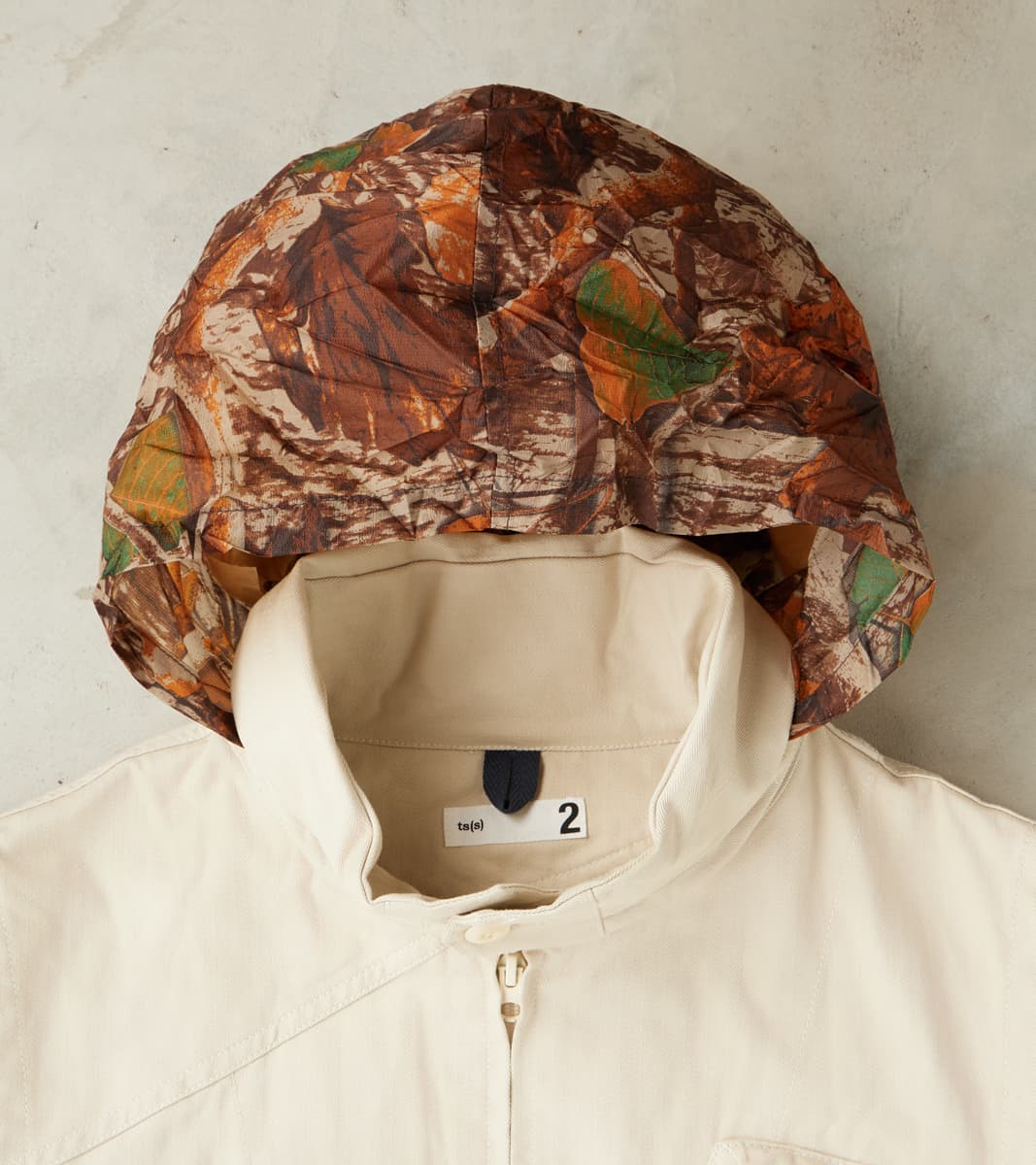 - Buttoned Stand Collar w/ Concealed Nylon Camouflage Hood