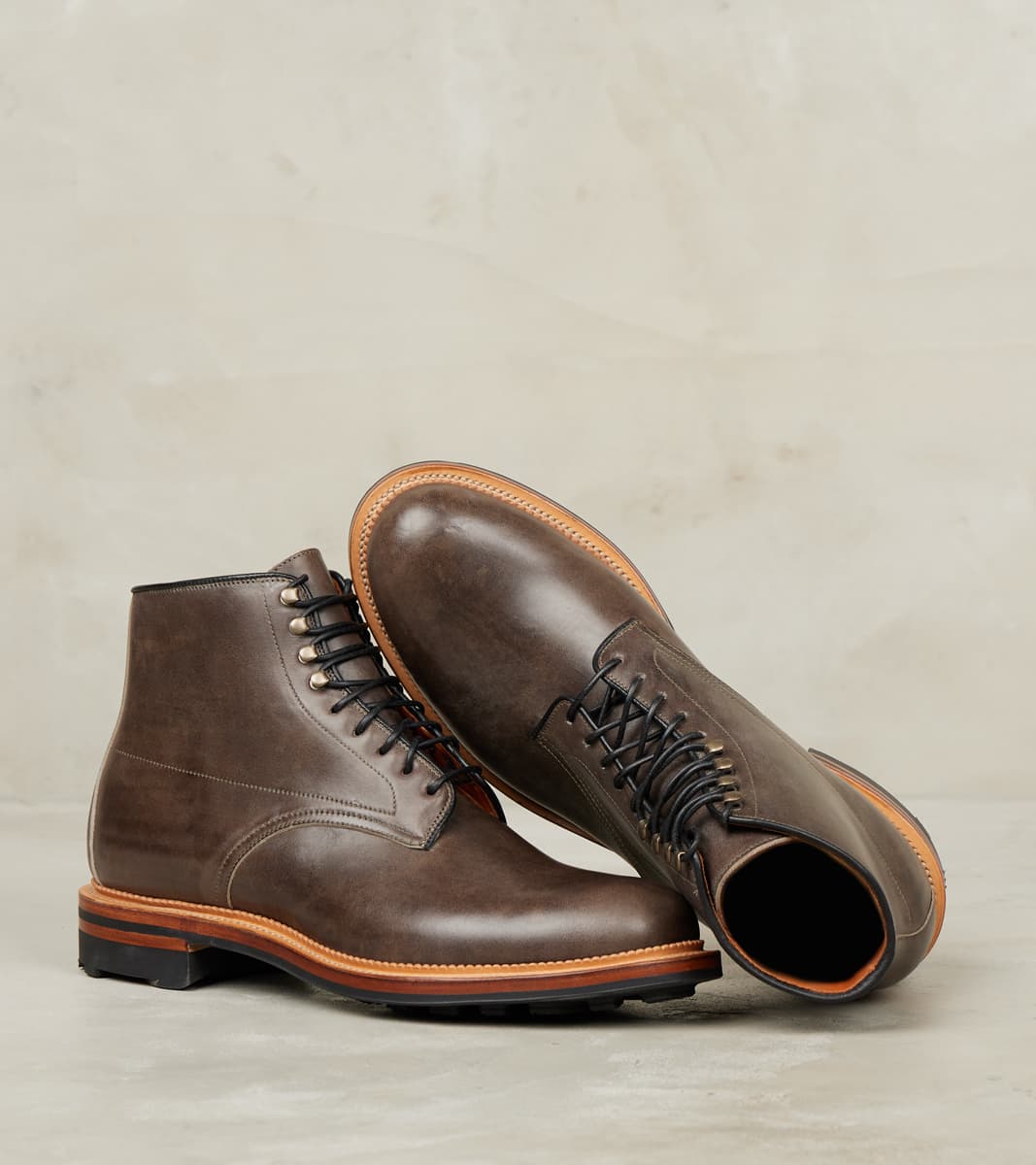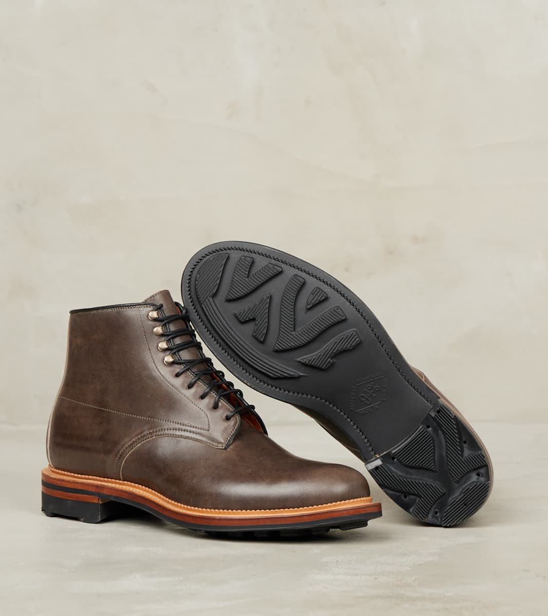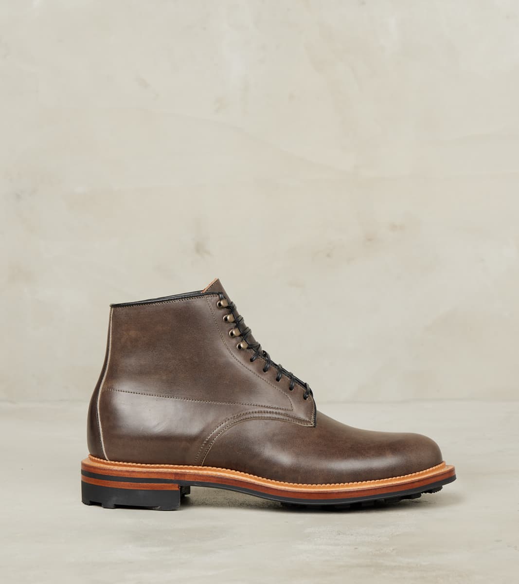 The Viberg Asphalt Vachetta Horsebutt Navvy Boot is inspired by derby boot patterns from the early 20th century when industrial shoemaking was at its peak in England and North America. This pattern is designed for effortless styling with a two-piece upper and a closed eyestay to quarter stitch for subtly enhanced detail on a cleanly configured, fully functional boot. This Viberg limited edition uses a small batch of Asphalt Horsebutt from Maryam Tannery that's vegetable-tanned to maintain the natural feel and unique grain character of the horsebutt hides. Heavily stuffed with vegetable tannins and drum dyed to a warm charcoal brown, this horsebutt will evolve with a rich, burnished patina that will correspond with any ensemble. The densely structured, full-weight horsebutt hides are kept as natural as possible and rolled with lanolin oil to enhance the subtle shell-like shine and promote flexibility and comfort. Molded on the Navy issue 1940 Last to provide an anatomical military-dress silhouette, this boot is fully lined with French Binding and complemented with blind eyelets and caramel speed hooks, a natural leather storm welt with a scalloped edge, and a natural leather midsole, all atop a British-made Ridgeway sole to provide lug traction in a discerning design with rugged applications. Setting the bar even higher, this boot leverages Goodyear welting using traditional techniques coupled with channeled insoles produced by Viberg's exacting craftspeople, resulting in a lifetime piece that will withstand the elements in a distinctive style and evolve for the modern-leaning and vintage-inspired alike.