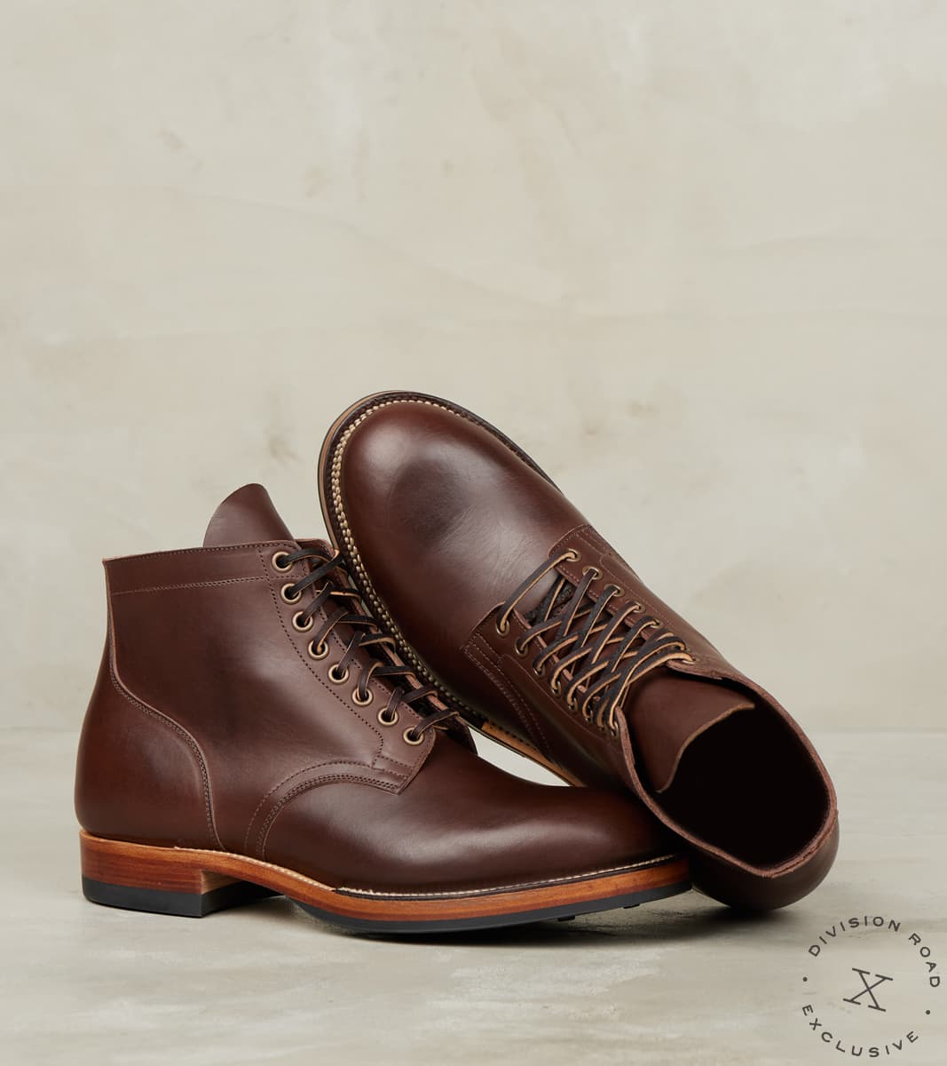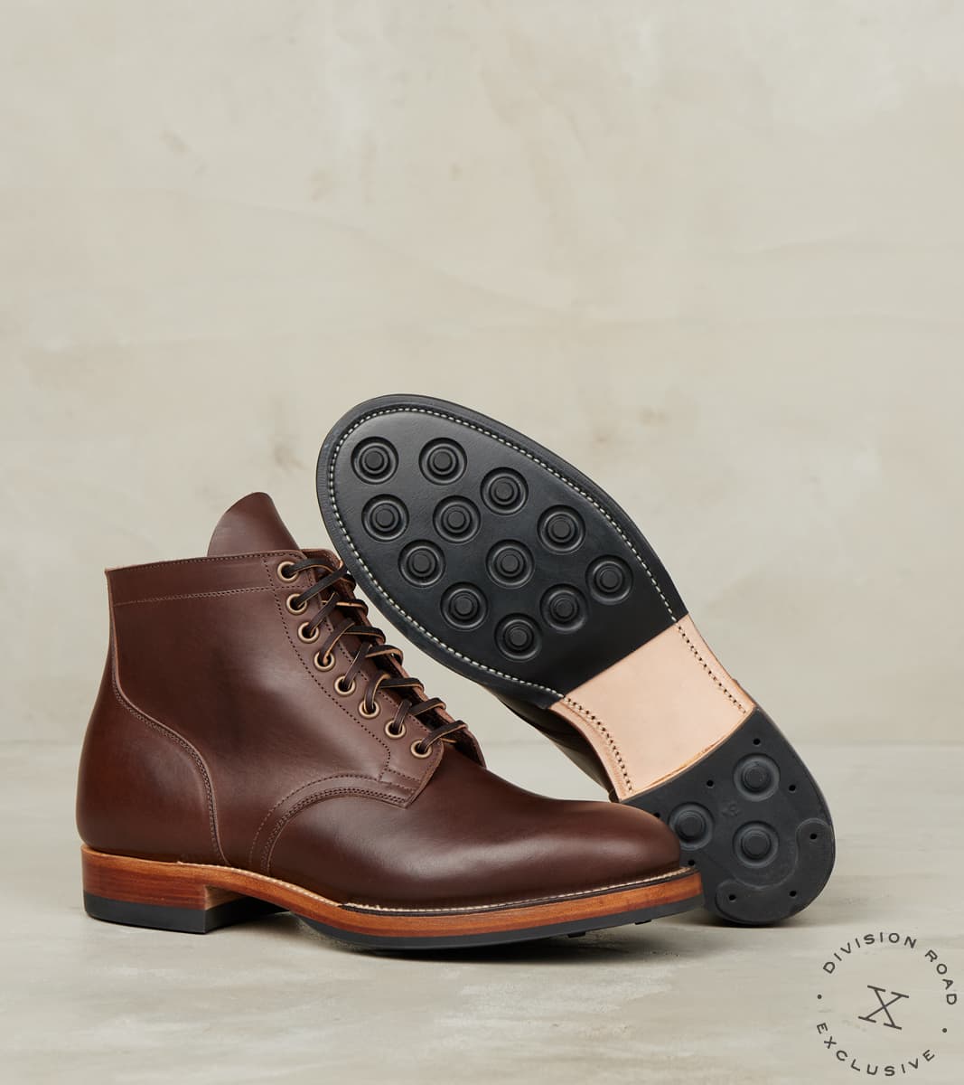 The Viberg x Division Road Badalassi Coffee Vachetta Minerva Service Boot is an updated version of Viberg's original work boot, designed by company founder Edwin Viberg in 1931 and inspired by a standard-issue military boot pattern used by several nations during WWII. This exclusive-to-Division Road Service Boot uses hand-selected double cow shoulders with a clean and firm grain, which are vegetable-tanned in Italy by Badalassi Carlo Tannery. Their signature premium recipe, Vachetta Minerva, uses vegetable tannins and bark for environmentally friendly tanning that is full aniline drum dyed and hand stuffed with an exclusive Italian fat wax ingredient that enhances the dutiful hides with a luxurious feel and allows an unmatched, rich patina to develop. Molded on the 2020 Last that grips and hooks with the anatomical shape of the foot to provide a comforting fit in a sleek dress-style silhouette, this boot is cleanly configured with a plain toe, caramel eyelets, and a natural leather midsole atop a British-made Split Dainite sole for wet and dry traction in an elegant design that's a functional heritage throwback. With each piece carefully assembled by exacting Viberg craftspeople using stitchdown construction, this is perfected footwear designed for those seeking a collectible Service Boot that will age and evolve uniquely to the wearer while remaining both timeless and indispensable within any vintage-inspired, modern wardrobe.