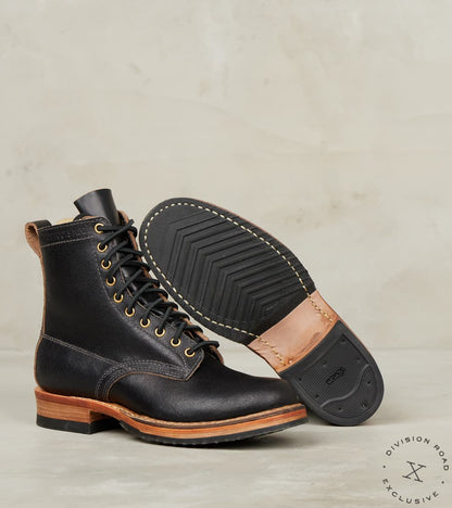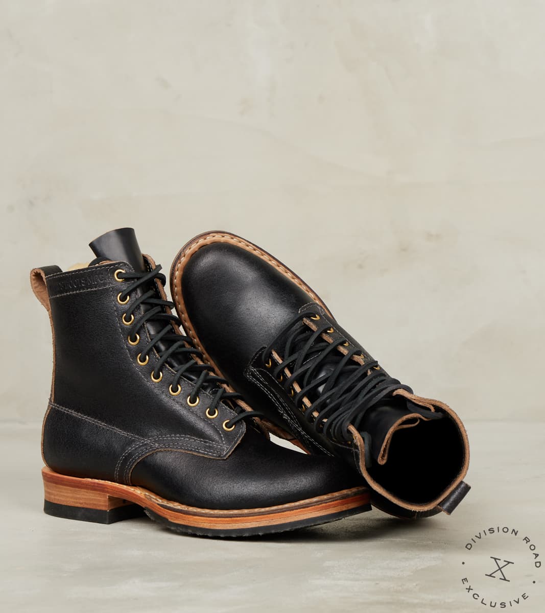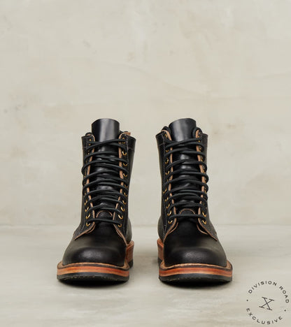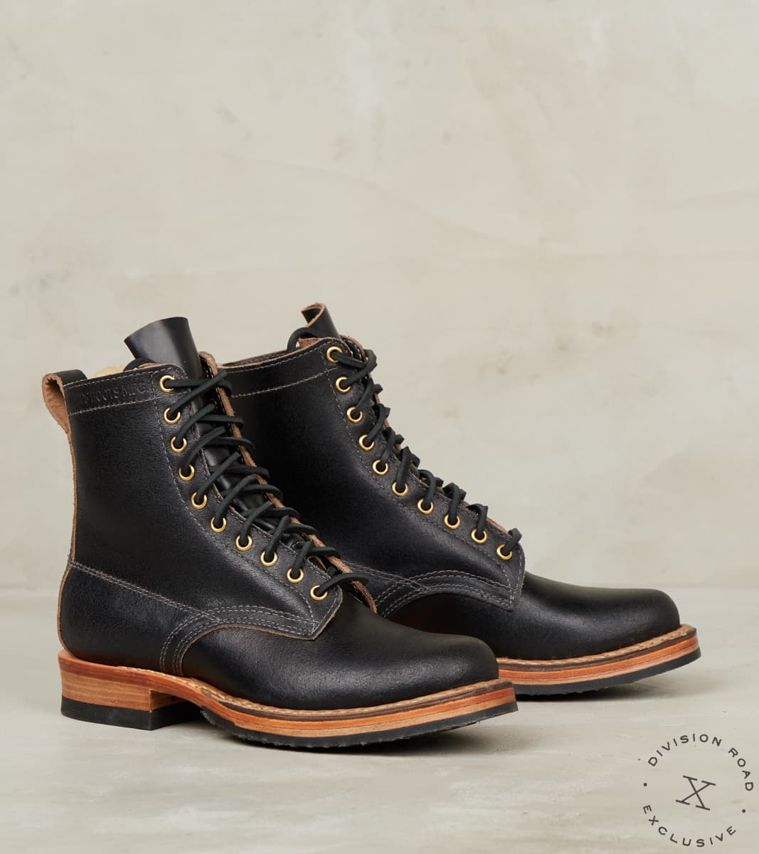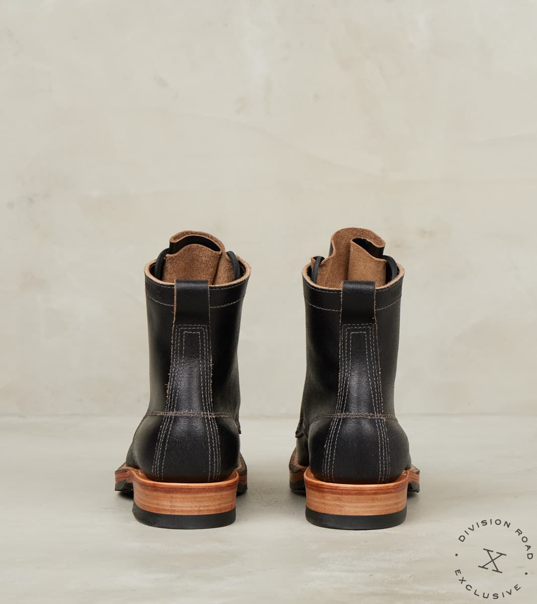 The White's x Division Road Black Waxed Flesh 375 Semi-Dress is a 7" exclusive pattern based on the original and shorter Depression-era boots worn by store clerks and factory workers that were designed to face the challenge of week-in, week-out wear required in the 1930s. This adapted, high Semi-Dress pattern features the signature quarter shape with a stitched-in counter and back stay, yet has been advanced with an integrated pull loop and added height to provide function and durability for the workshop or outdoors while remaining appropriate for daily duty in the modern world. These Division Road White's are characterized by the dutiful Black Waxed Flesh leather produced by Horween in a similar process to Chromexcel, though using a wax application during the tanning process on the roughout side of Natural CXL that yields a leather with water-resistant properties designed to patina by revealing the sand-colored nap of the flesh side over prolonged use. This boot is designed in collaboration with Master Shoemaker and now CEO, Eric Kinney, to honor the quintessentially Northwest stitchdown construction tradition. It features White's unique hand-sewn and all-leather builds, complemented by our functional design approach that preserves the original craftsmanship, history, and lifetime durability with a fresh perspective. This high Semi-Dress uses the popular Arch-Ease 55 Last, known for providing trademark support with a more approachable break-in and having an elegantly classic, round toe shape with an accommodating forefoot and moderate profile that matches a wide variety of feet. We exclusively enhanced White's hand-sewn welted methods with a tonally corresponding Natural CXL welt to match the natural finished leather midsole and block-logger heel with a slight sculpt that emphasizes their unique approach to making lifetime work boots. A multi-paneled upper allows for comprehensive rebuilds, and the low-profiled Half Comp split sole configuration provides high traction and longevity in various terrains, combined with a single-row hand-sewn stitchdown to allow for greater flexibility, comfort, and a clean aesthetic for the long haul. Finally, this exclusive Semi-Dress comes with an outdoor-purposed, Black CXL fully gusseted tongue for the rugged and is refined with brass eyelets and a leather pull loop, finished with a custom White's collar stamp and WB x DR collaboration insole stamp. Made as a hallmark of White's unaltered, hand-sewn traditions and customized to Division Road specifications, this 375 Semi-Dress features a polished aesthetic for urban environments, built for all outdoor conditions.